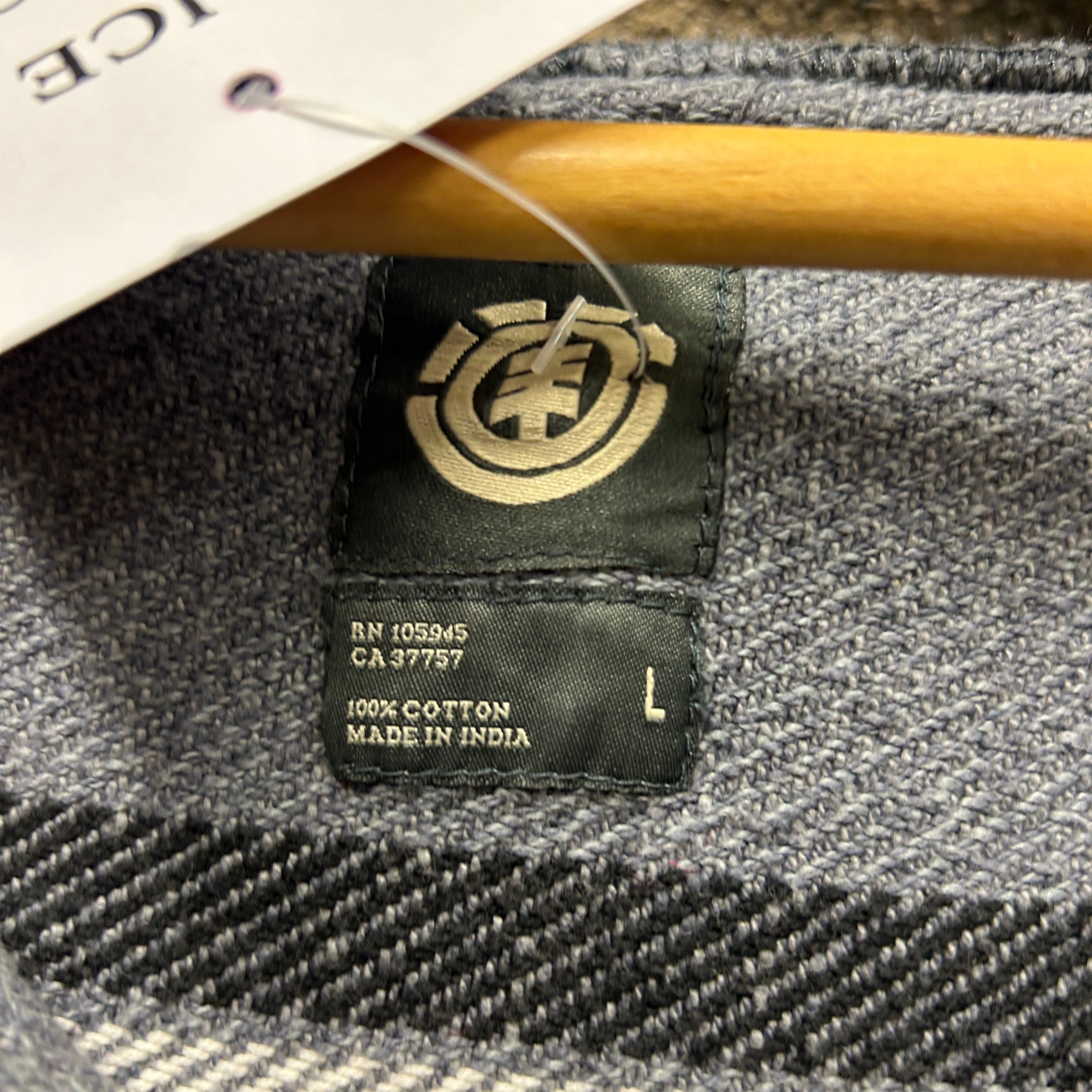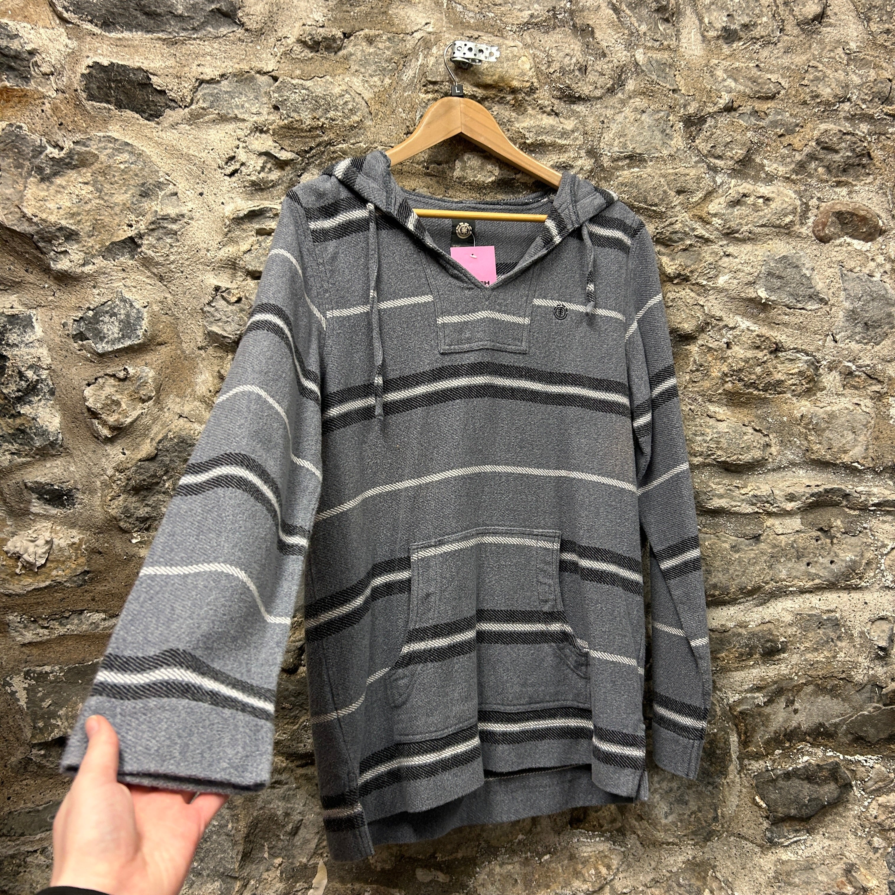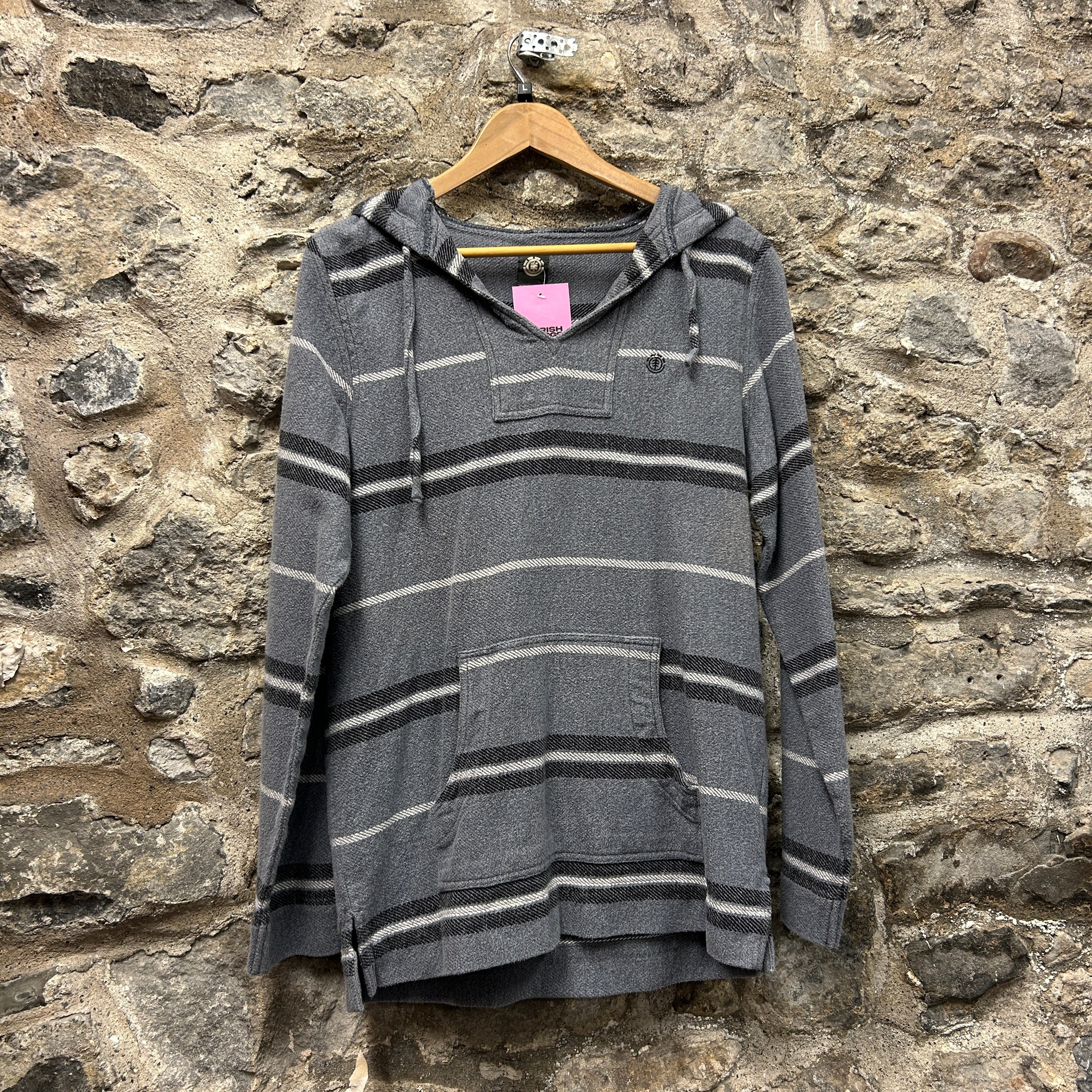 Product details: Grey pullover Baja-style hoodie with horizontal black and white stripe pattern, woven cotton feel, drawstring hood, V-notch neckline with small button detail at chest, kangaroo pocket, and small side hem slits. Brand: Element.| Label Size | |