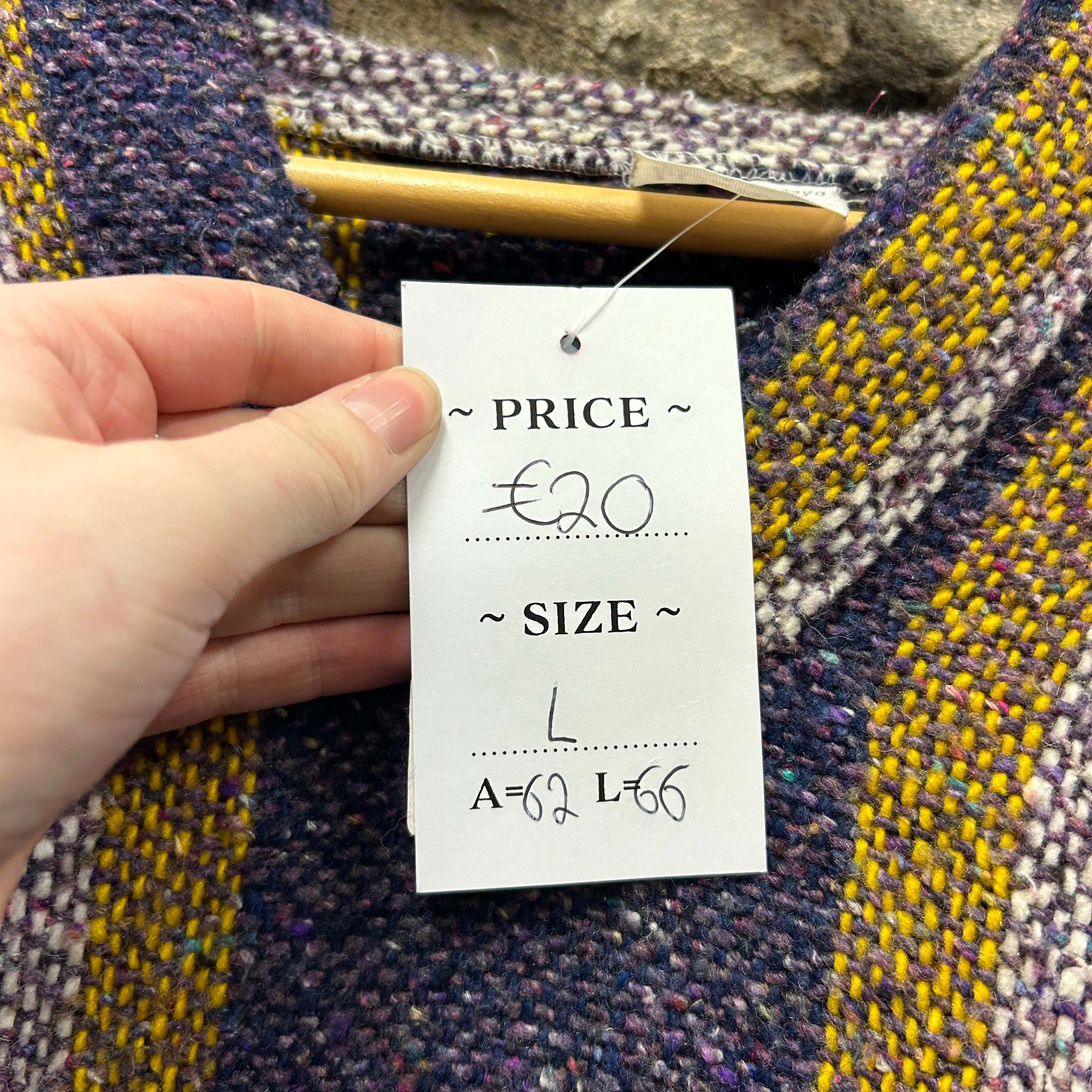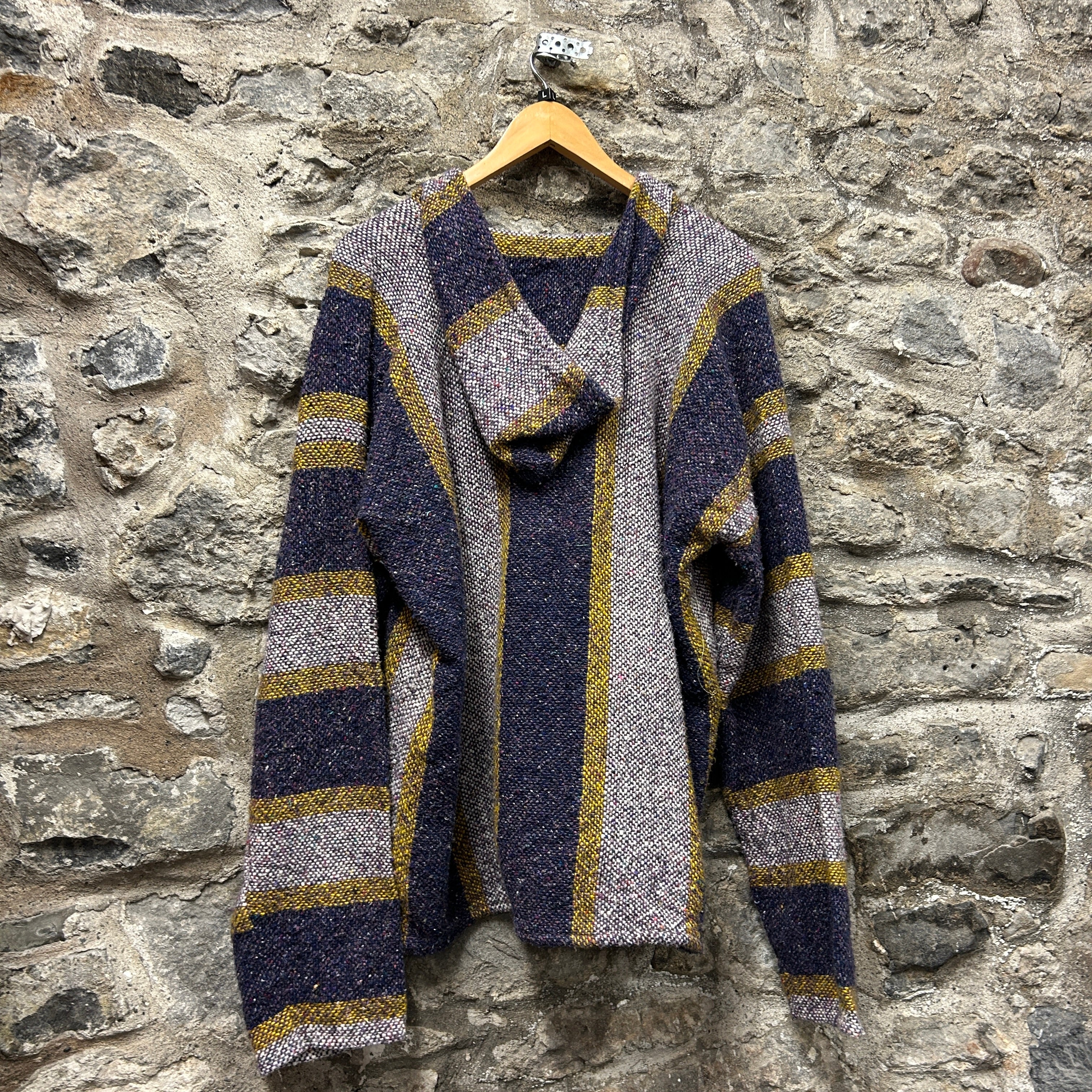 Product details: Mexican baja hoodie with attached hood and roomy kangaroo pocket. Chunky woven acrylic fabric with a salt-and-pepper base and multicolour nep speckling; bold vertical and horizontal stripe pattern in navy, grey and mustard yellow. V-notch neckline with no drawcords; relaxed, boxy fit with long sleeves. Brand: Artesanías Mayo.| Label Size | |