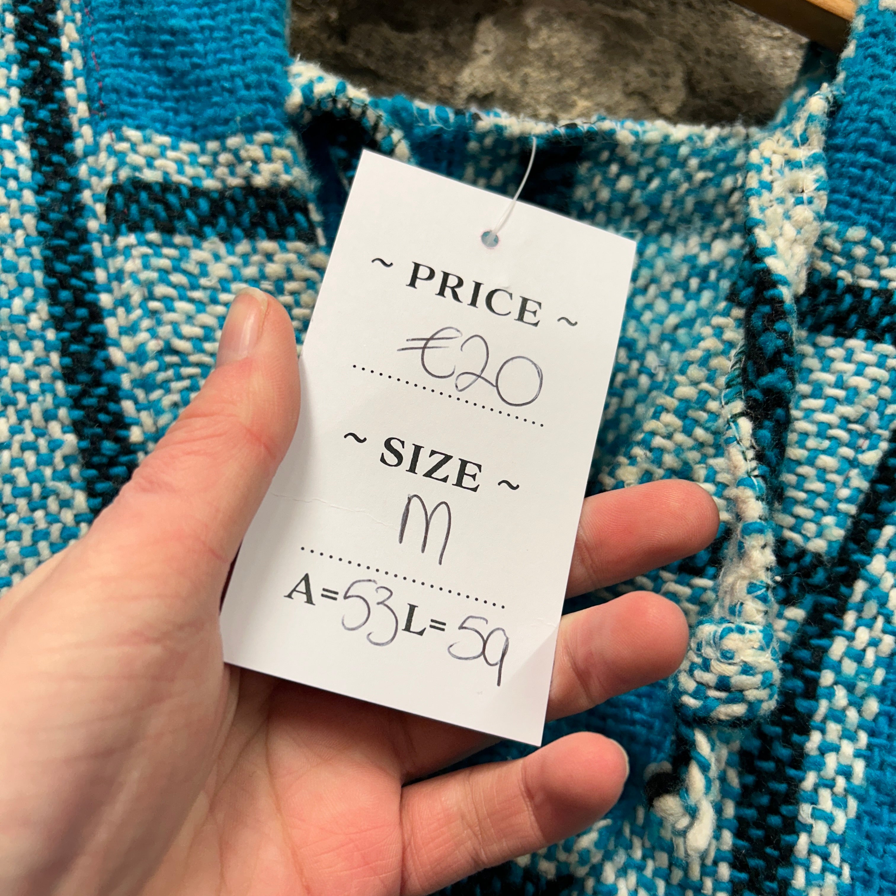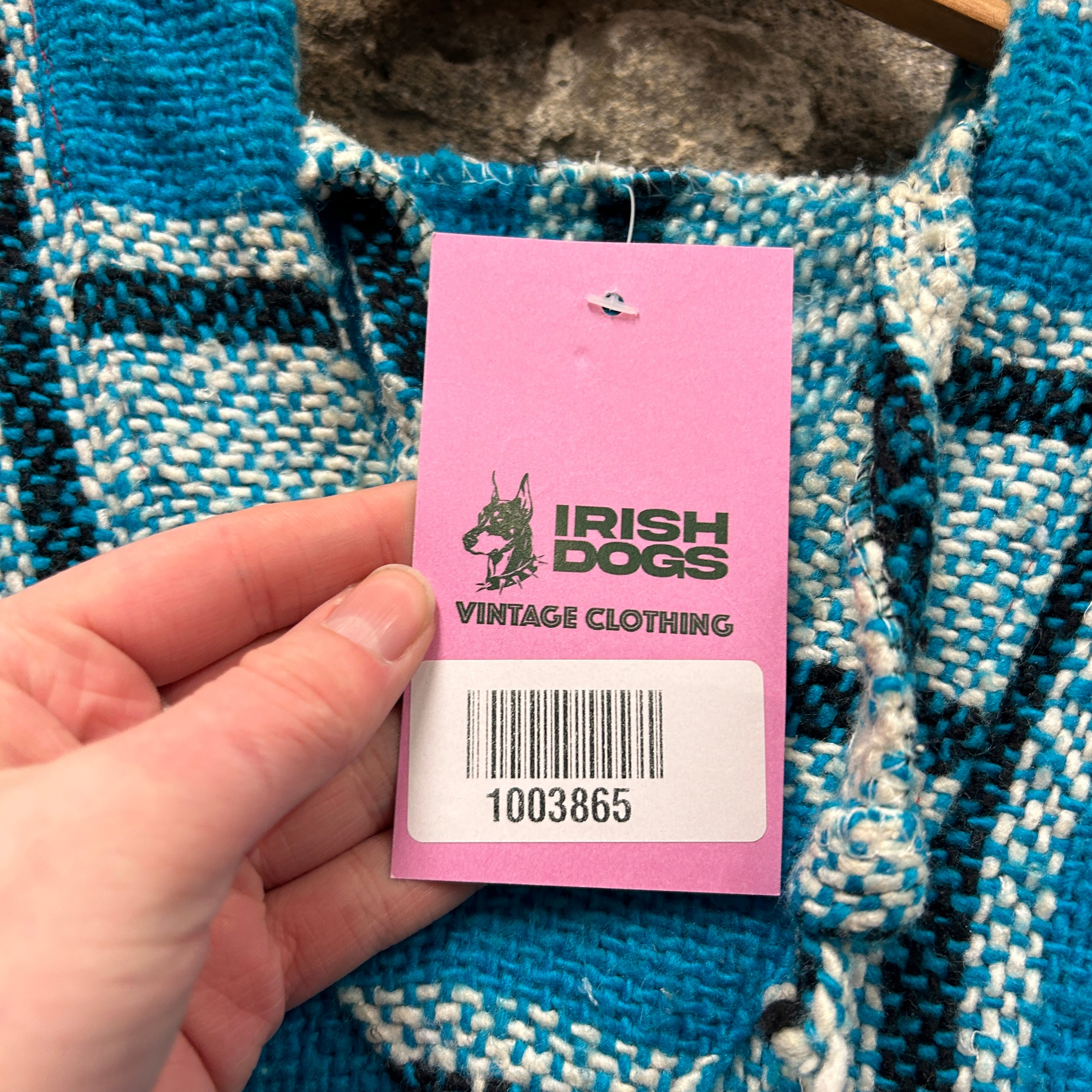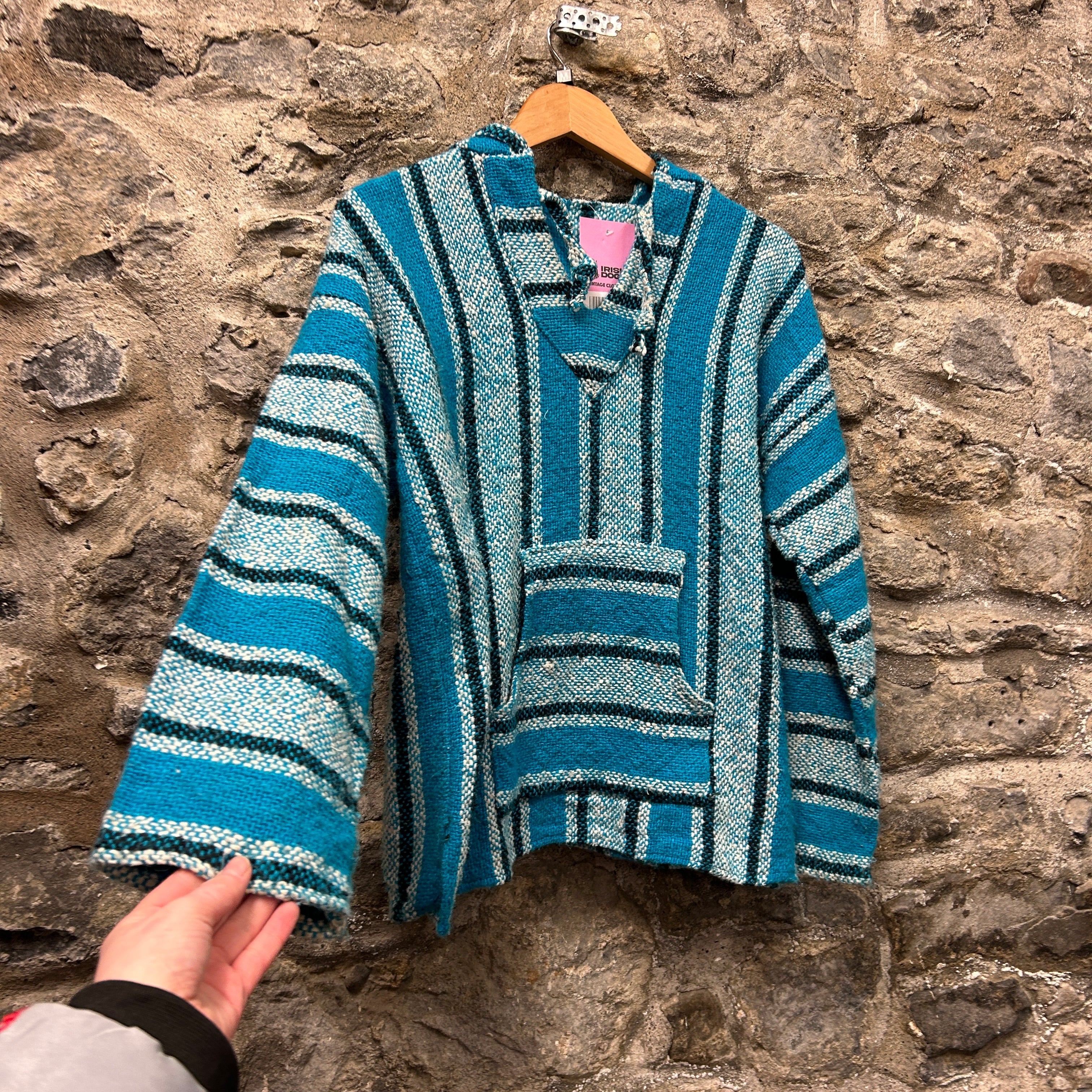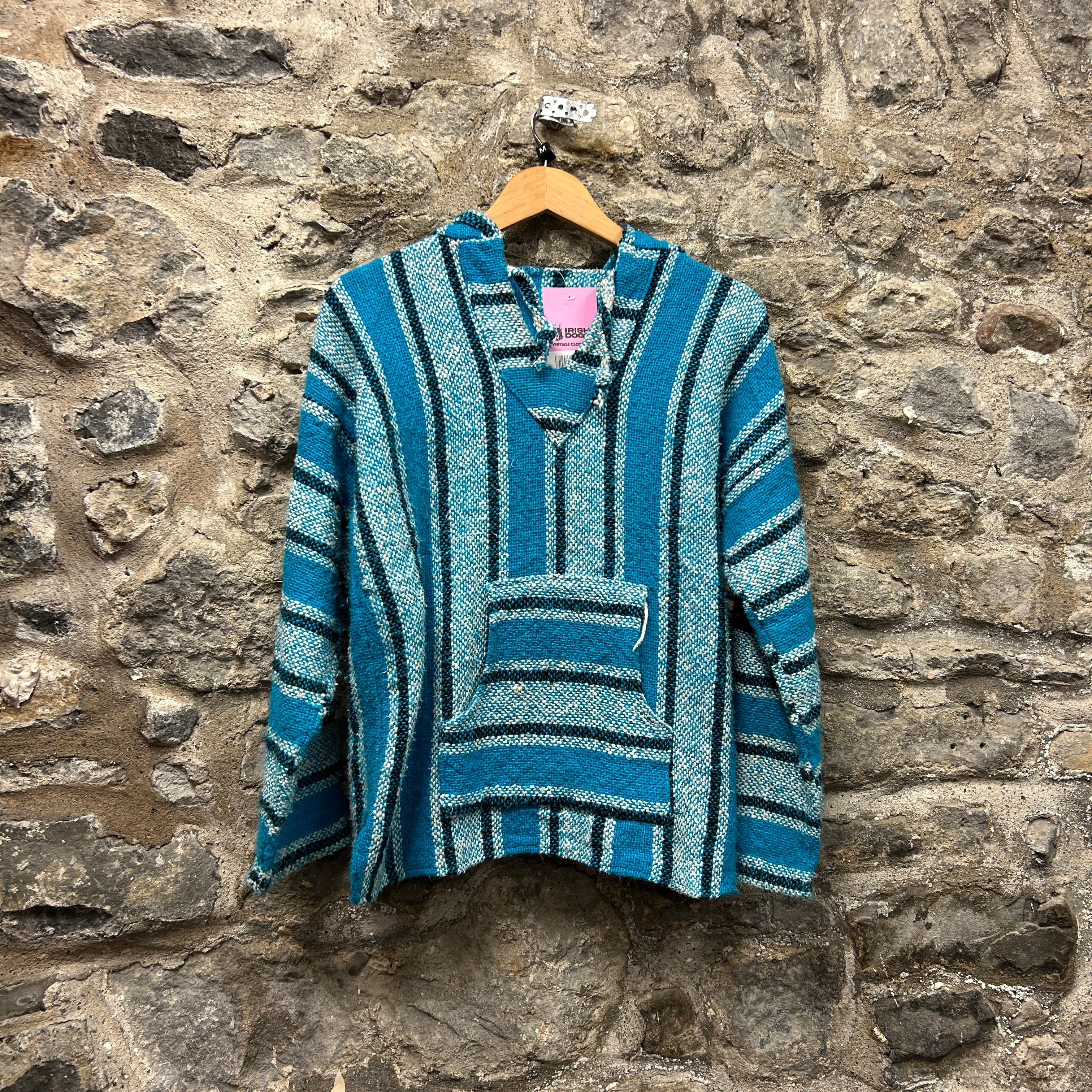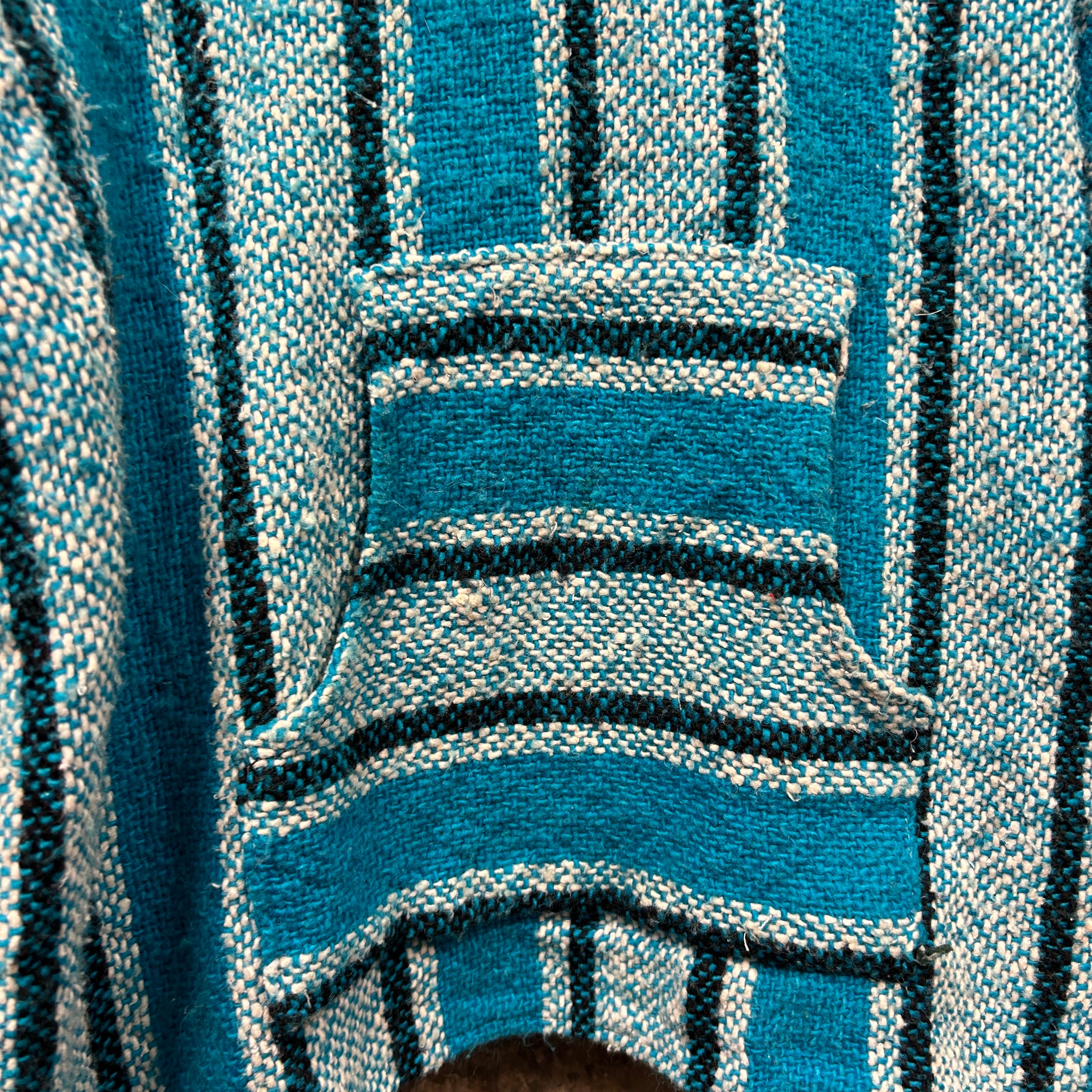 Product details: Woven baja/jerga-style hoodie in turquoise blue with cream and black vertical stripe pattern; classic V-notch neckline, roomy hood, and front kangaroo pocket; textured blanket-knit fabric with slightly raw/overlocked edges typical of surfer/hippie pullovers. Brand: .| Label Size | |