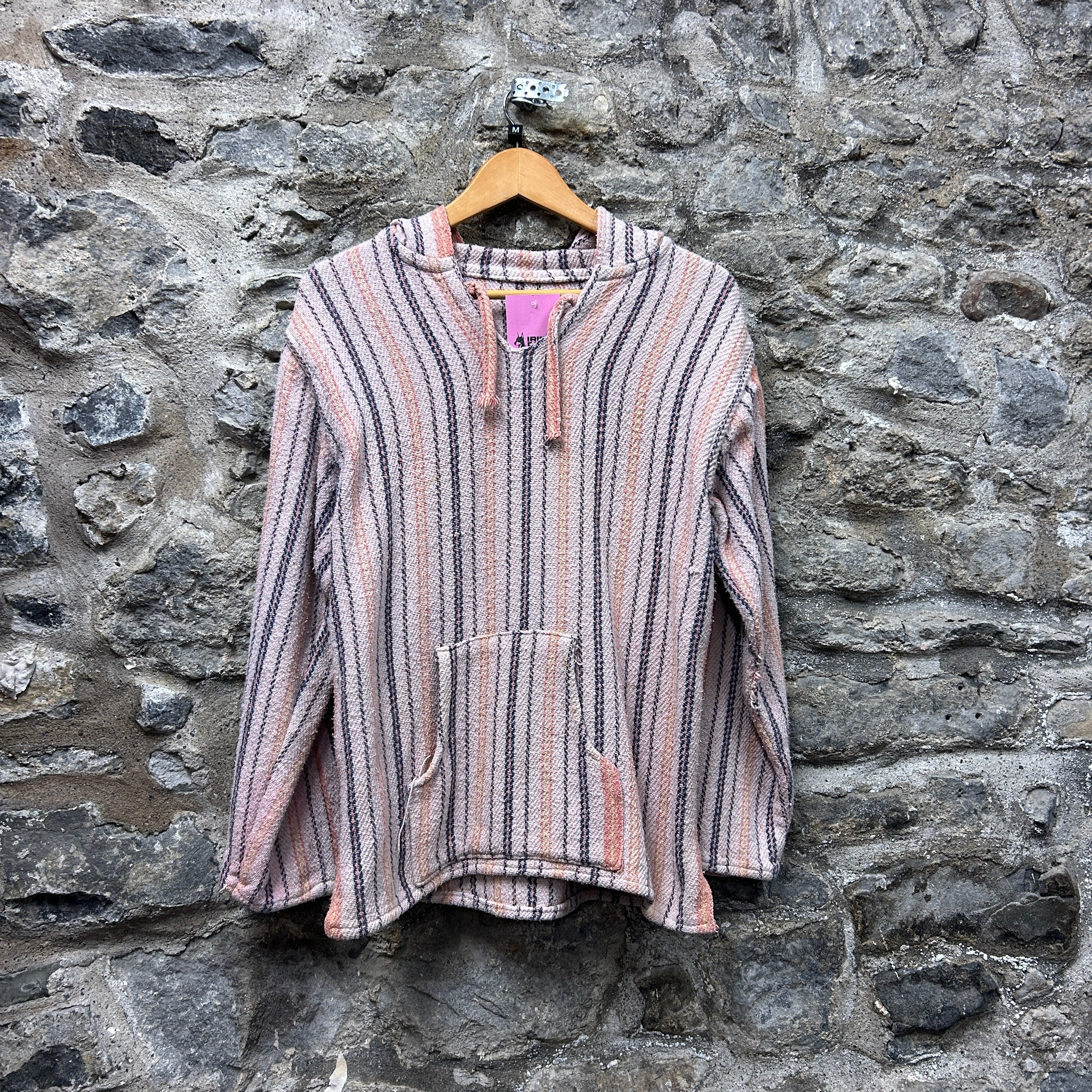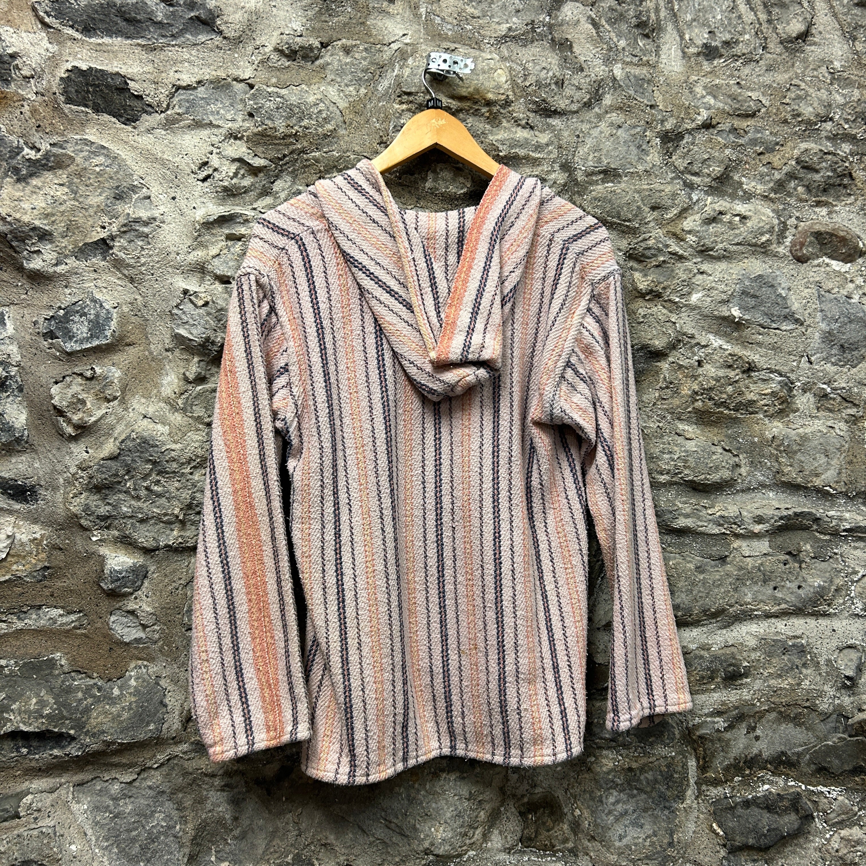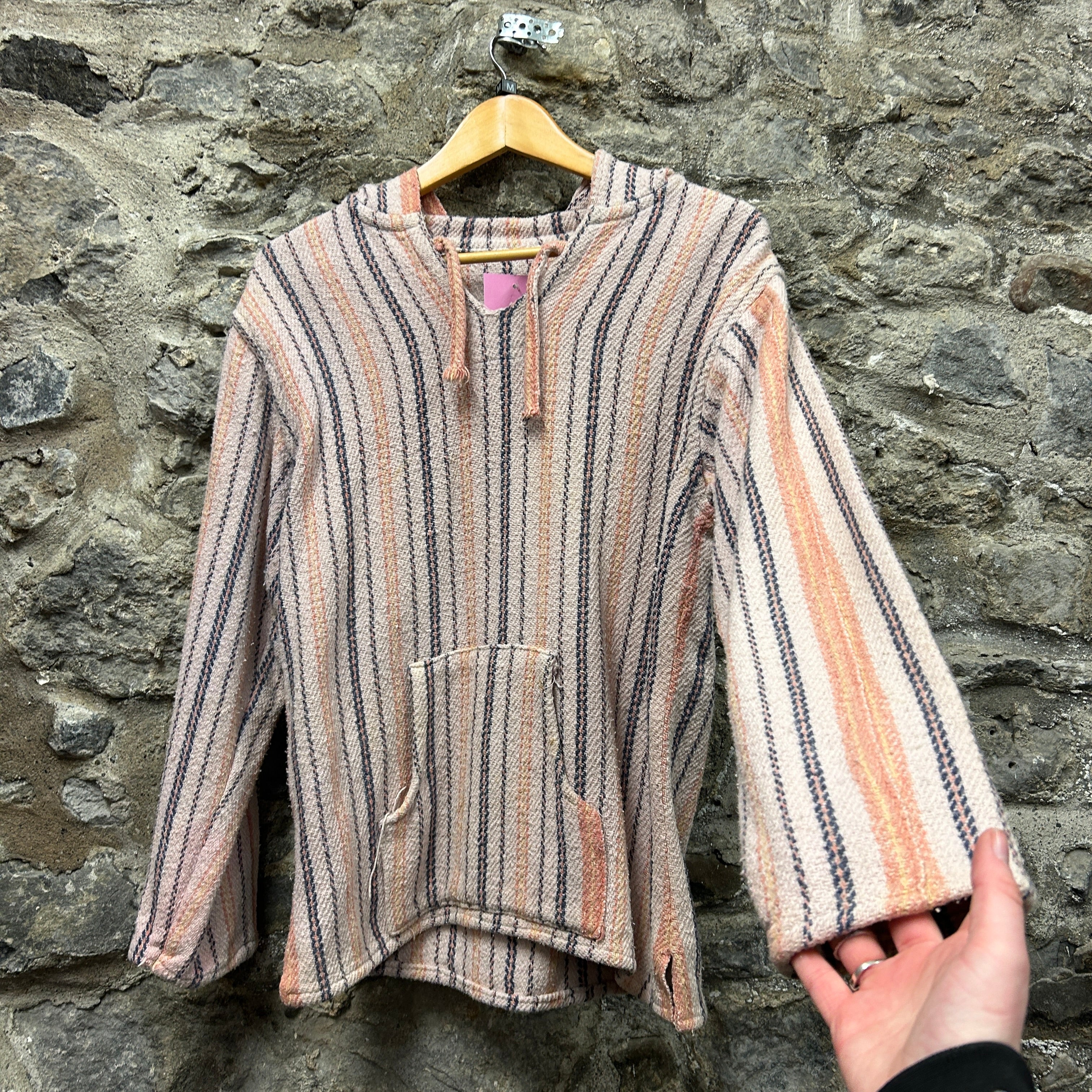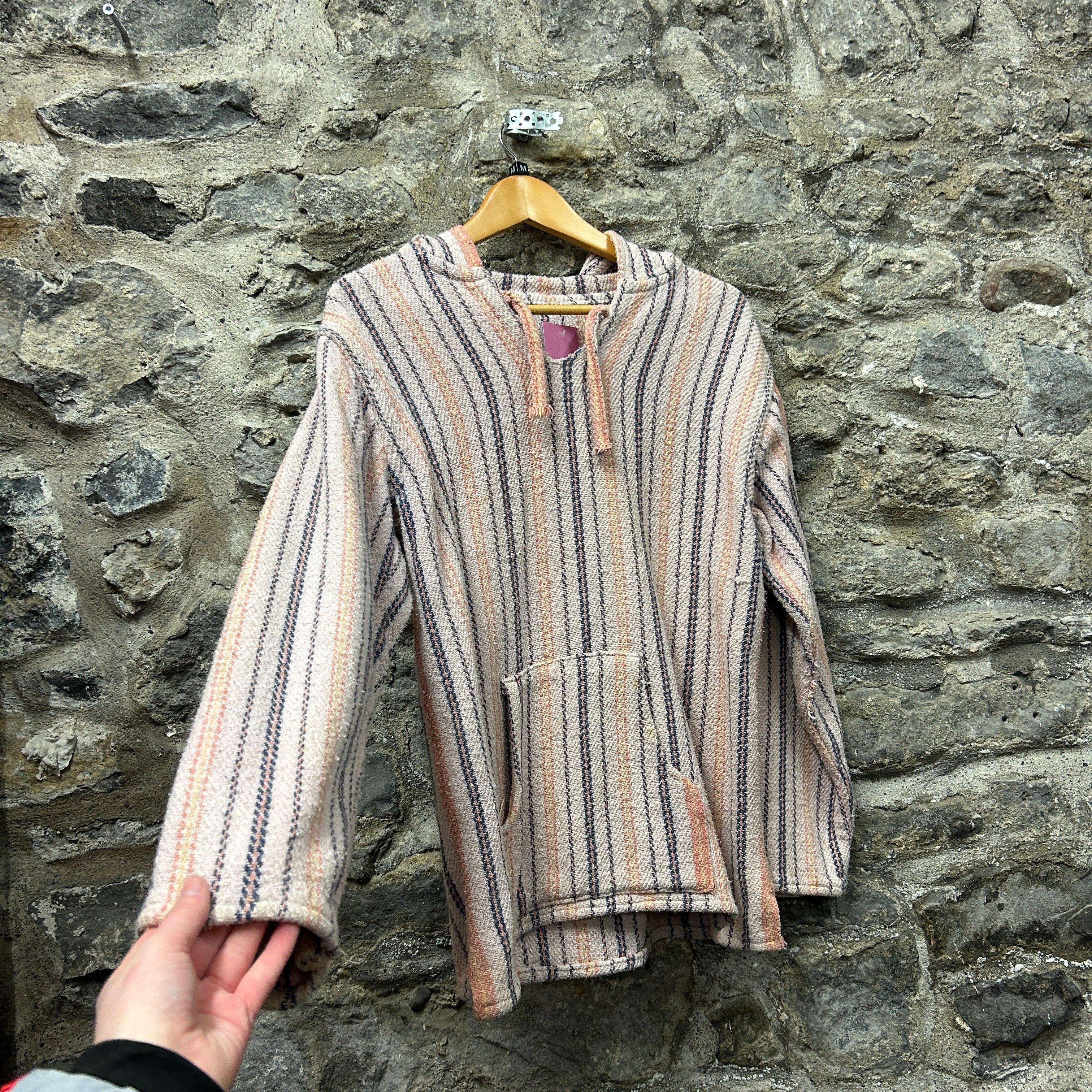 Product details: Woven baja/jerga pullover hoodie in beige base with vertical navy and rust/orange stripe pattern; textured blanket-style fabric, split V-neck with braided drawcords, kangaroo pocket, and relaxed fit. Photos show minor loose threads/fraying at pocket edge. Includes Irish Dogs Vintage Clothing hangtag and handwritten price/size tag (Size M). Brand: .| Label Size | |