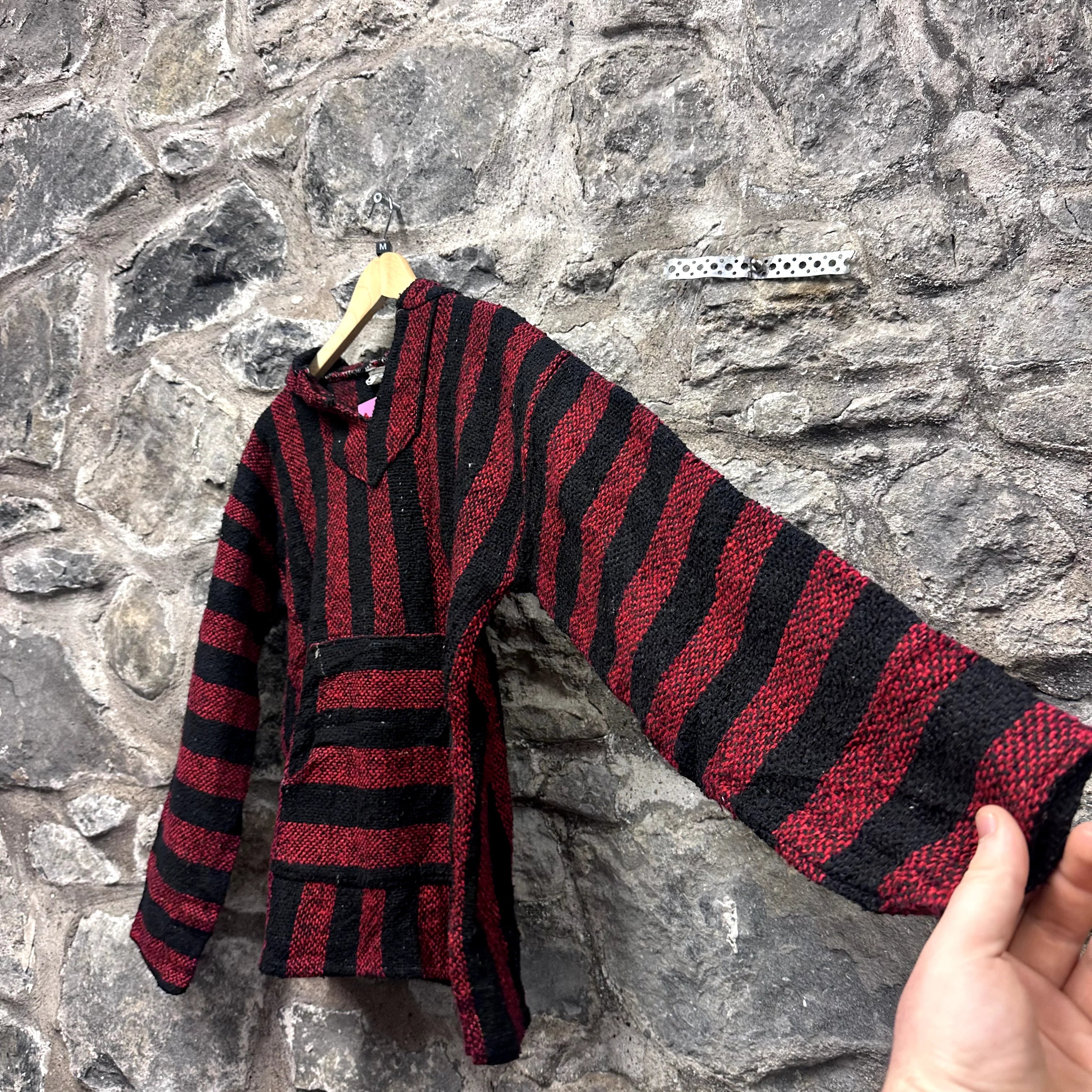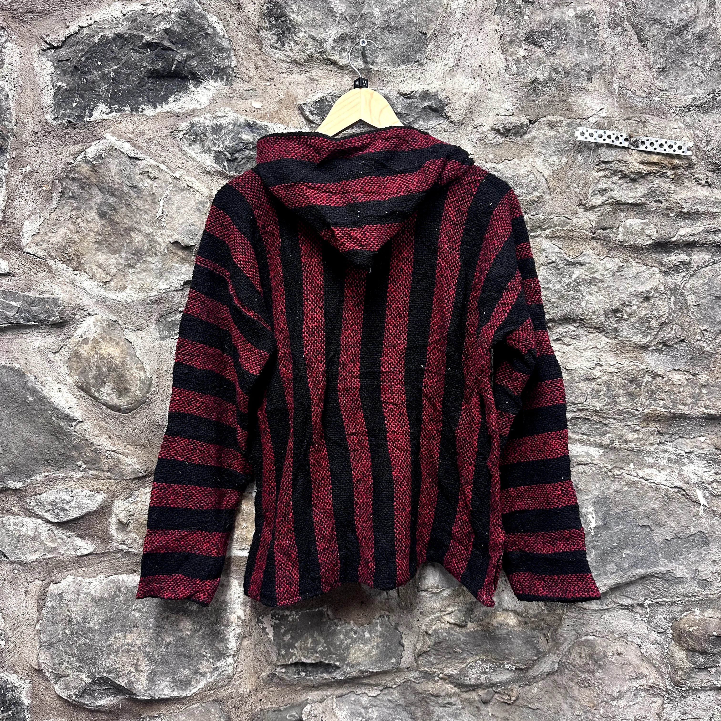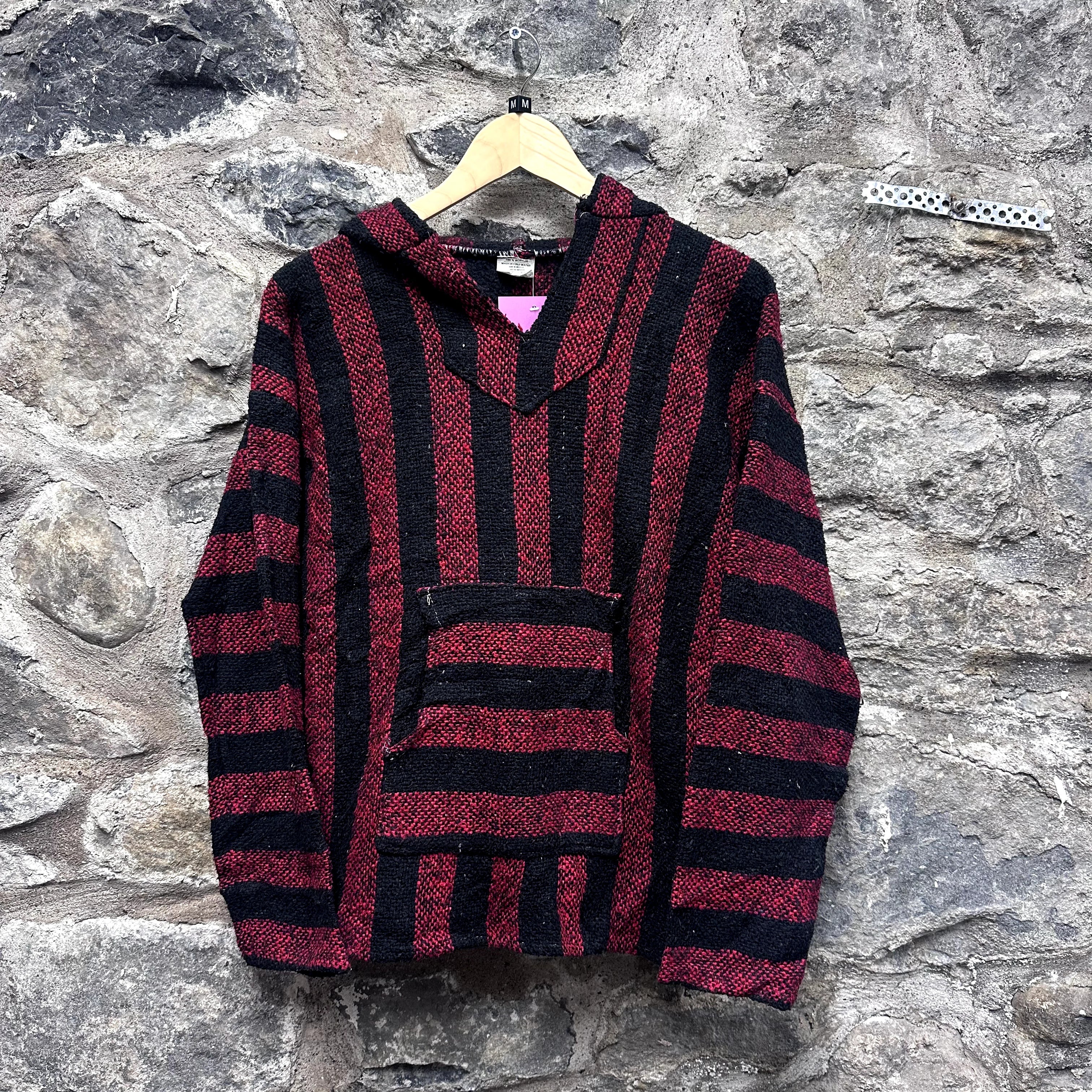 Product details: Red and black vertical stripes, classic Baja hoodie shape with front kangaroo pocket, hooded pullover style, woven texture, wide sleeves, label made in Mexico, 100% acrylic. Brand: .