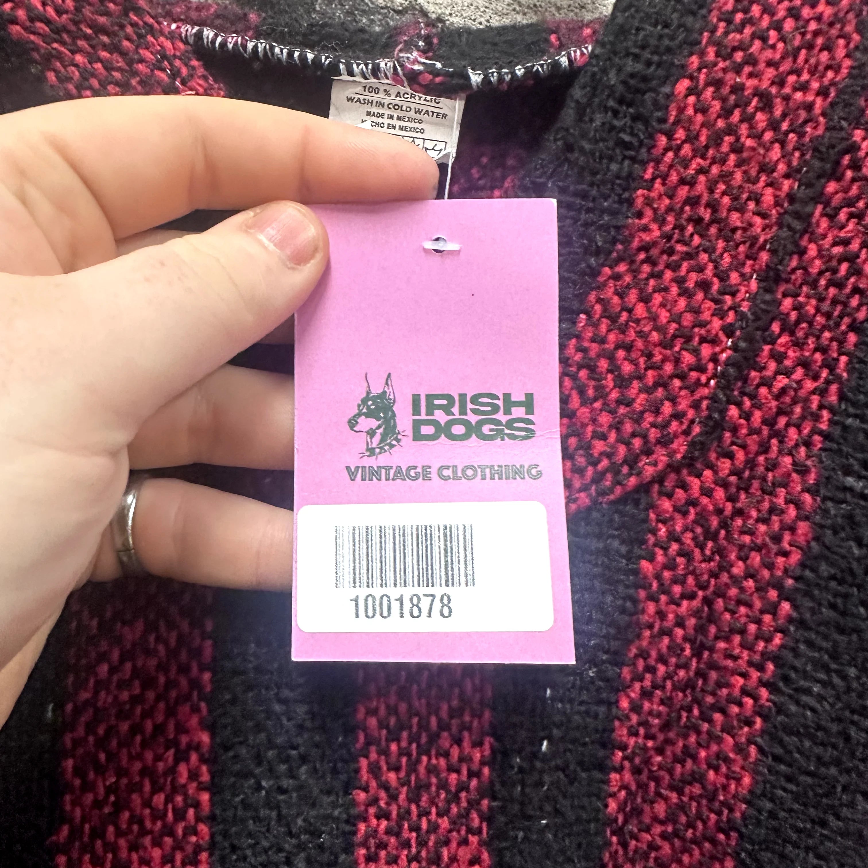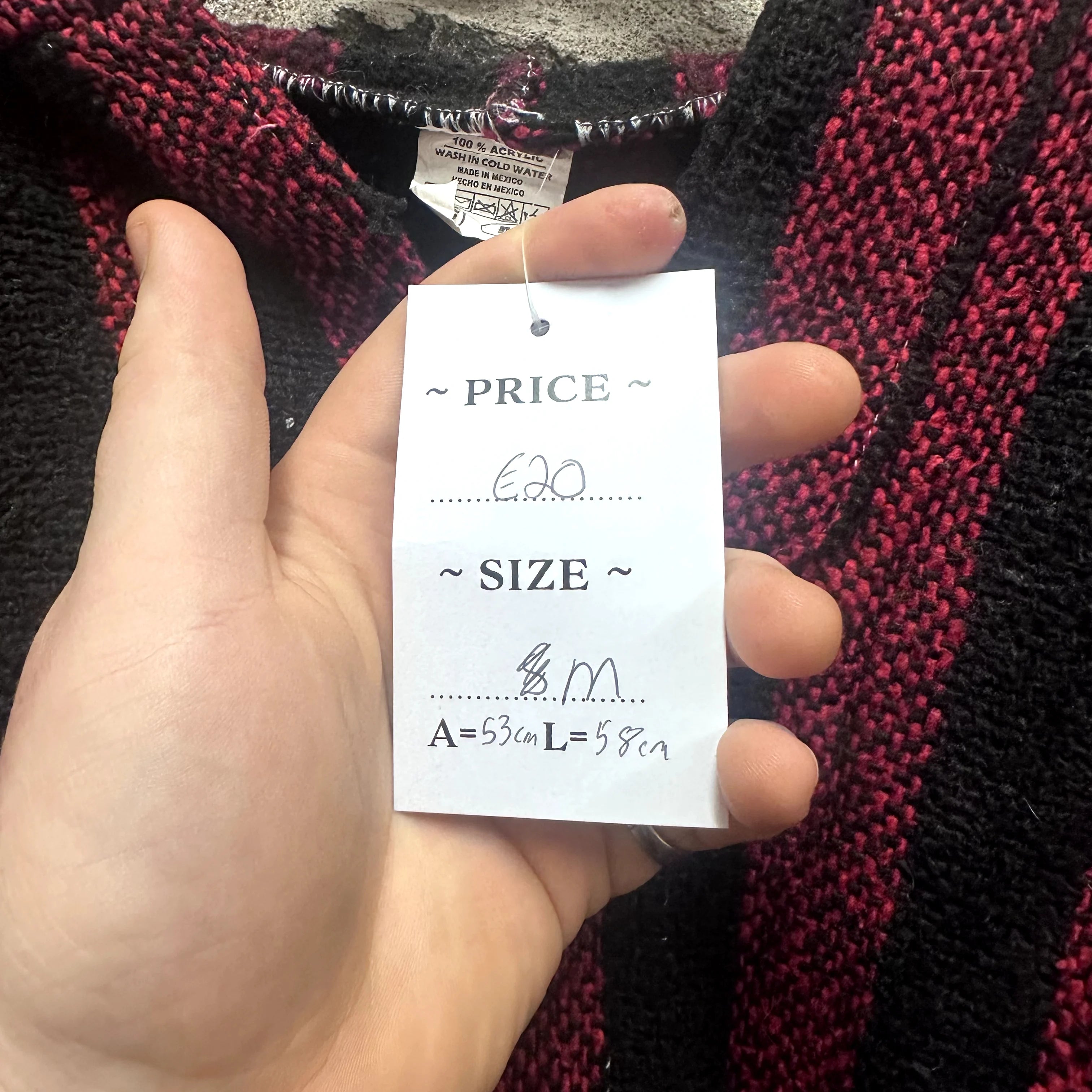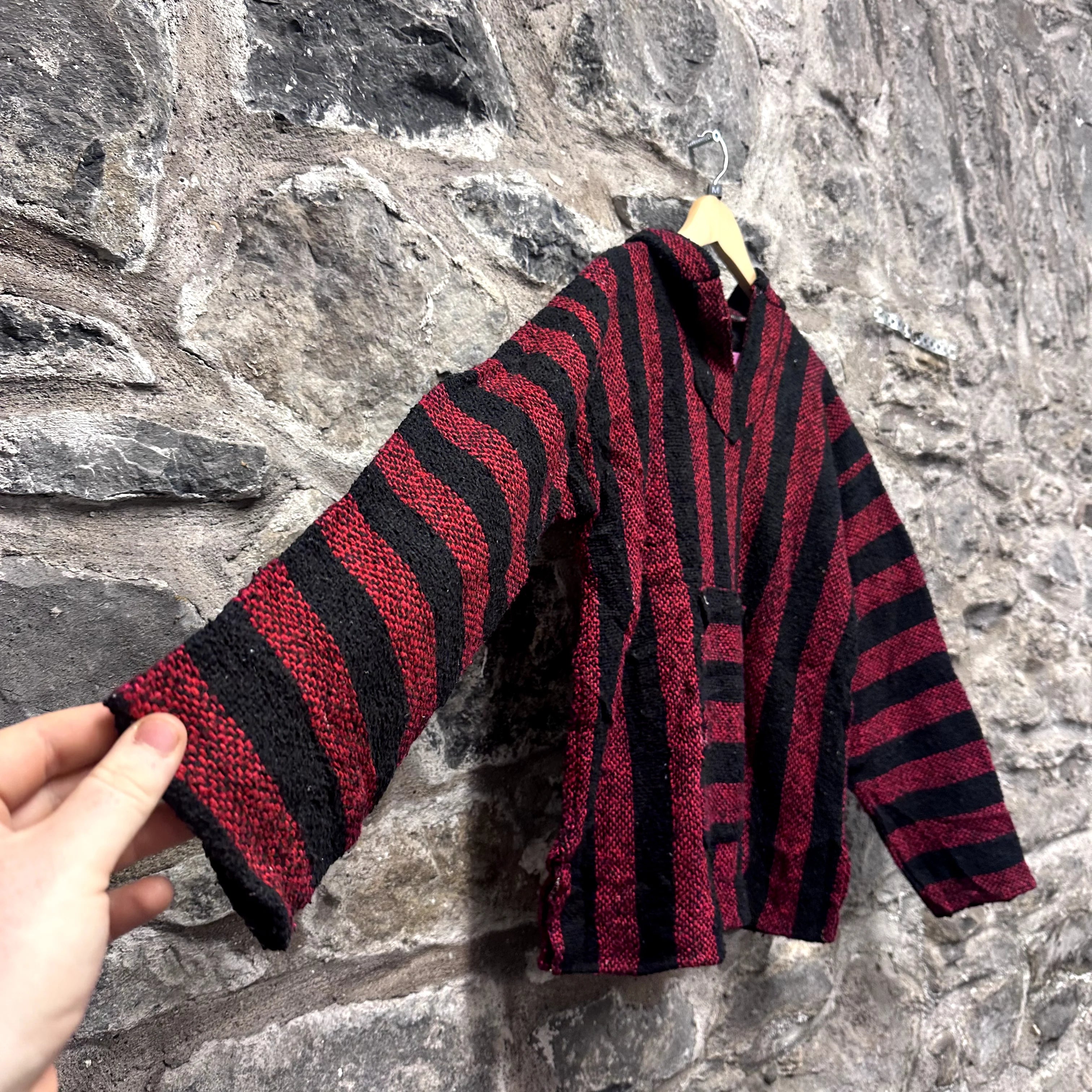 Product details: Red and black vertical stripes, classic Baja hoodie shape with front kangaroo pocket, hooded pullover style, woven texture, wide sleeves, label made in Mexico, 100% acrylic. Brand: .