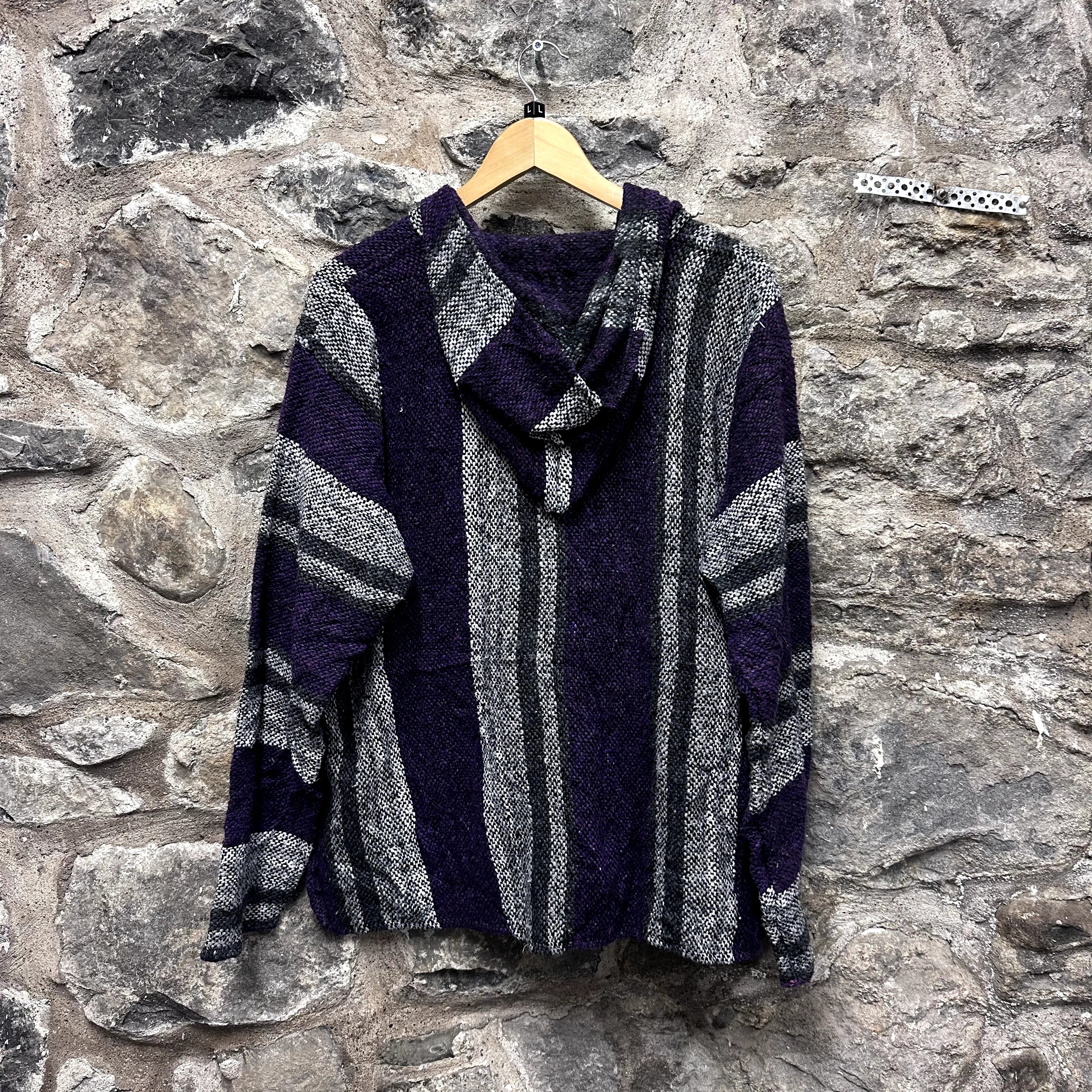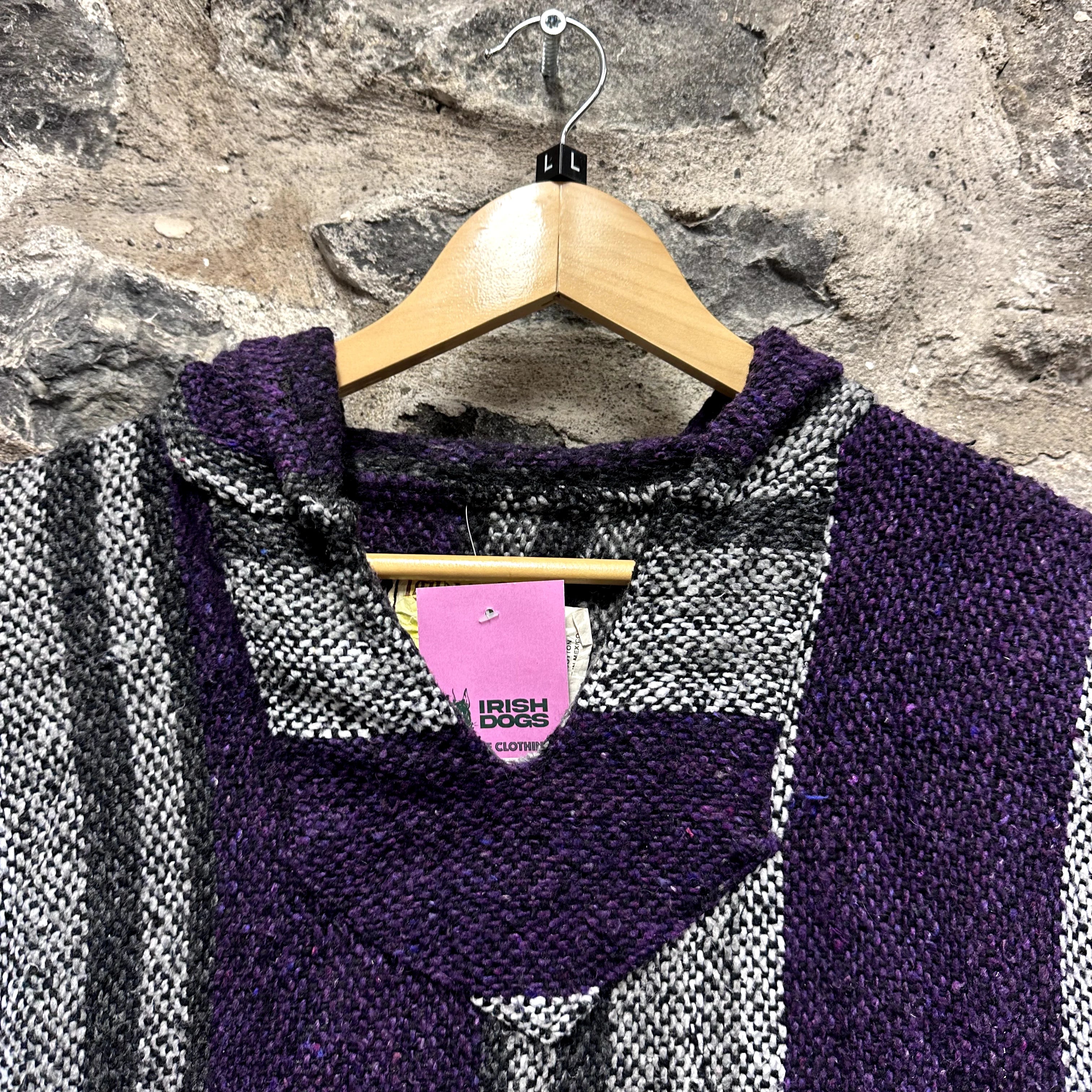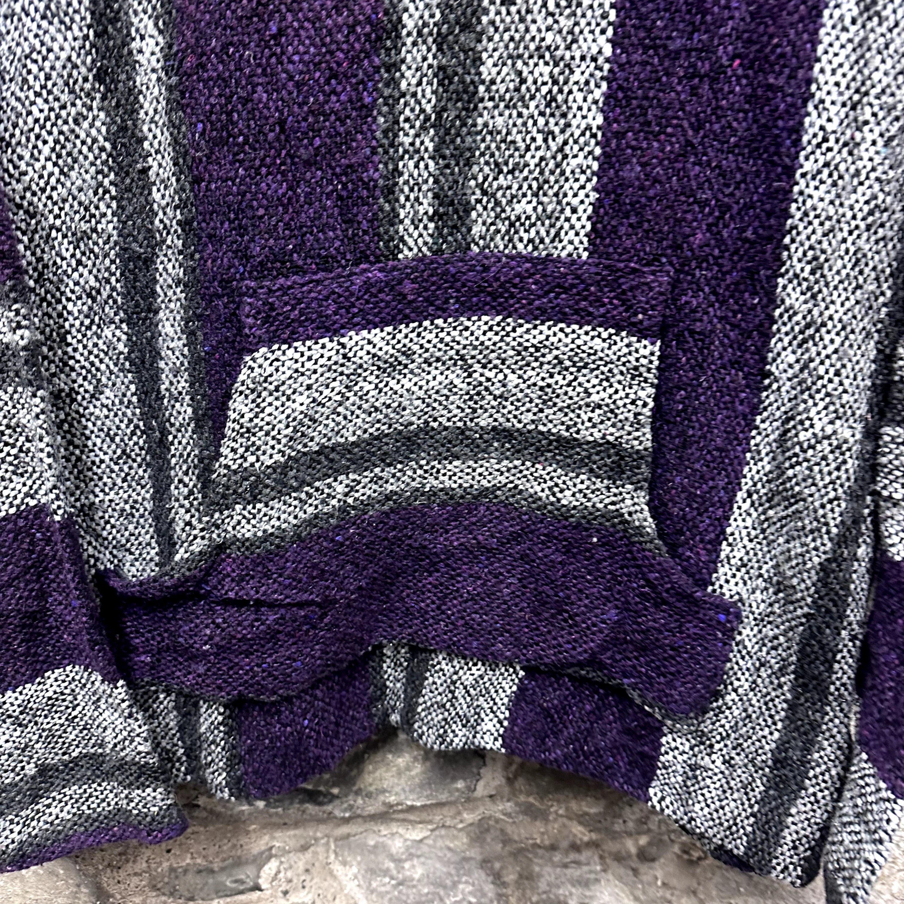 Product details: Textured woven fabric with purple, gray, and black stripes; classic Baja hoodie cut with kangaroo pocket, loose fit, and attached hood. Label and tag shown in detail. Size L. Brand: Iguana Jack.