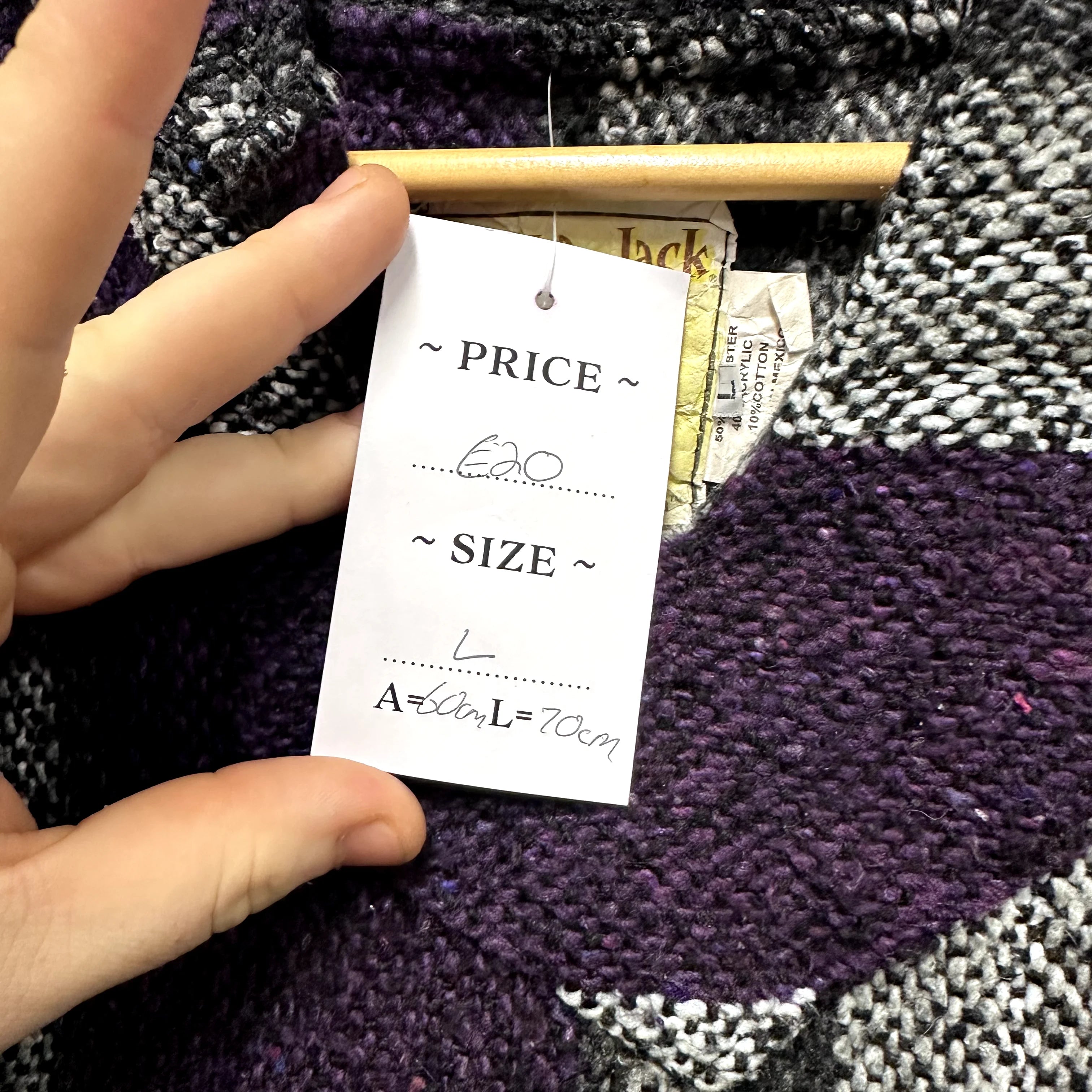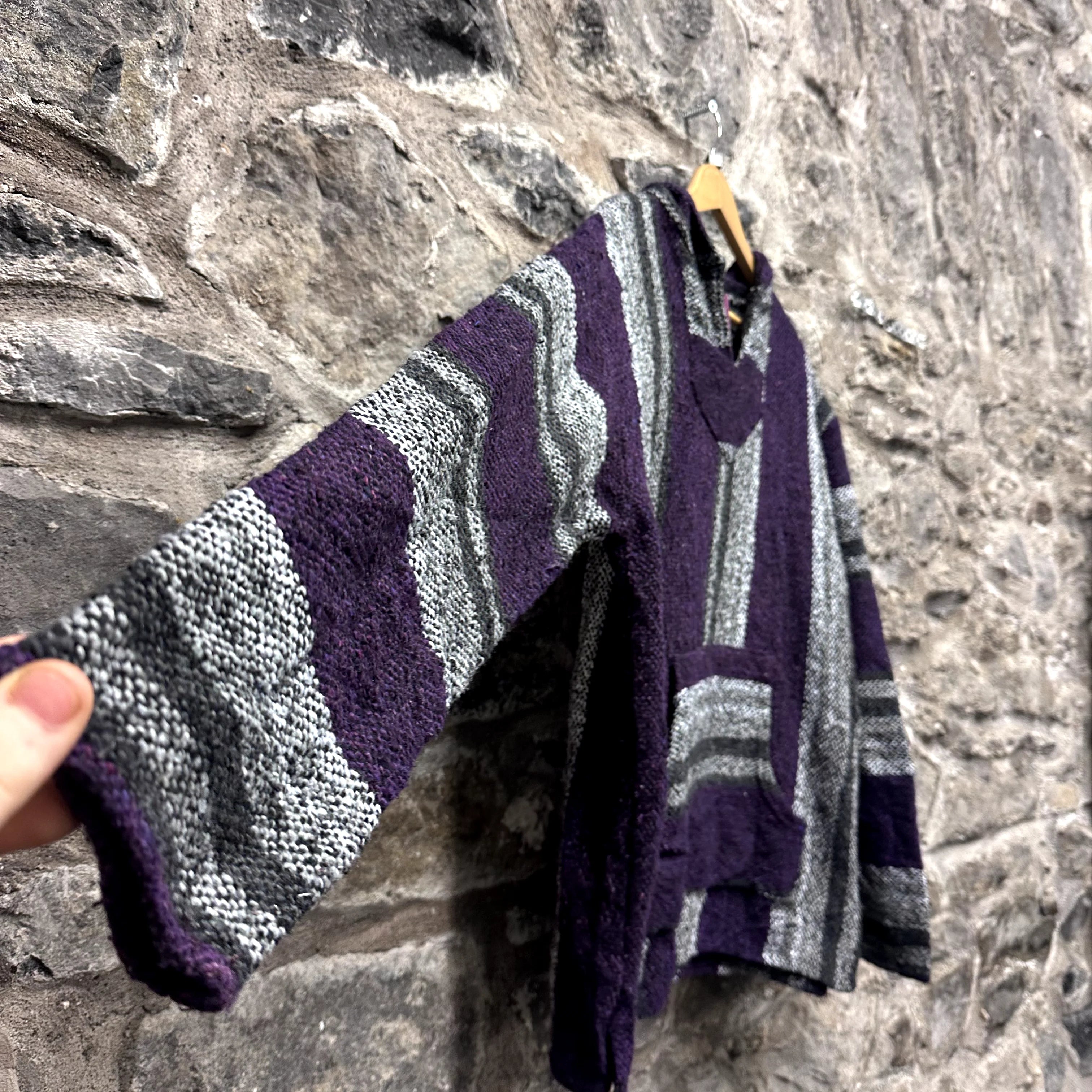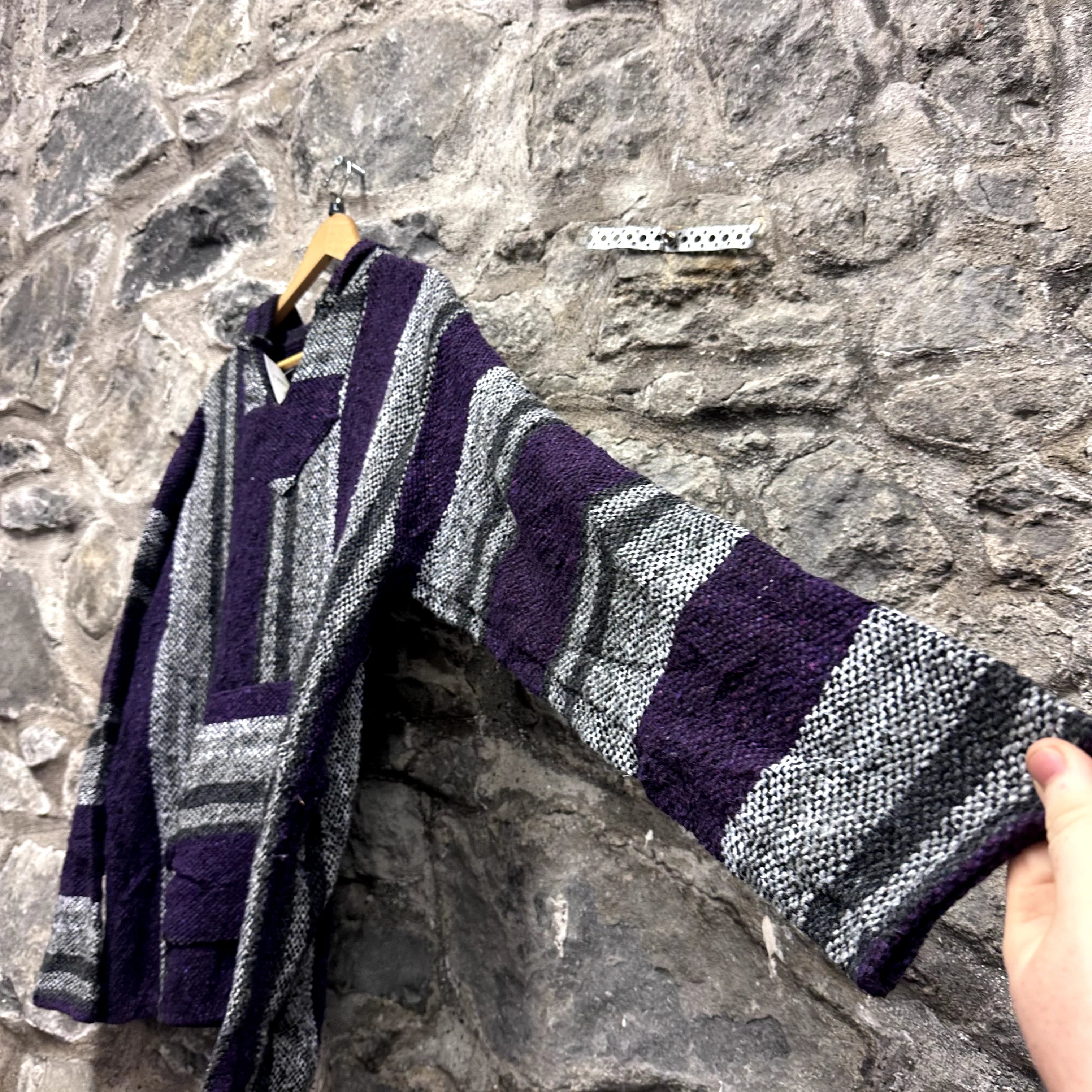 Product details: Textured woven fabric with purple, gray, and black stripes; classic Baja hoodie cut with kangaroo pocket, loose fit, and attached hood. Label and tag shown in detail. Size L. Brand: Iguana Jack.
