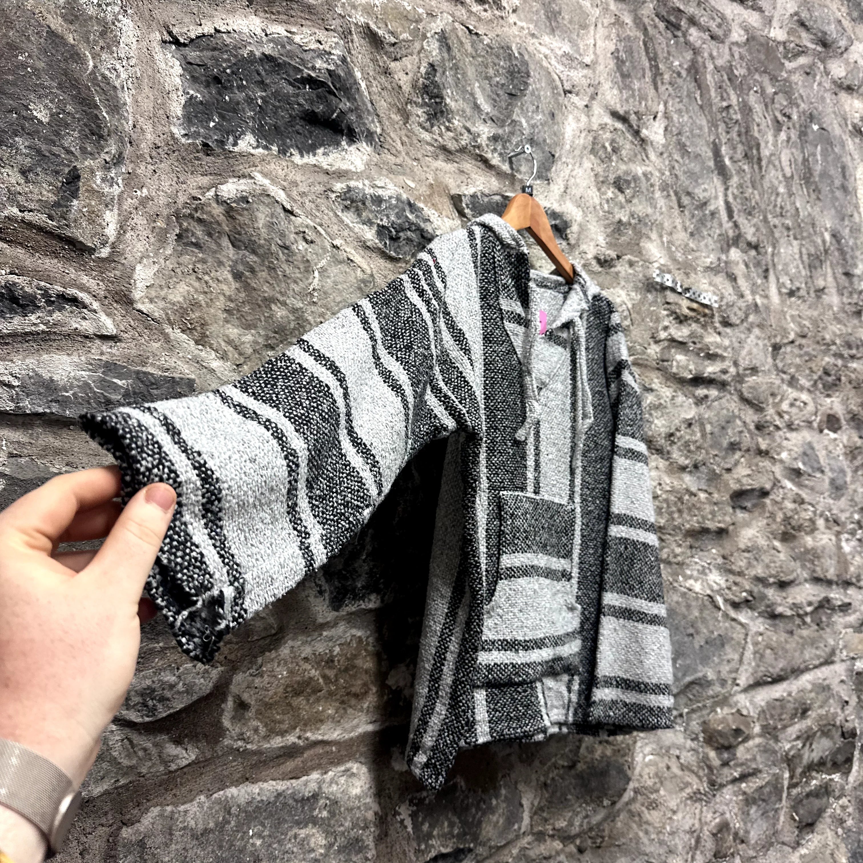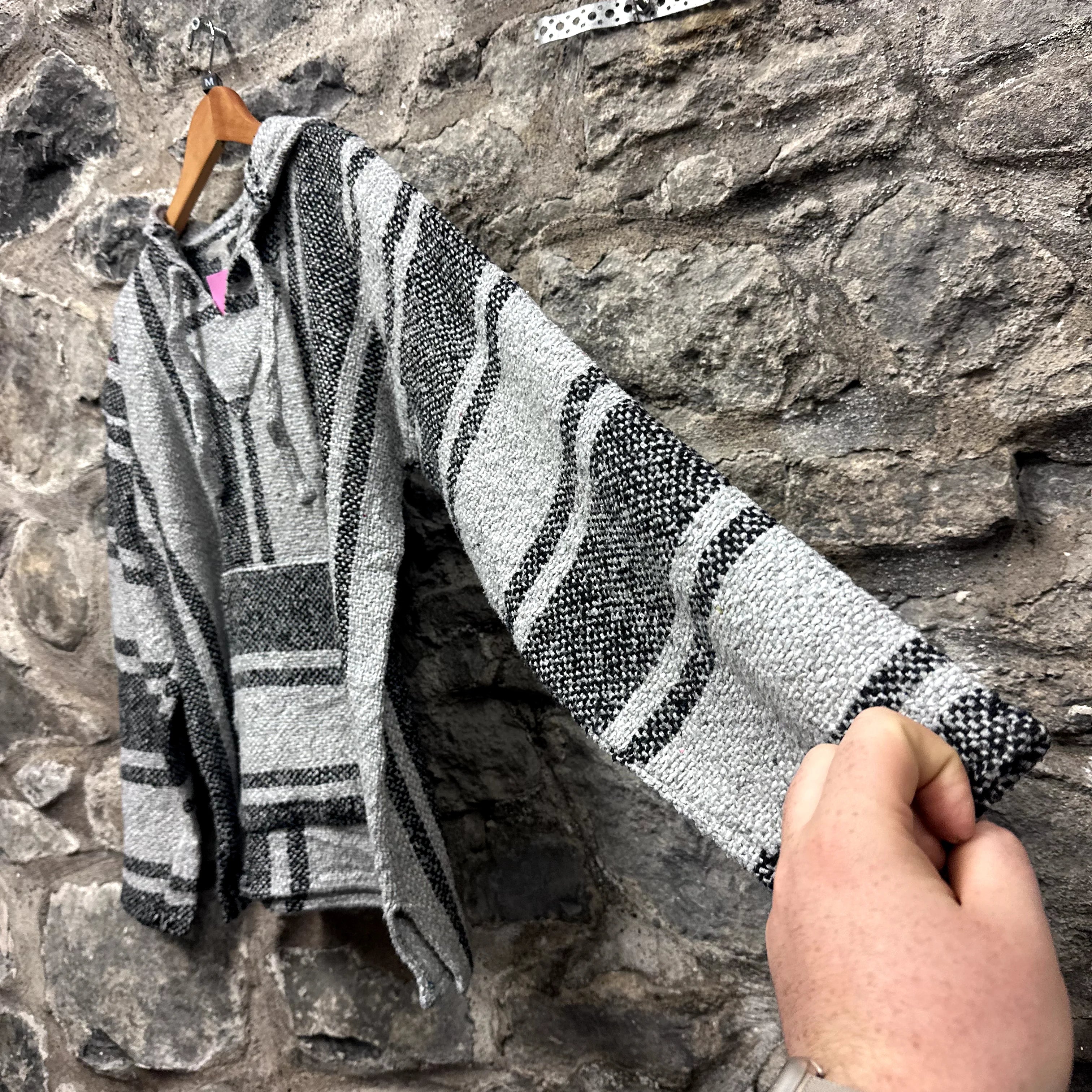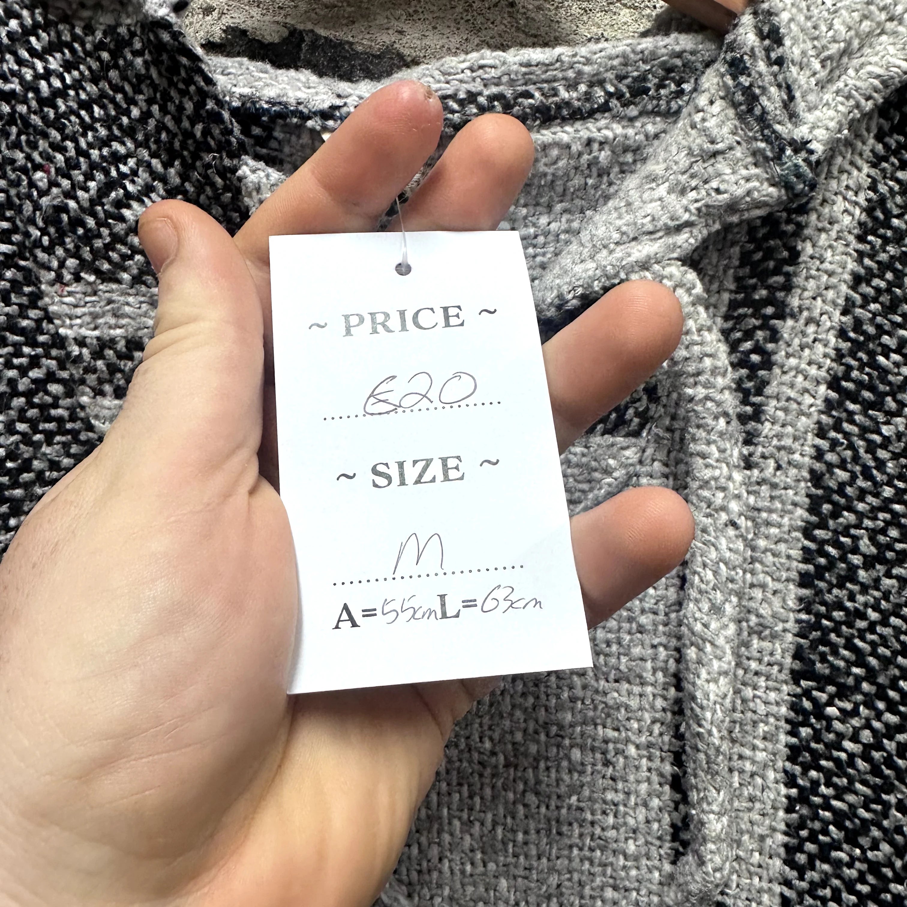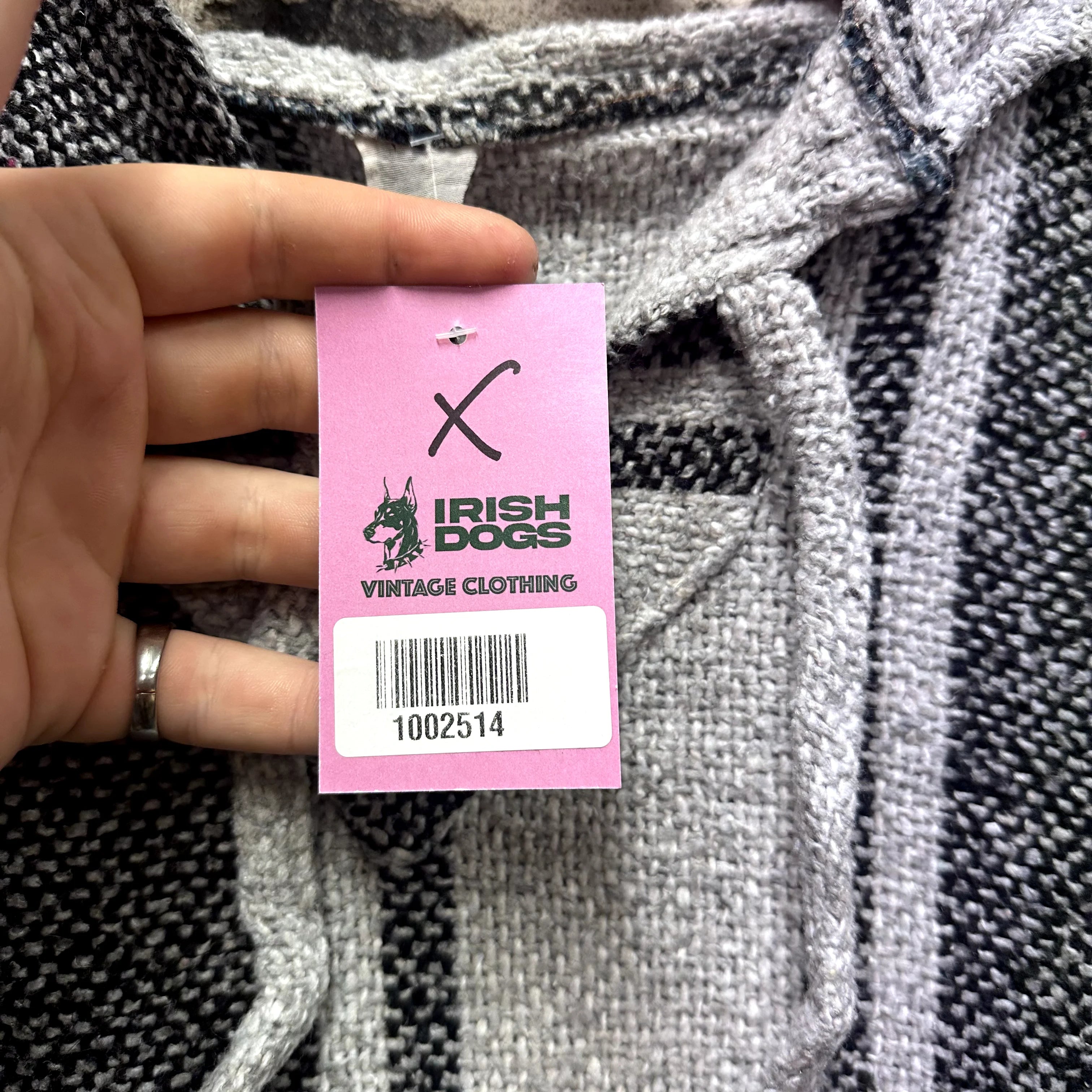 Product details: Gray and black vertical and horizontal woven stripes, kangaroo pouch pocket, drawstring hoodie, loose fit, woven acrylic texture, medium size label. Brand: Irish Dogs.| Label Size | |