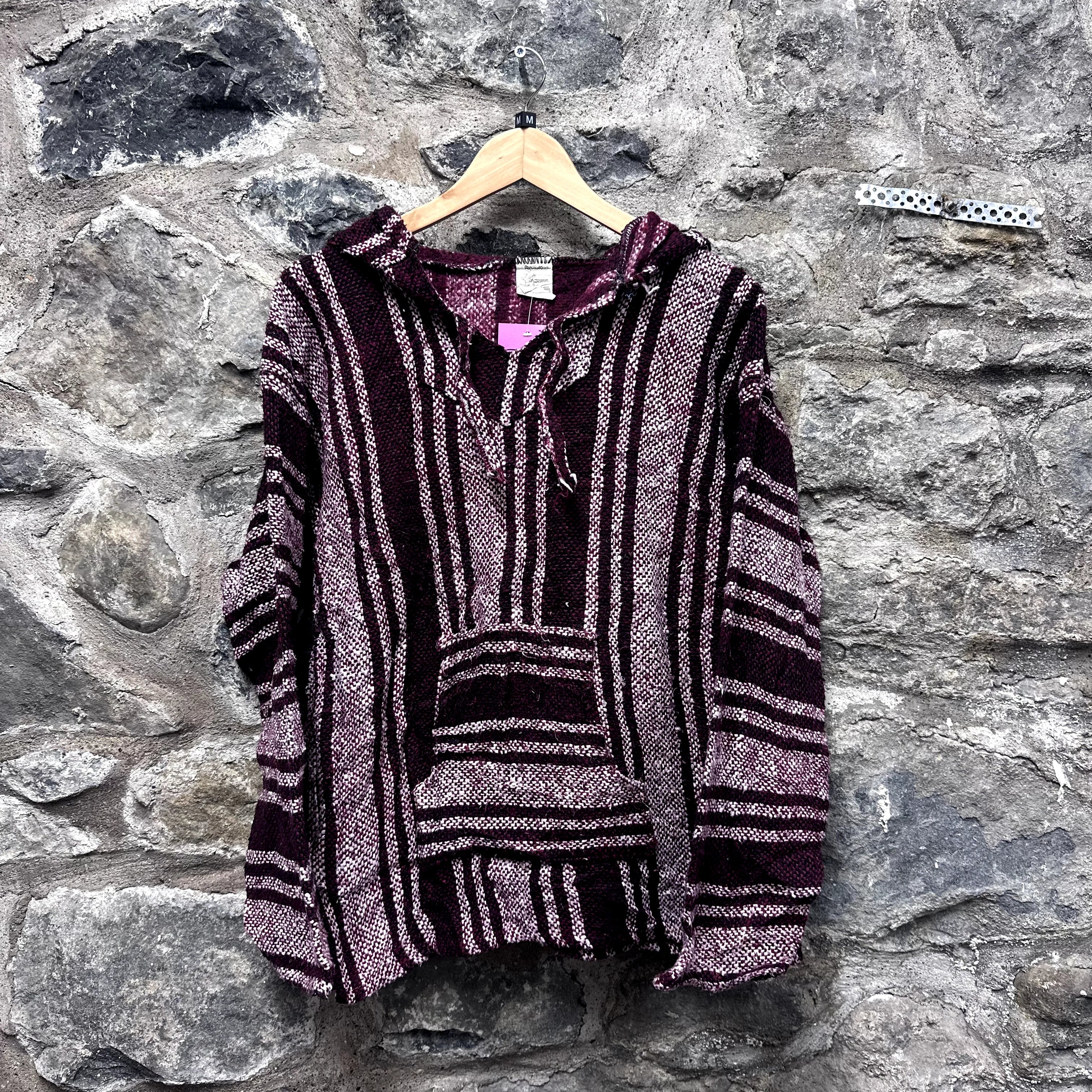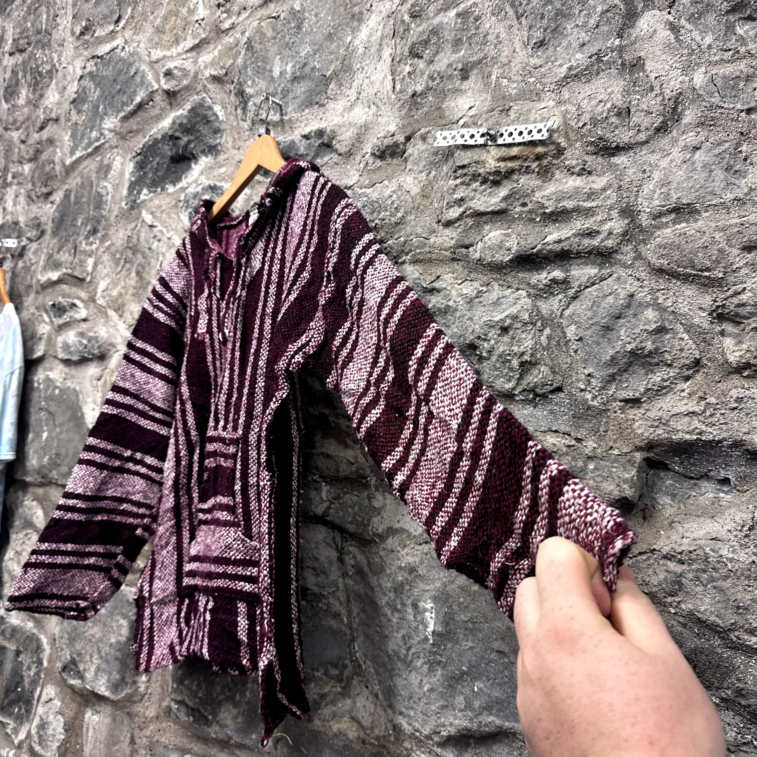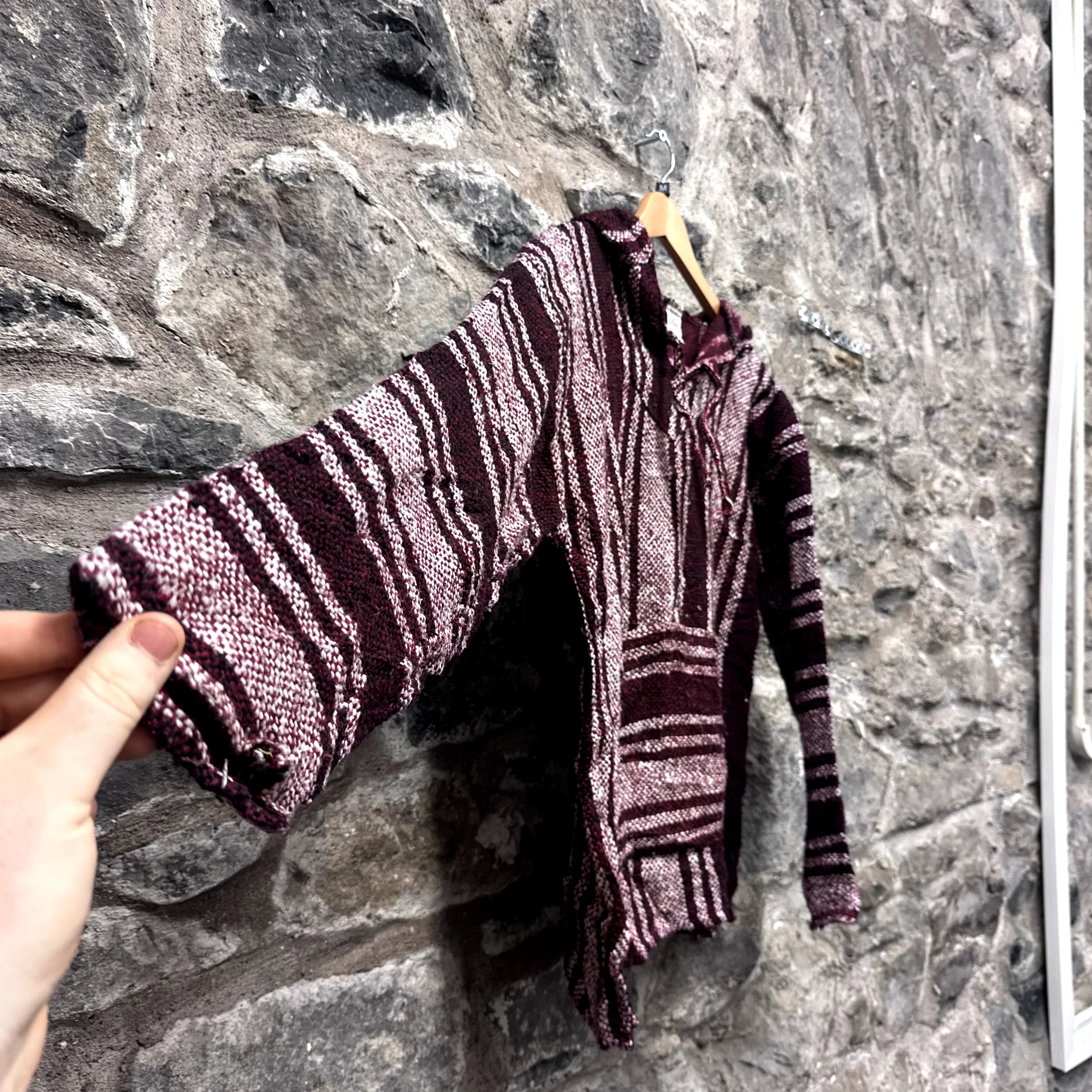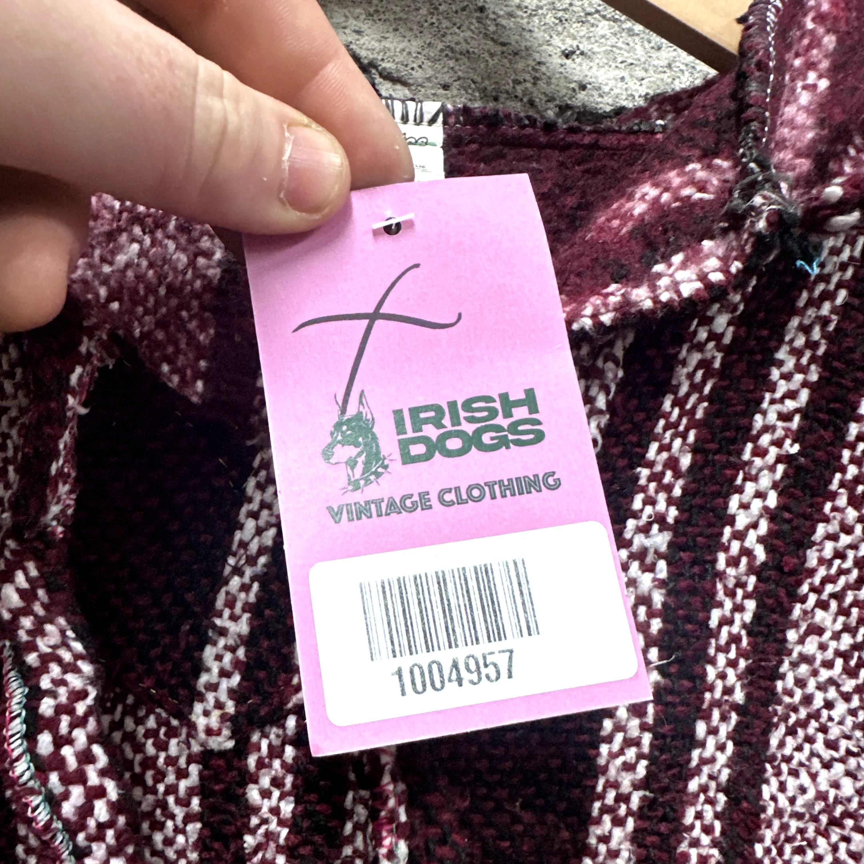 Product details: Heavy woven knit, brown and cream striped pattern, kangaroo pocket, drawstring hood, relaxed wide fit. Genuine vintage. Irish Dogs hang tag present. Brand: Irish Dogs Vintage Clothing.| Label Size | |