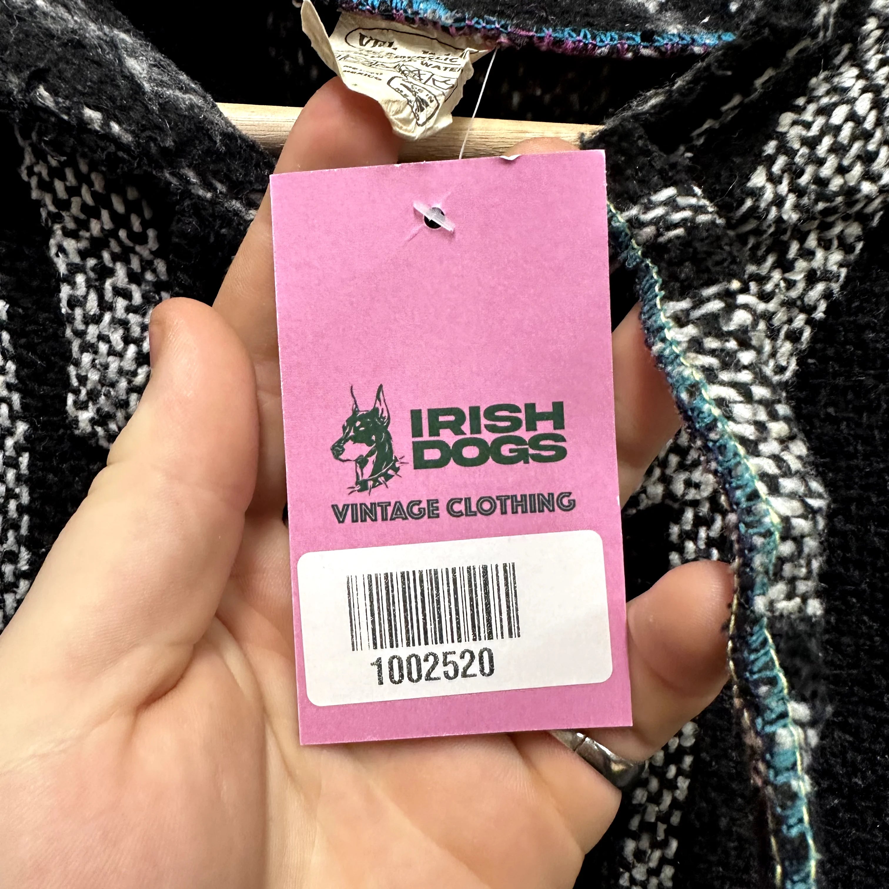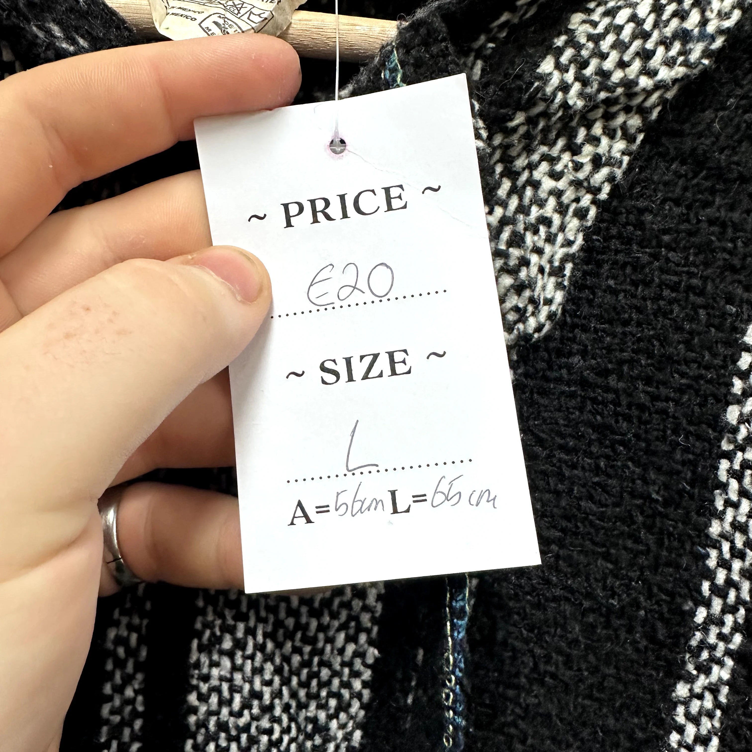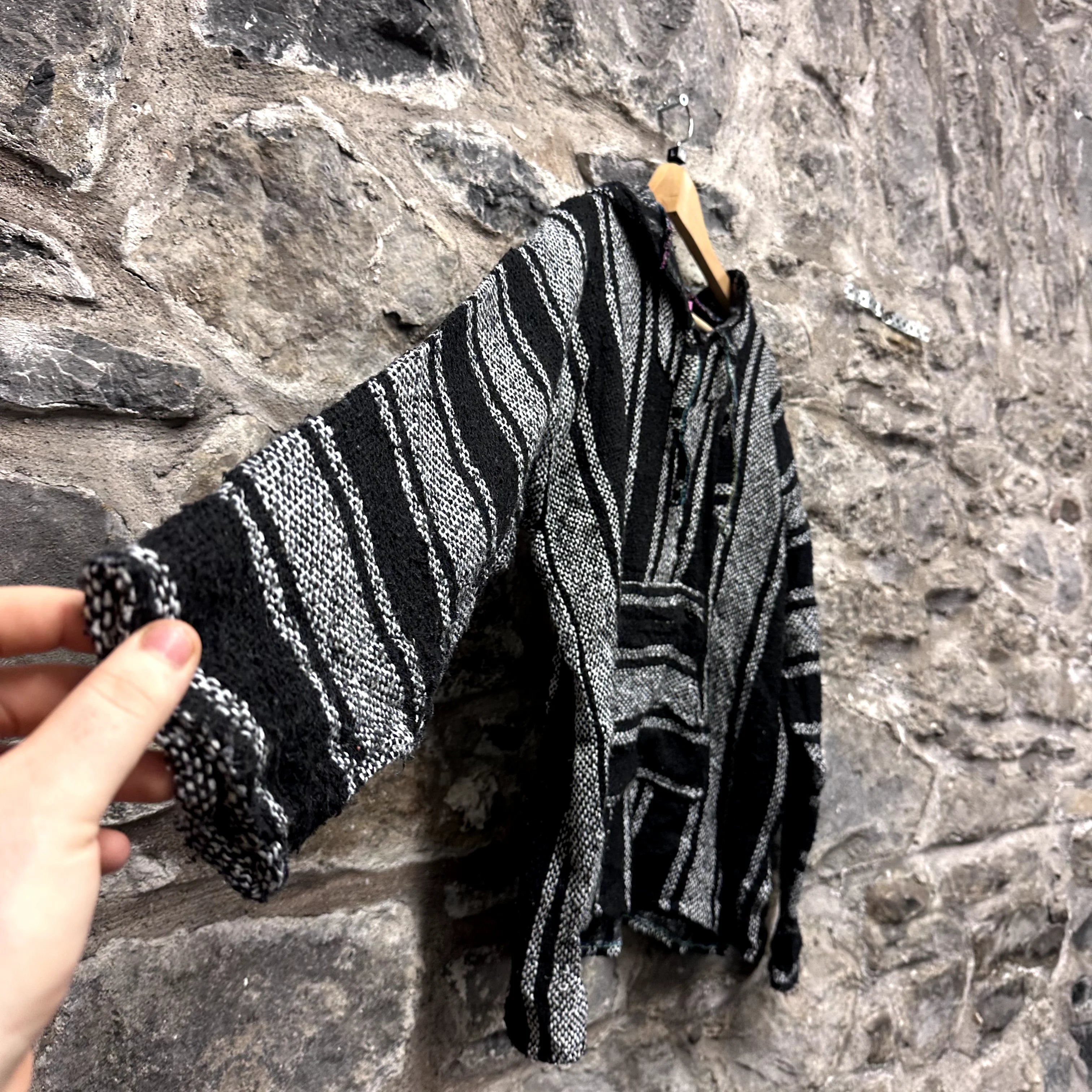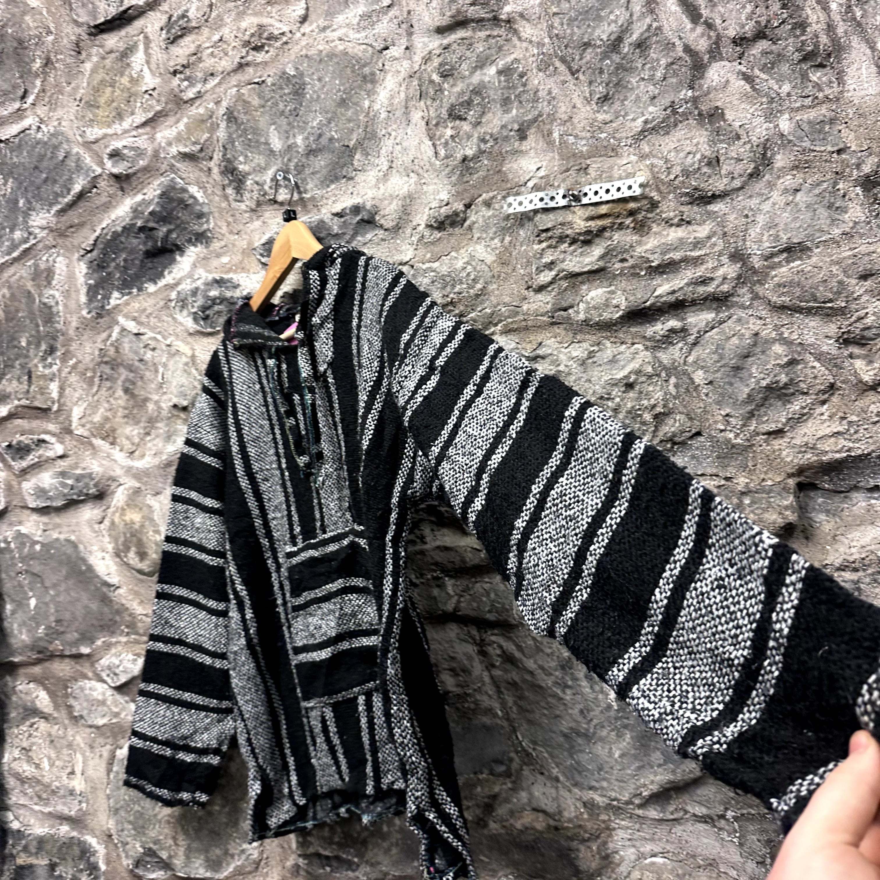 Product details: Black and white striped woven Baja hoodie, kangaroo pocket, wide sleeves, rustic stitching, label 'Vel-Mex', made in Mexico, 100% acrylic. Brand: Vel-mex.| Label Size | |