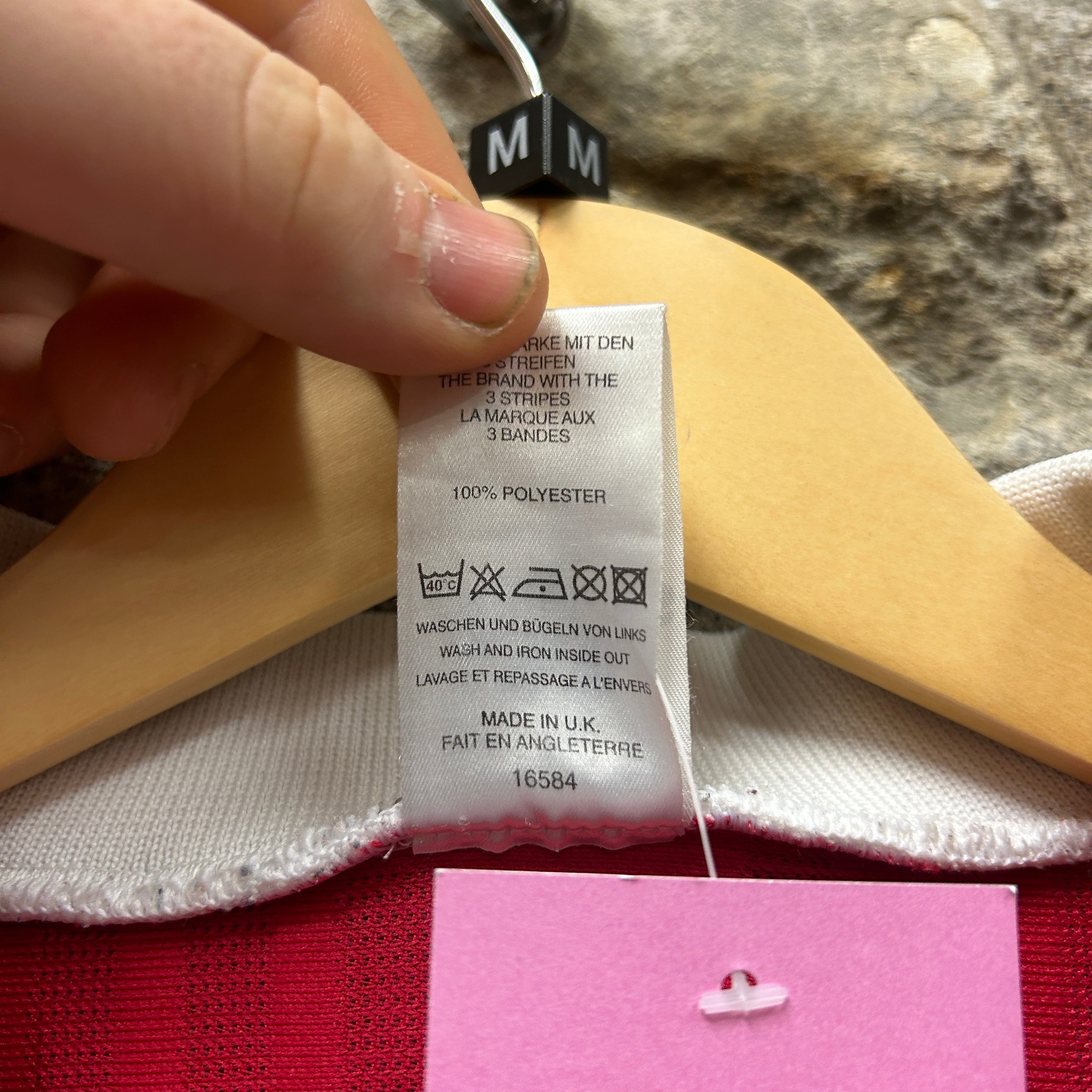 Product details: Vintage Adidas S.L. Benfica football shirt in red with white shoulder 3-stripe detailing and striped knit collar. Features embroidered adidas wordmark on chest, Benfica crest patch, and large flocked/raised sponsor print "TELECEL" with stylized "T". Back has player name "NUNO GOMES" and number "21" in oversized white flock with small adidas marks. Small Benfica "Official Garment" hem badge and an embroidered eagle motif at back neck. Fabric tag shows 100% polyester and Made in U.K. Interesting objects: wooden hanger marked "M" and an Irish Dogs Vintage Clothing barcode tag (1003384) plus handwritten price/size card. Brand: Adidas.| Label Size | |