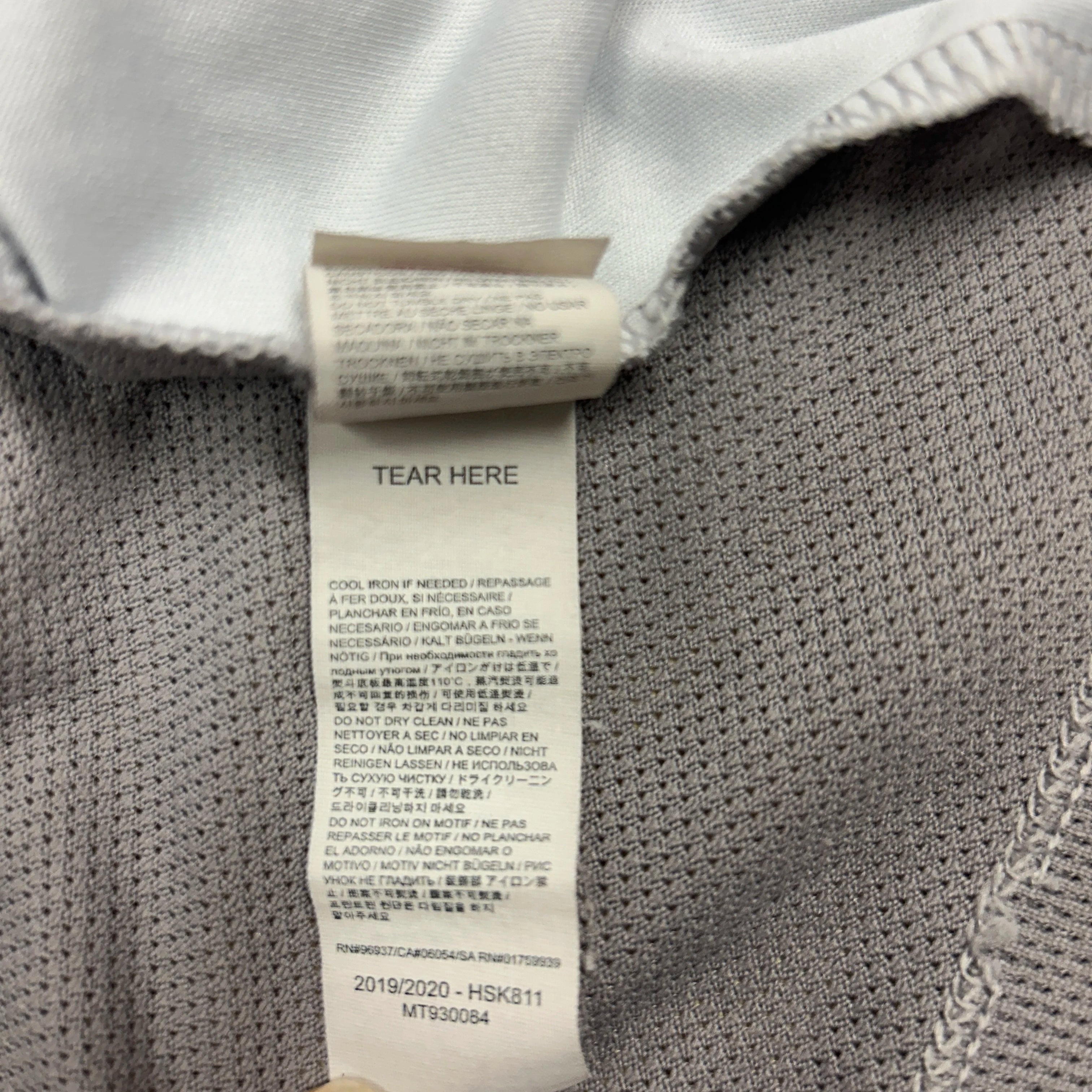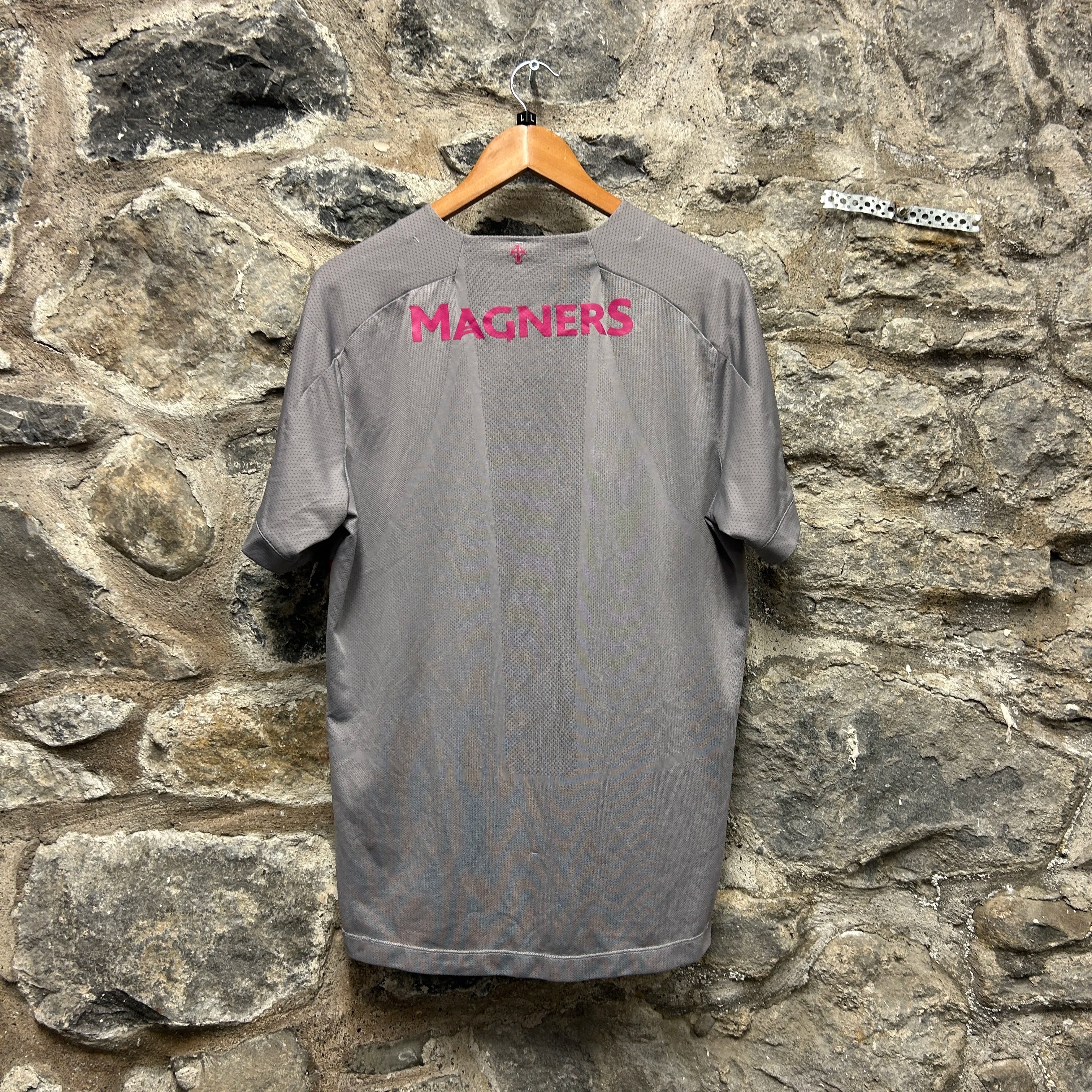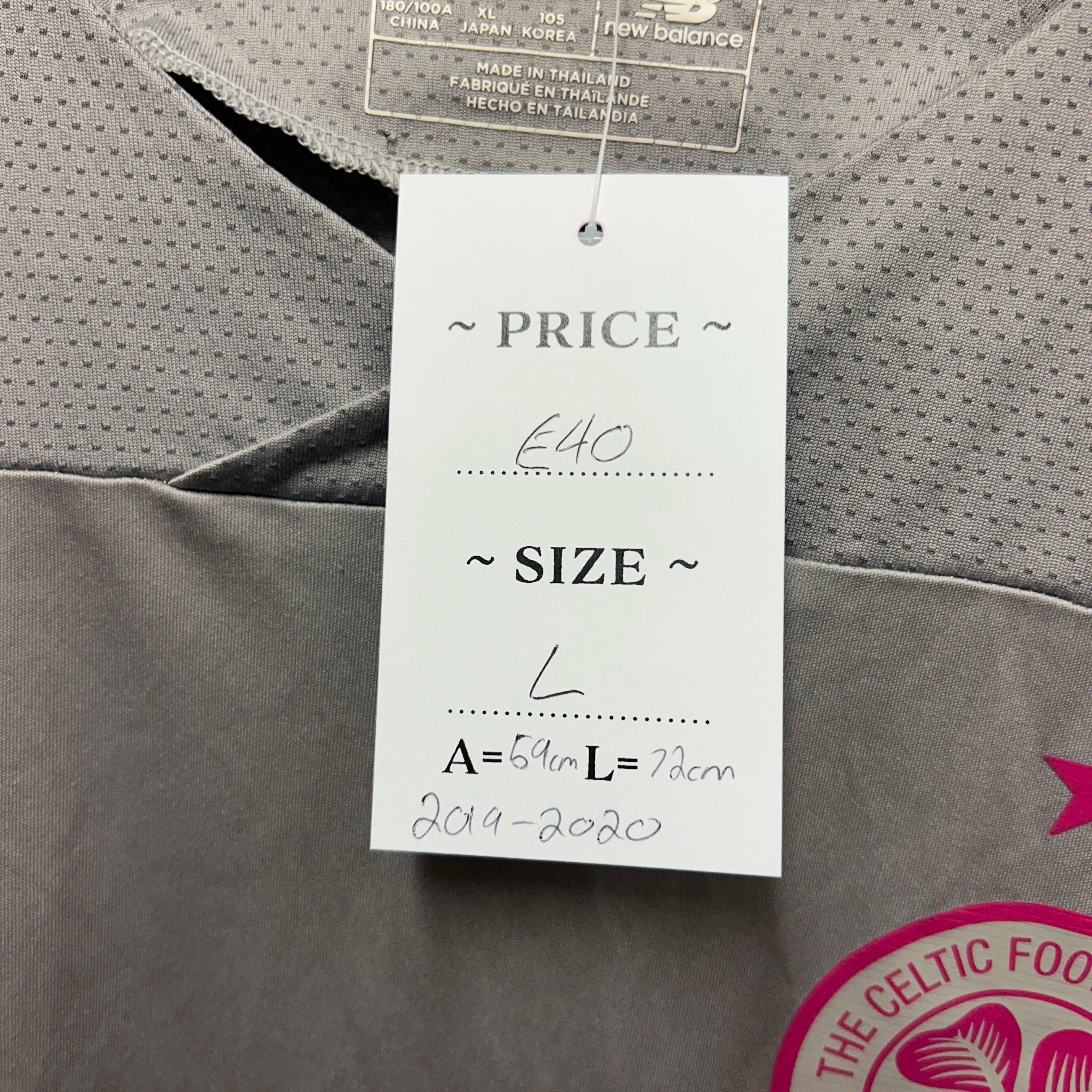 Product details: Grey Celtic FC 2019/20 away shirt with pink 'Celtic FC' star crest, 'dafabet' and 'Magners' sponsor logos, and New Balance branding. Authentic badge on hem. Relaxed fit, synthetic mesh fabric. Minor loose threads at lower hem. Brand: New Balance.| Label Size | |