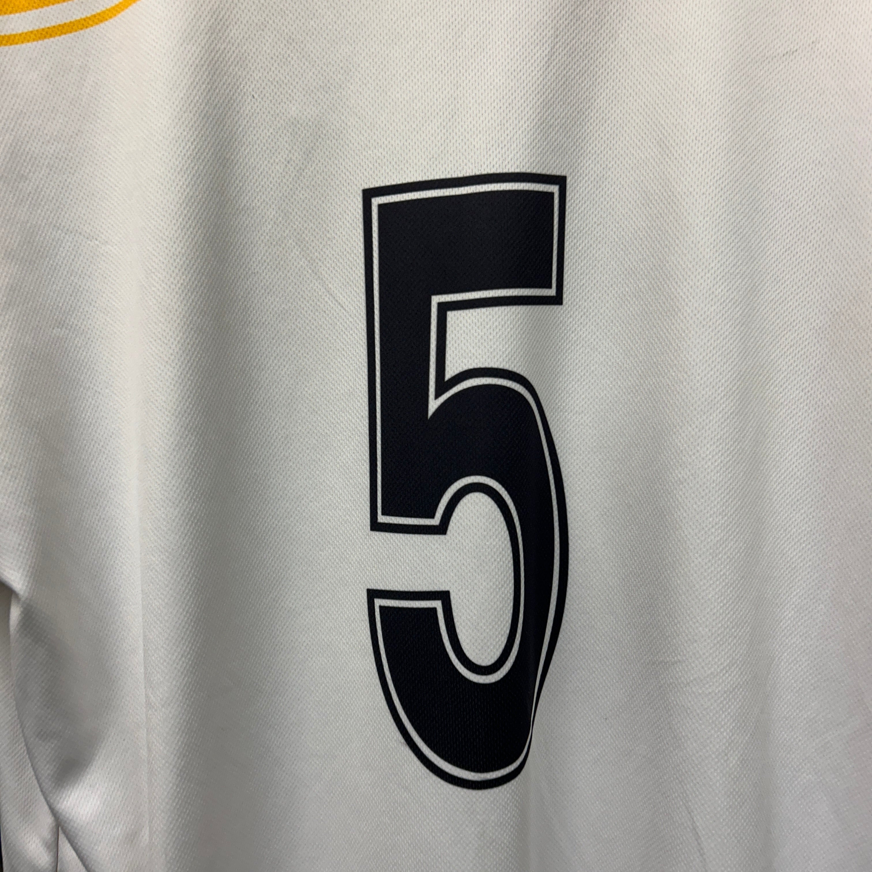 Product details: Azzurri short-sleeve football shirt in white with bold yellow shoulder yoke and chevron striping, plus yellow double-stripe sleeve cuffs. Printed 'AZZURRI' wordmark at chest, Defence Forces Ireland crest on the left chest and a starburst-style badge on the right chest. Large black number '5' print on back. Lightweight textured mesh performance fabric; heat-pressed style graphics. Brand: Azzurri.| Label Size | |