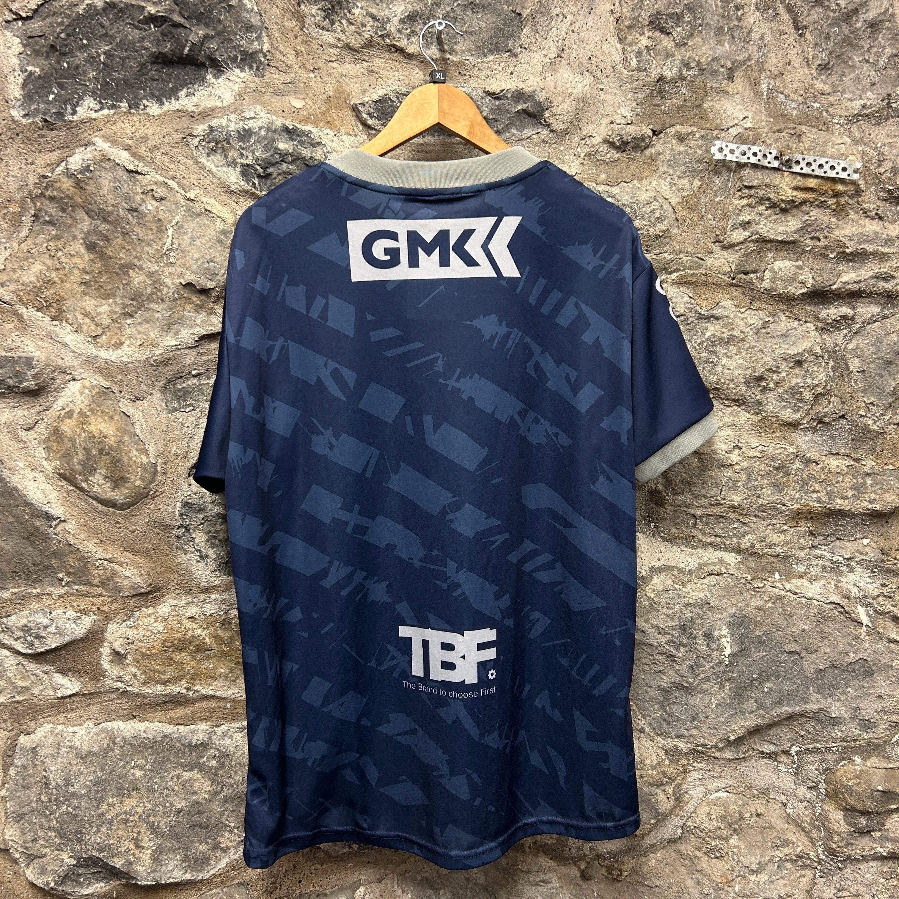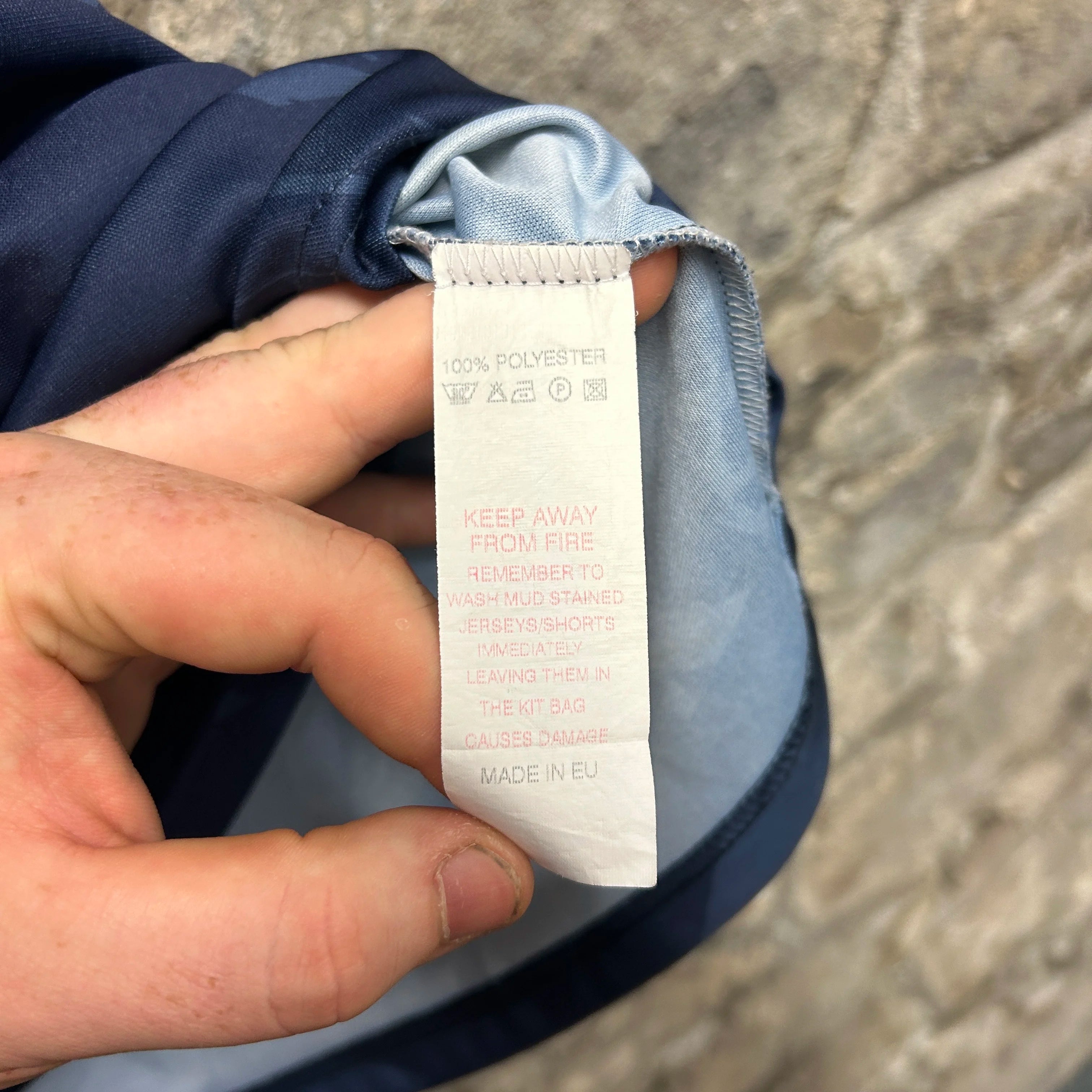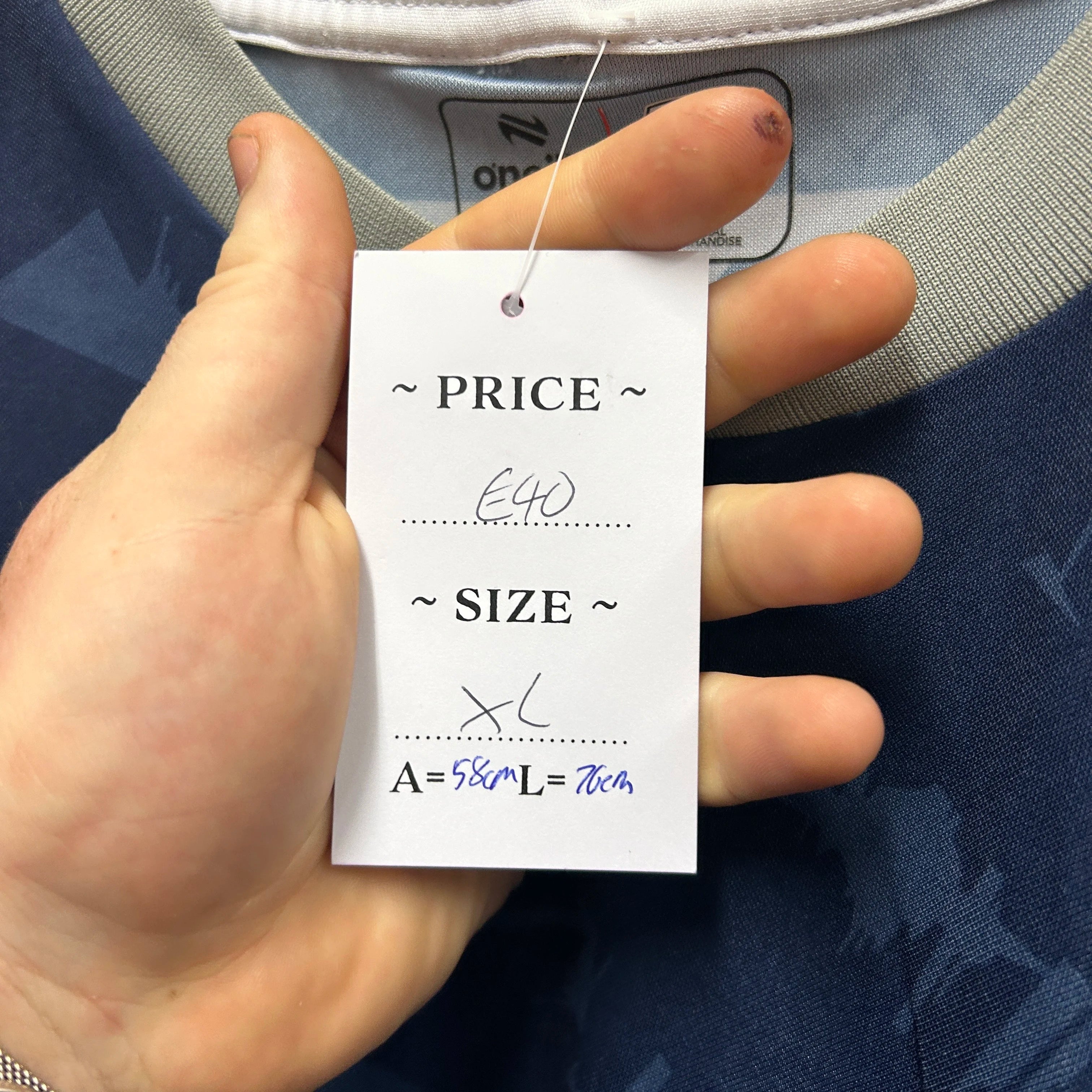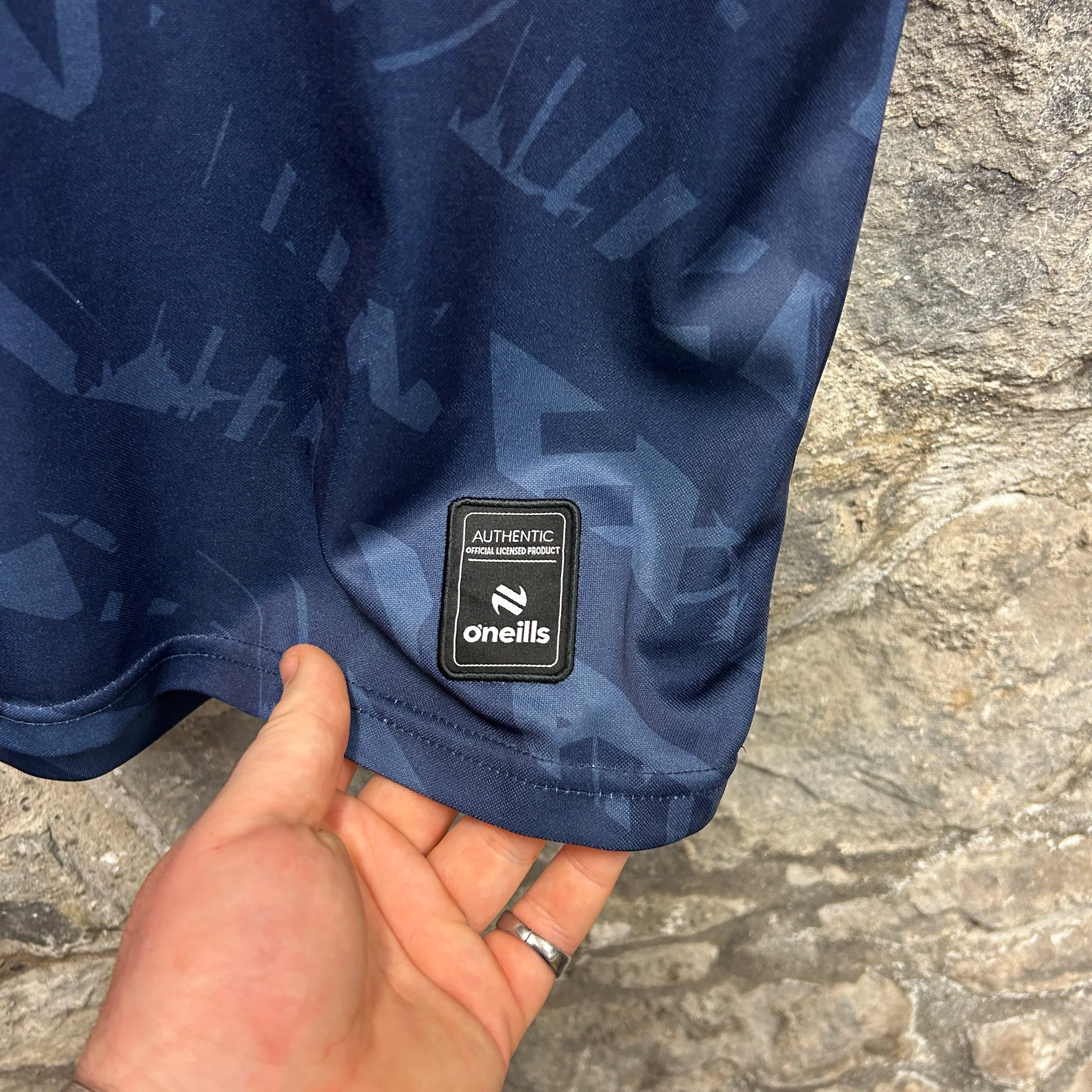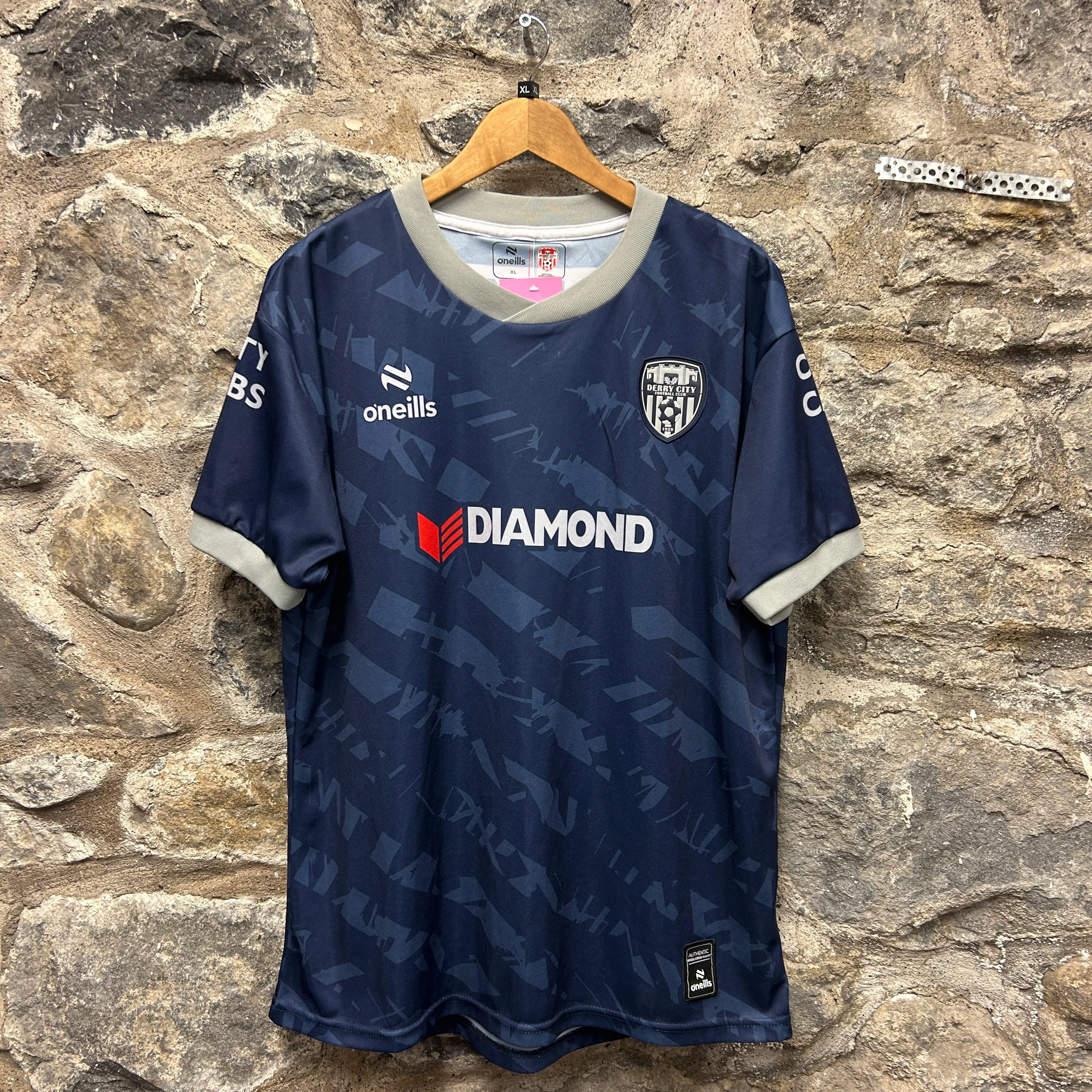 Product details: Navy blue with tonal geometric print, light grey ribbed collar and sleeve cuffs, official Derry City badge and O'Neills branding, multiple sponsor logos, size XL, 100% polyester, made in EU, authentic tag on hem. Brand: O'neills.| Label Size | |