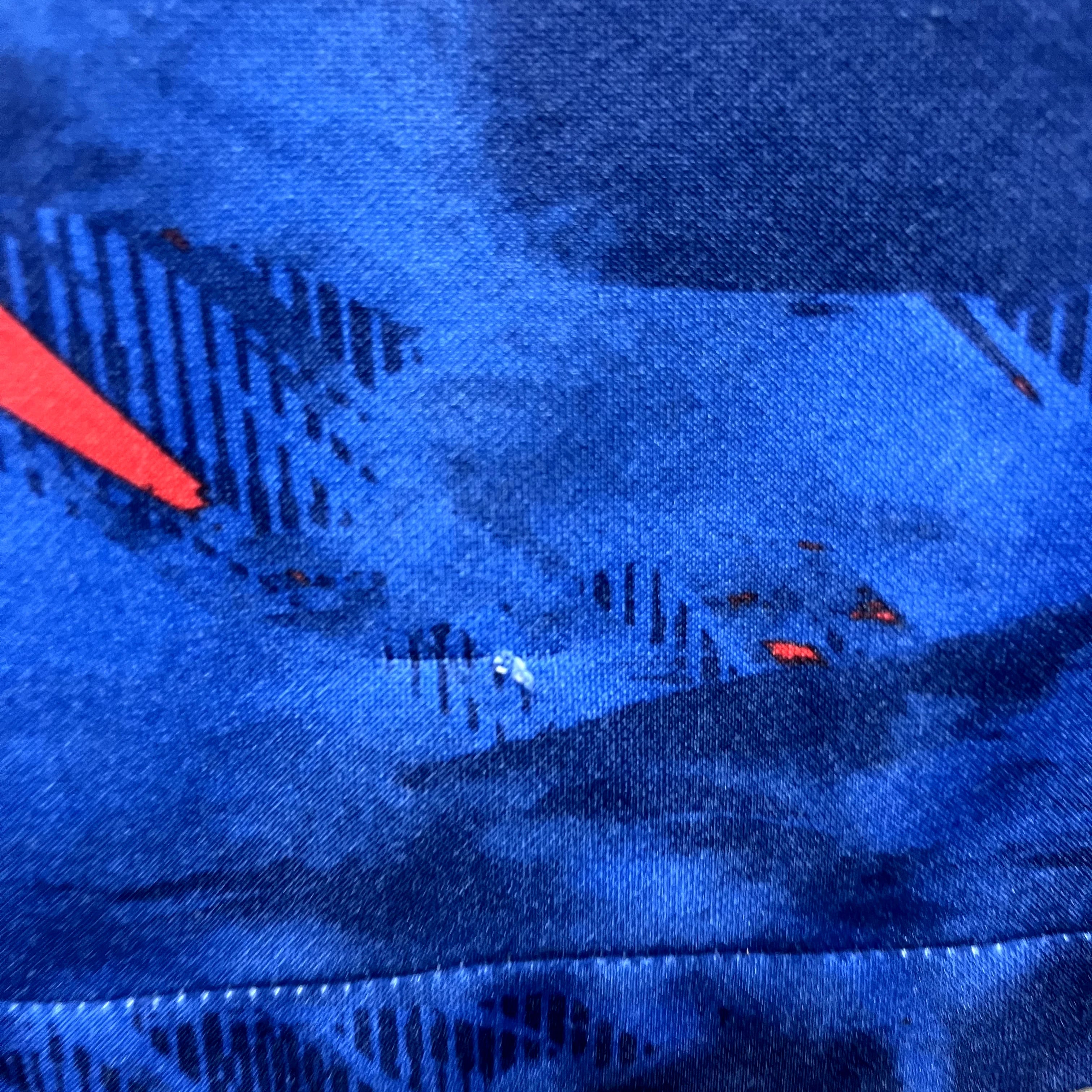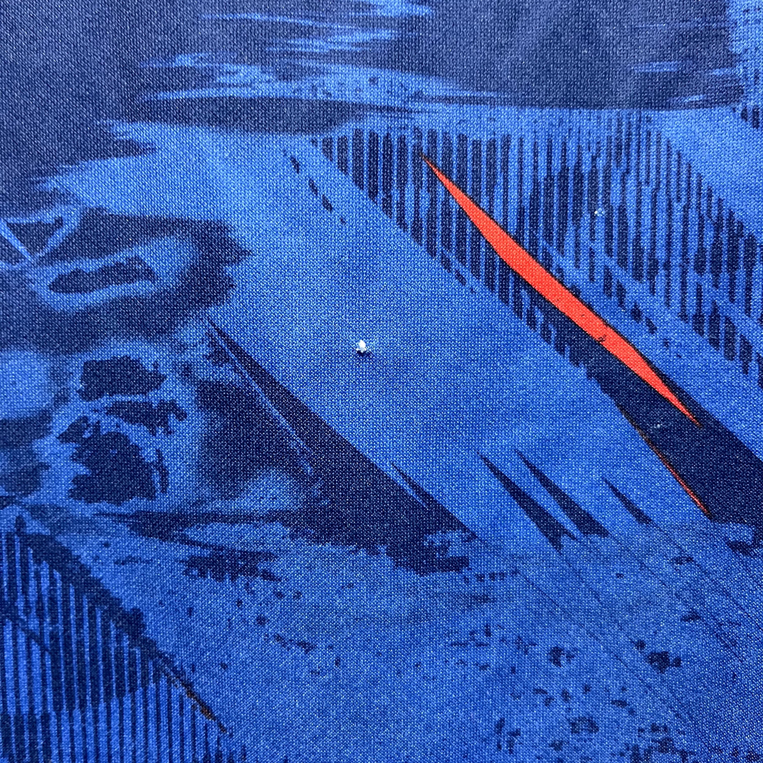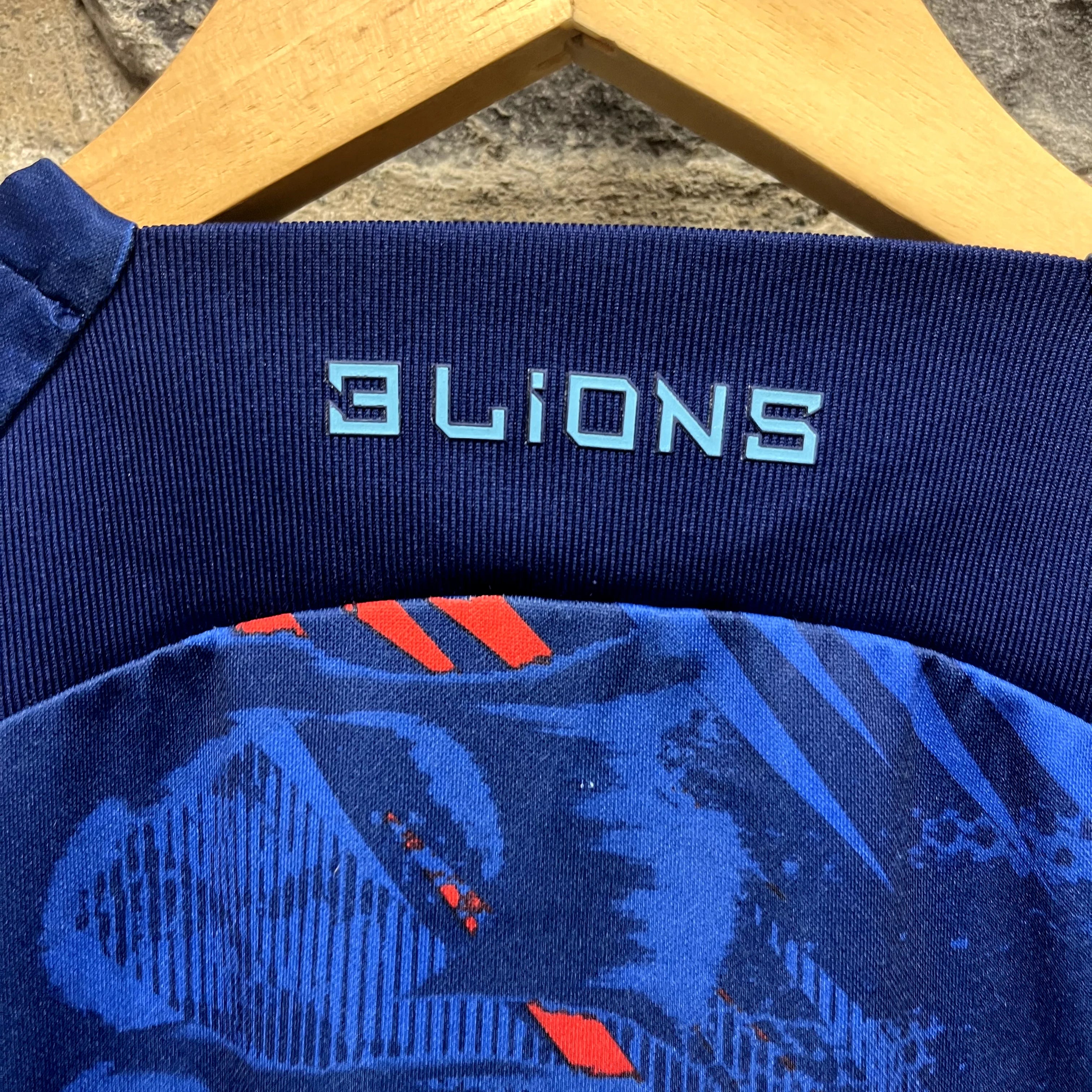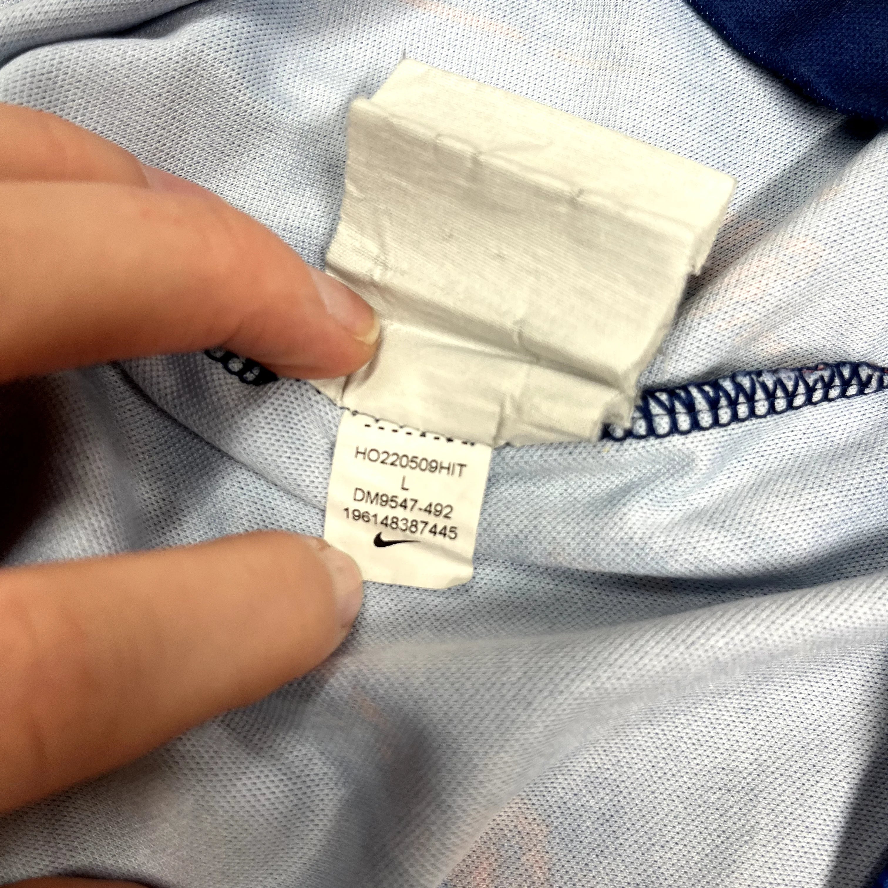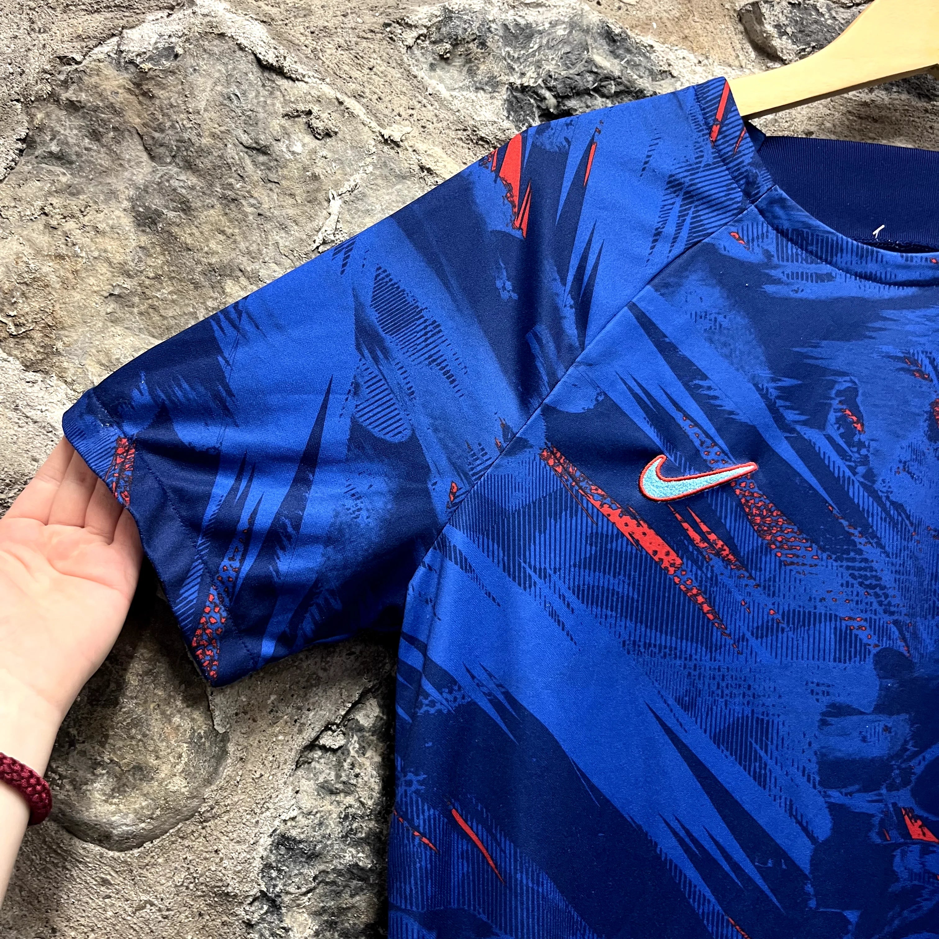 Product details: England 3 Lions football shirt, dynamic all-over blue/red pattern, Nike swoosh, raglan short sleeves, embroidered badge, ribbed collar, "3 LIONS" print at back collar, sports polyester with visible pulls, vintage tag from Irish Dogs. Brand: Nike.| Label Size | |