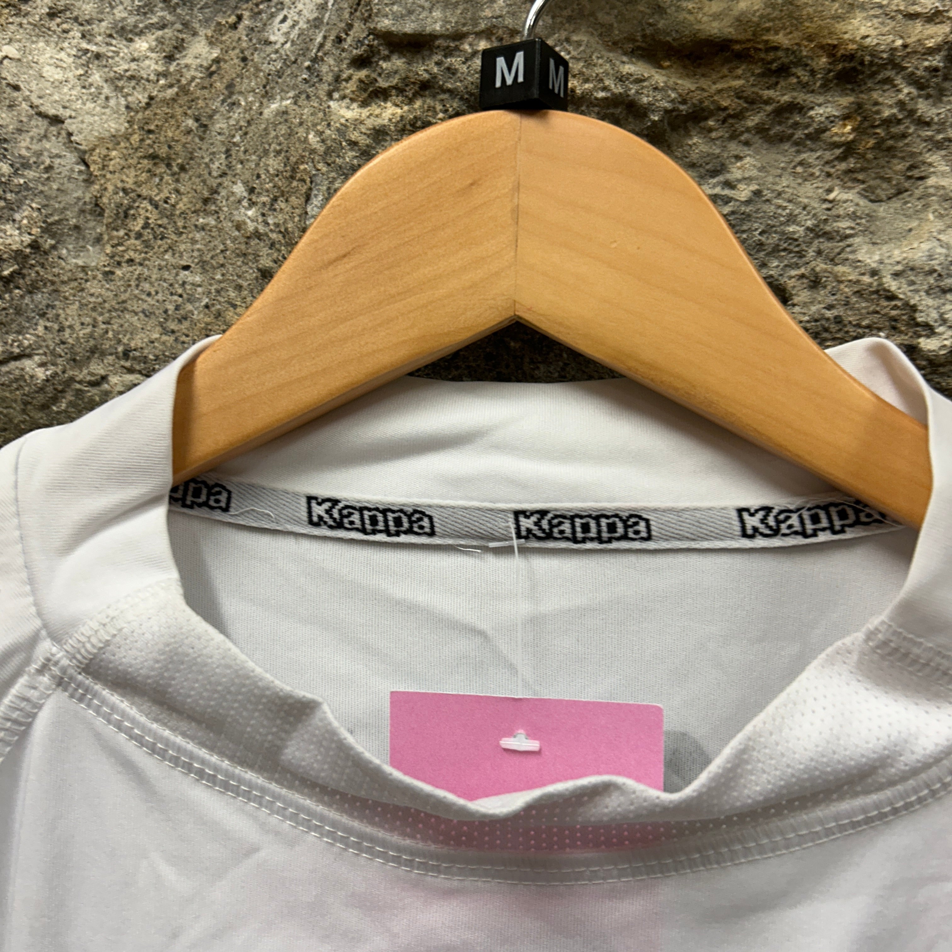 Product details: White FC København football shirt by Kappa with large black Carlsberg sponsor print on front and smaller Carlsberg print on upper back. Embroidered FC København crest on chest, blue Kappa logo embroidery on chest and both sleeves. Raglan cut with breathable mesh side panels and a large perforated mesh back panel; short sleeves and mock neck/crew style collar. Brand: Kappa.| Label Size | |