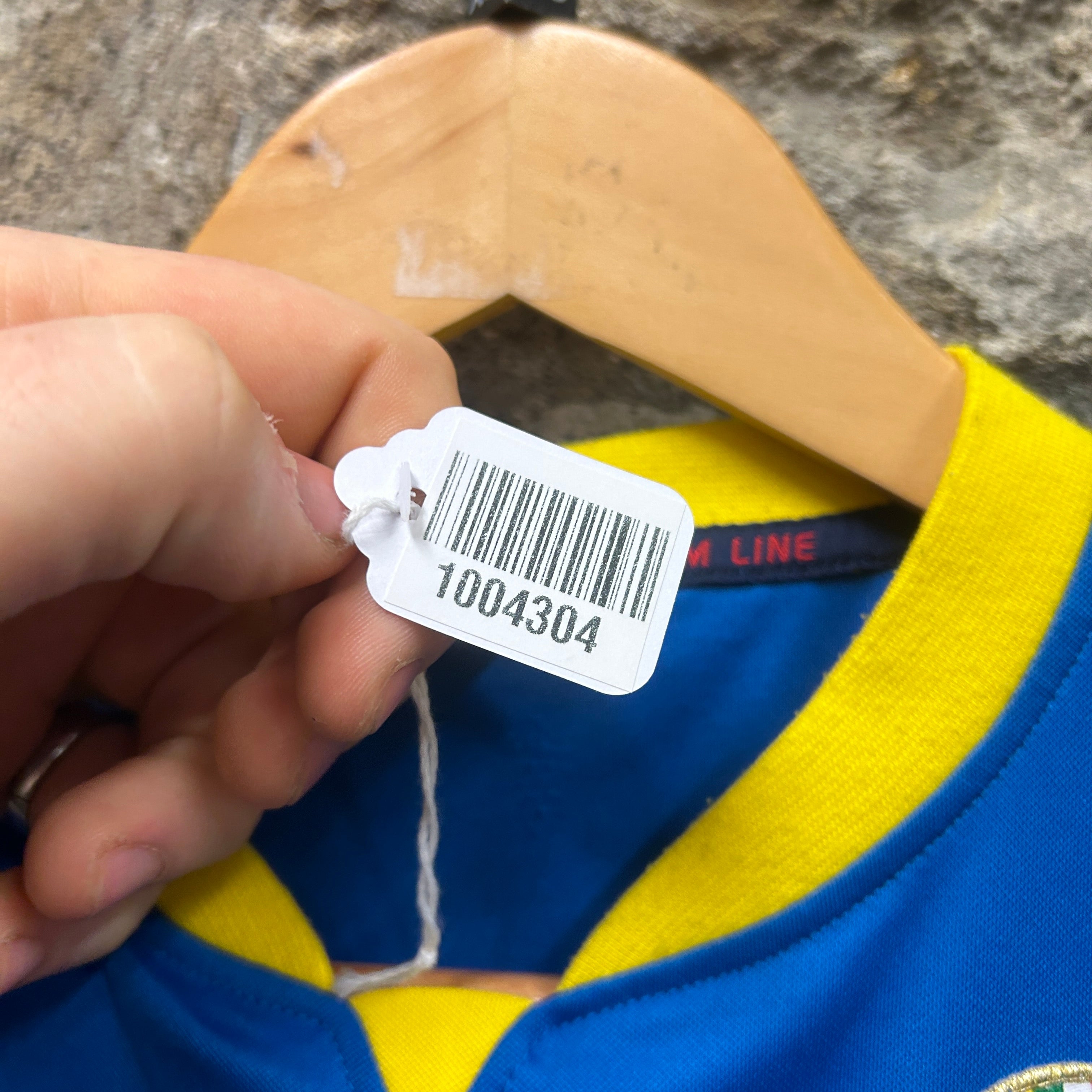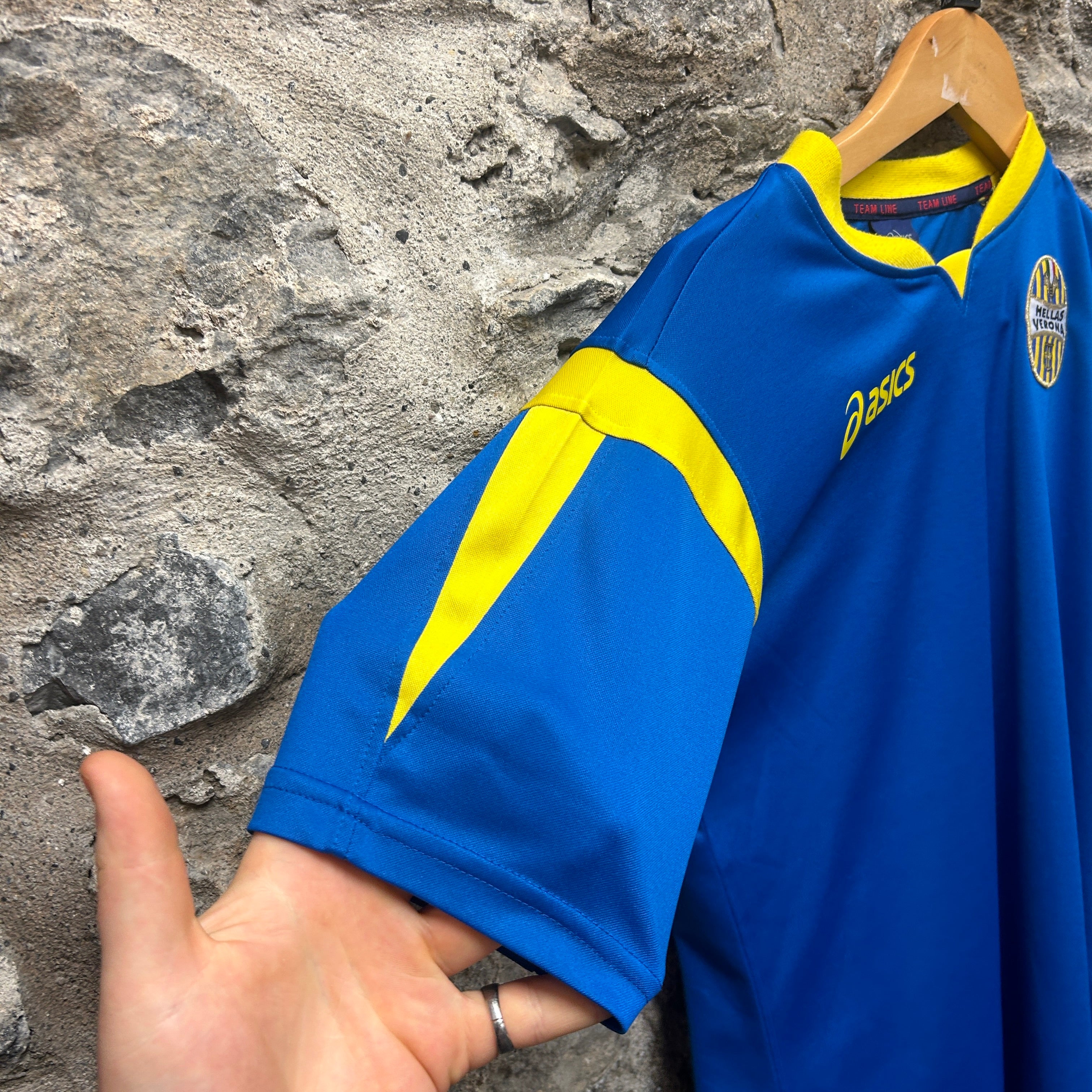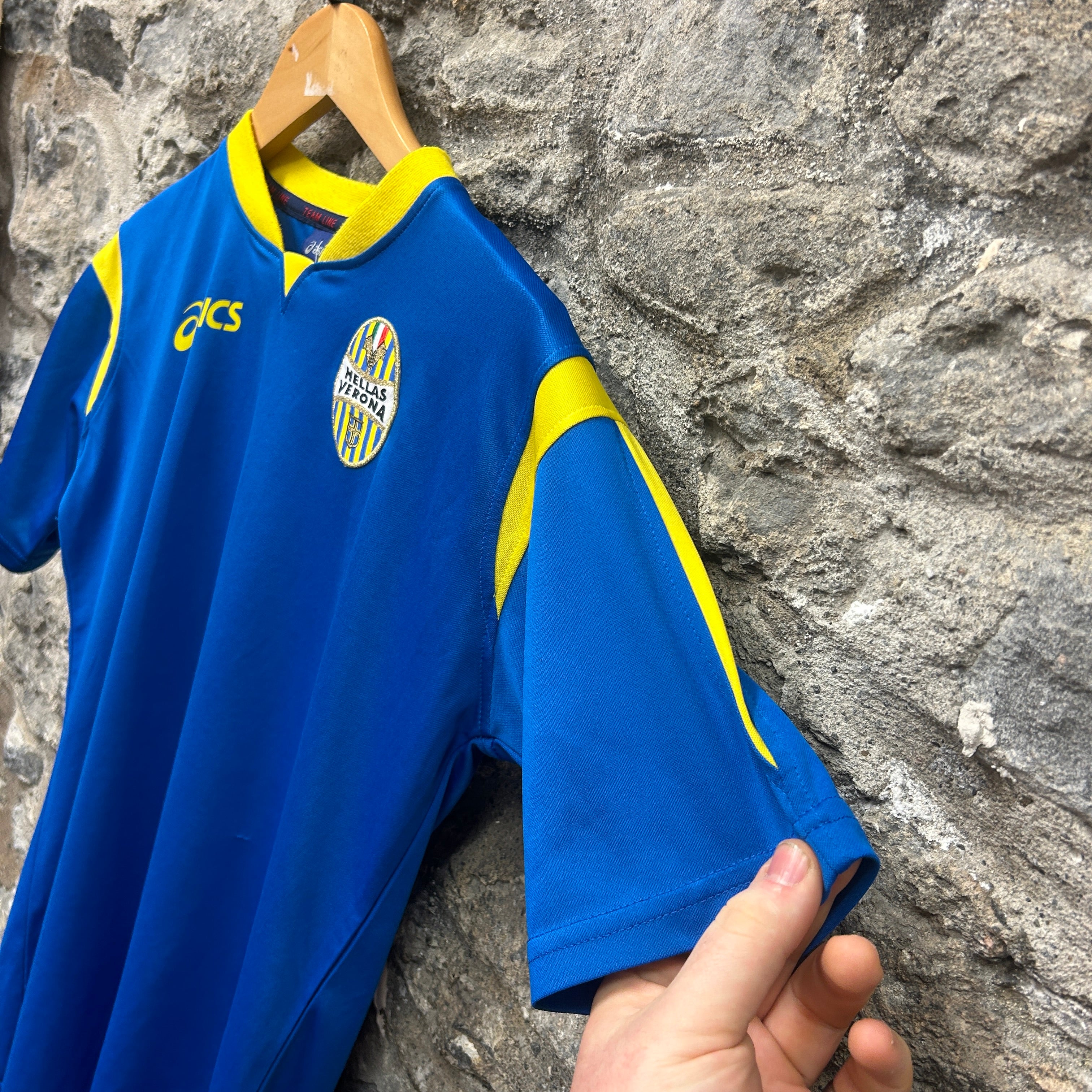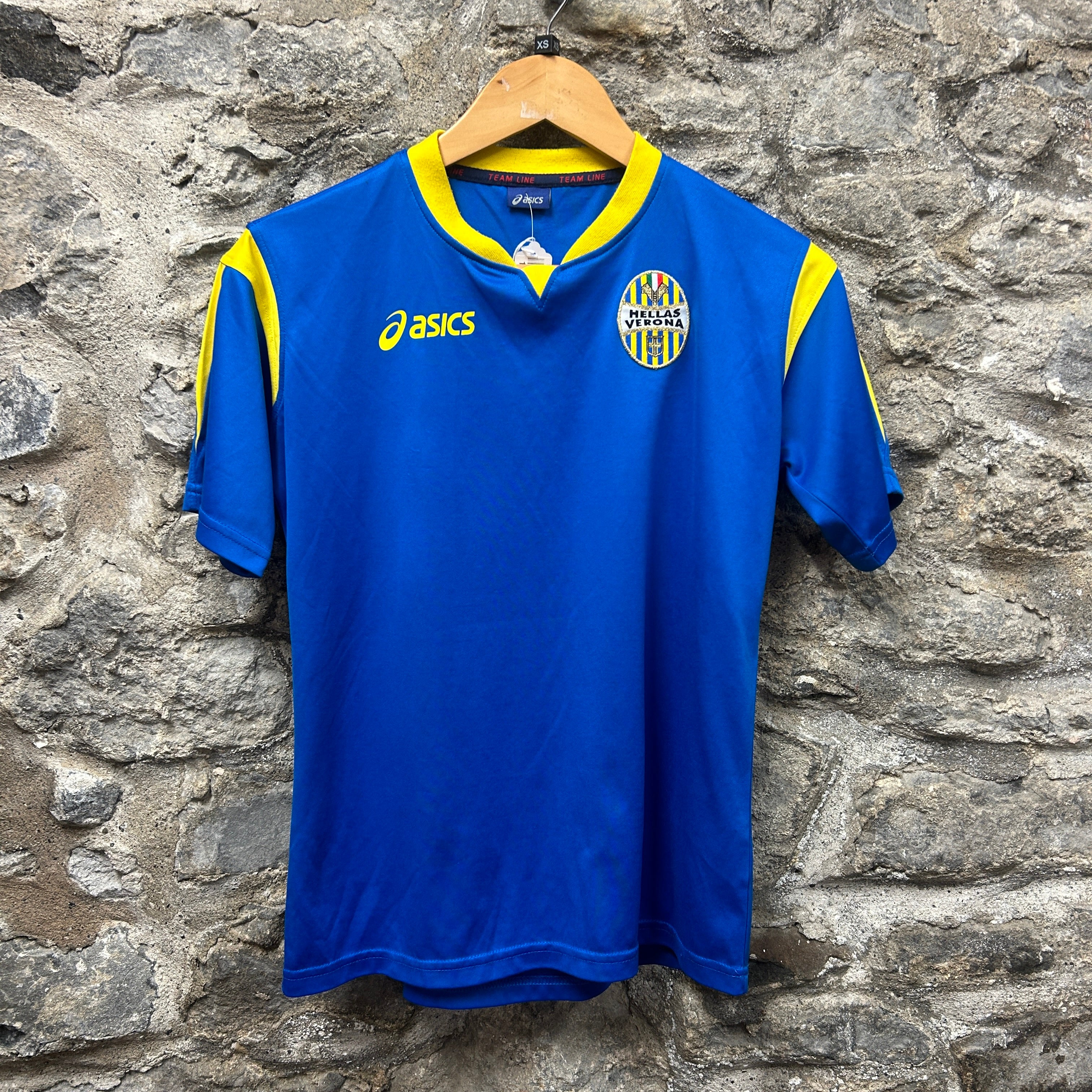 Product details: Asics Team Line football/soccer shirt in royal blue with bright yellow V-notch collar insert and shoulder panels. Embroidered Hellas Verona club crest on chest and yellow Asics logo print. Short sleeves, lightweight performance-style fabric; plain back with no name/number. Brand: Asics.| Label Size | |