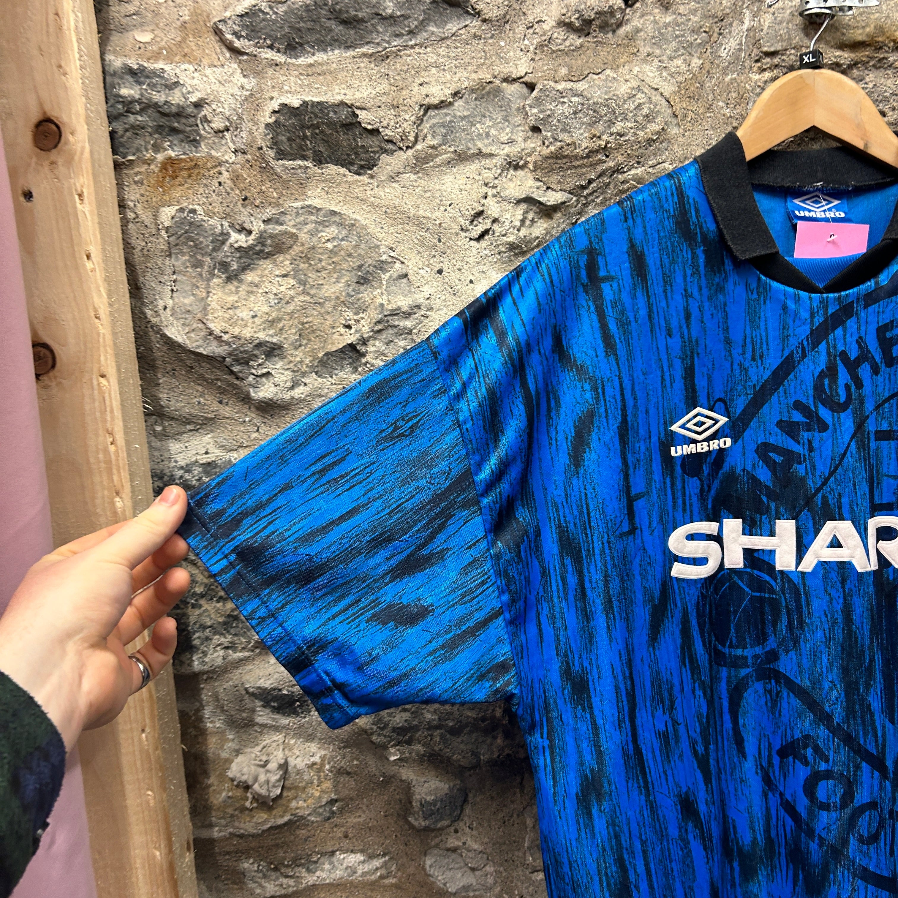 Product details: Umbro Manchester United away football shirt with black ribbed polo collar and V-insert. All-over blue/black abstract brushstroke print with oversized tonal Manchester United crest graphic in the background. Embroidered Umbro logo at chest, stitched Manchester United badge, and raised/embroidered-look "SHARP" sponsor across front. Short sleeves; size tag shows XL Mens (172cm) and "Made in England." Brand: Umbro.