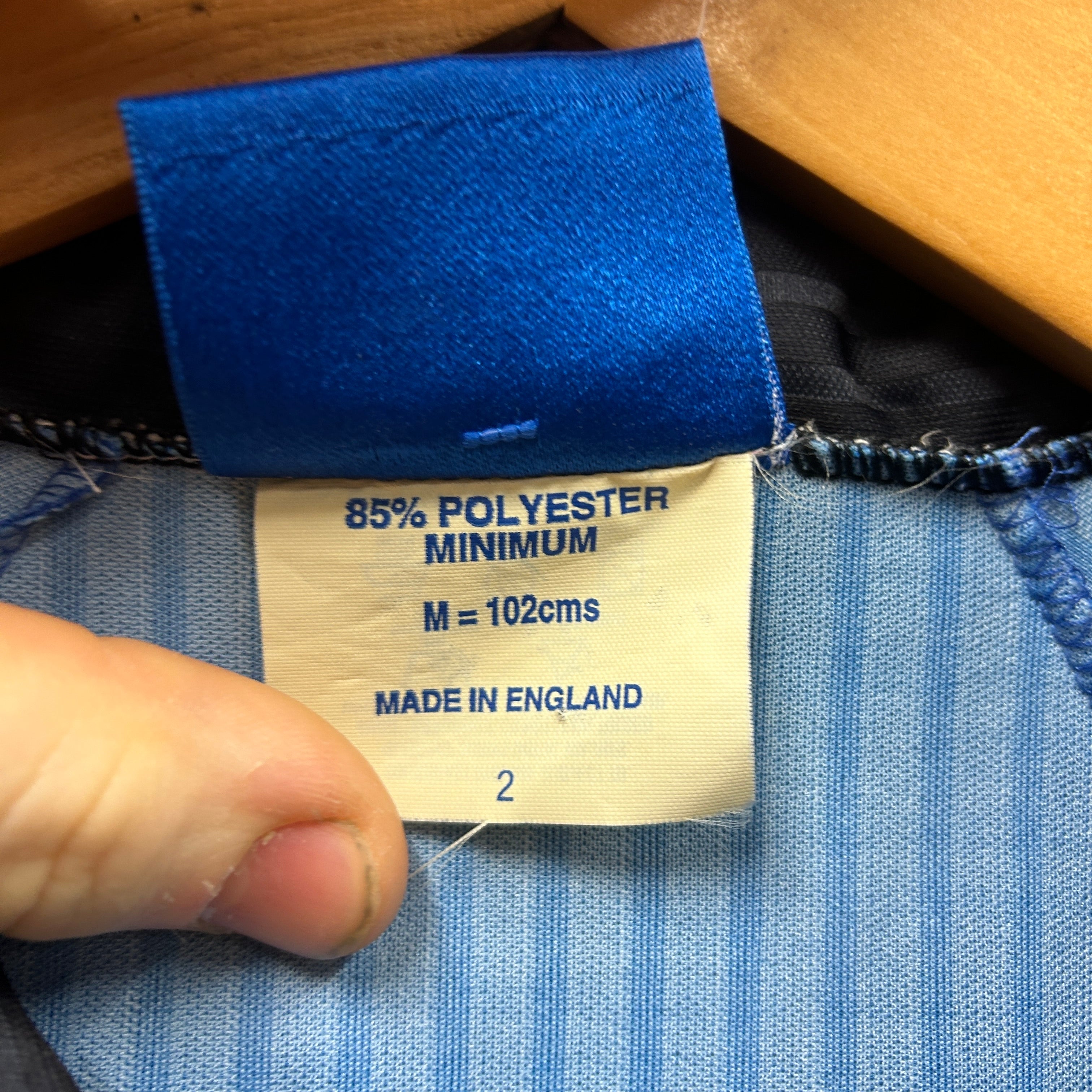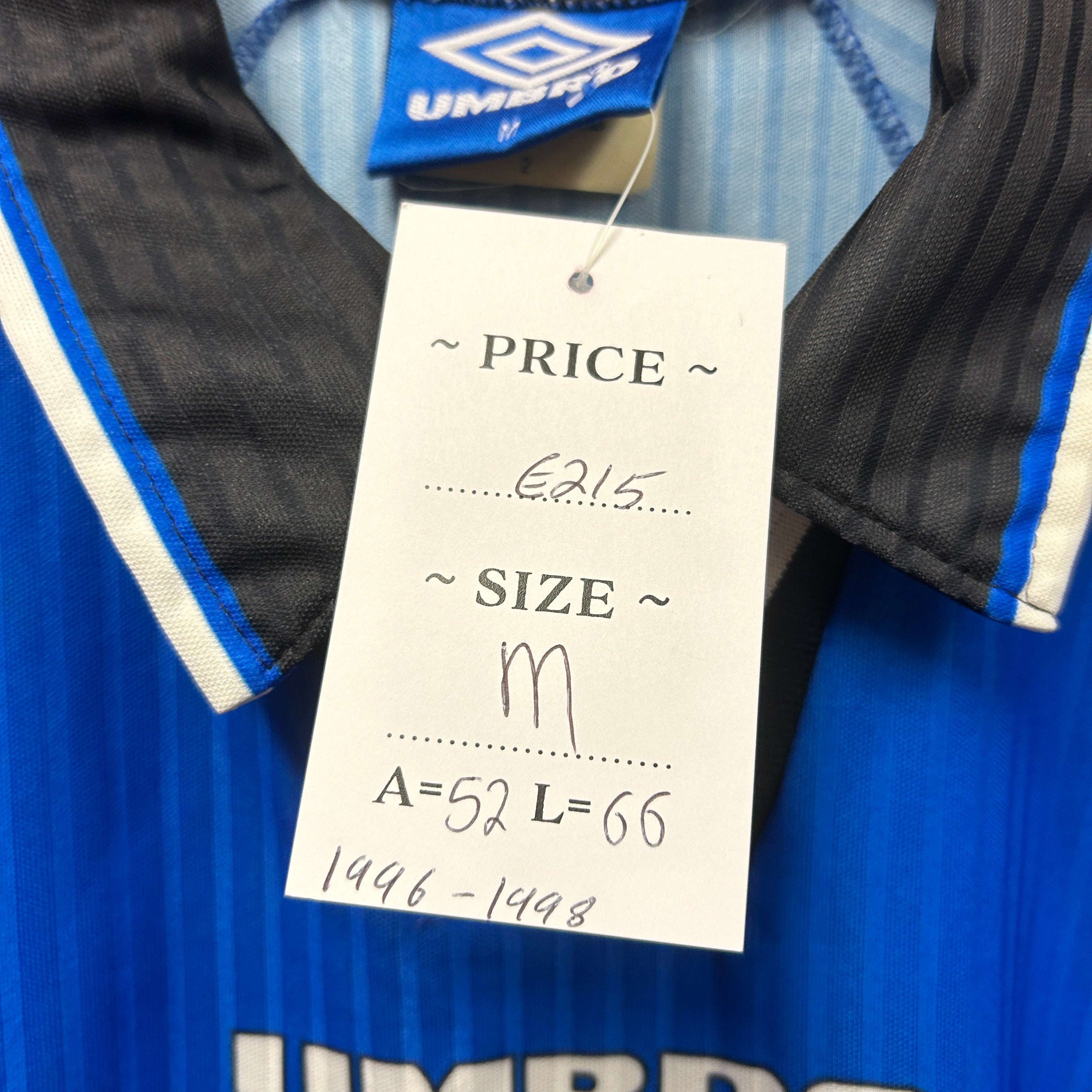 Product details: Vintage Umbro Manchester United football shirt in royal blue with tonal vertical pinstripe jacquard fabric. Features black fold-over collar with white piping, V-insert neckline with black/white trim and a Manchester United crest button at the top. Front has embroidered Manchester United crest and printed 'UMBRO' plus large 'SHARP' sponsor; black/white/blue geometric sleeve panels and an Umbro 'Official Licensed Product / Performance Vapa Tech' print near the hem. Brand: Umbro.| Label Size | |