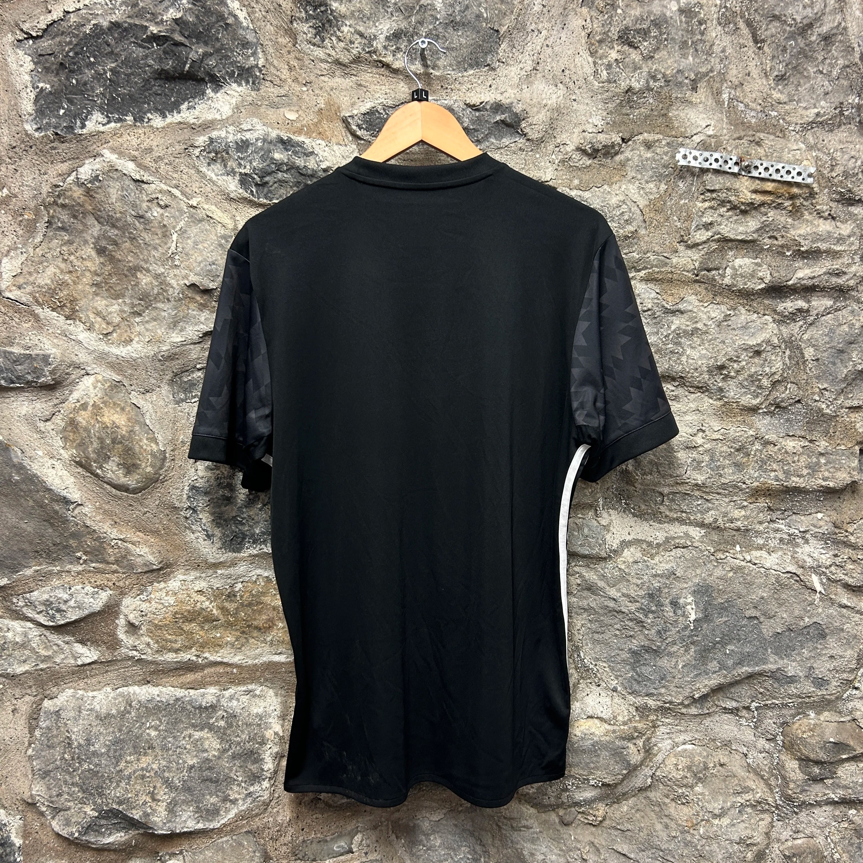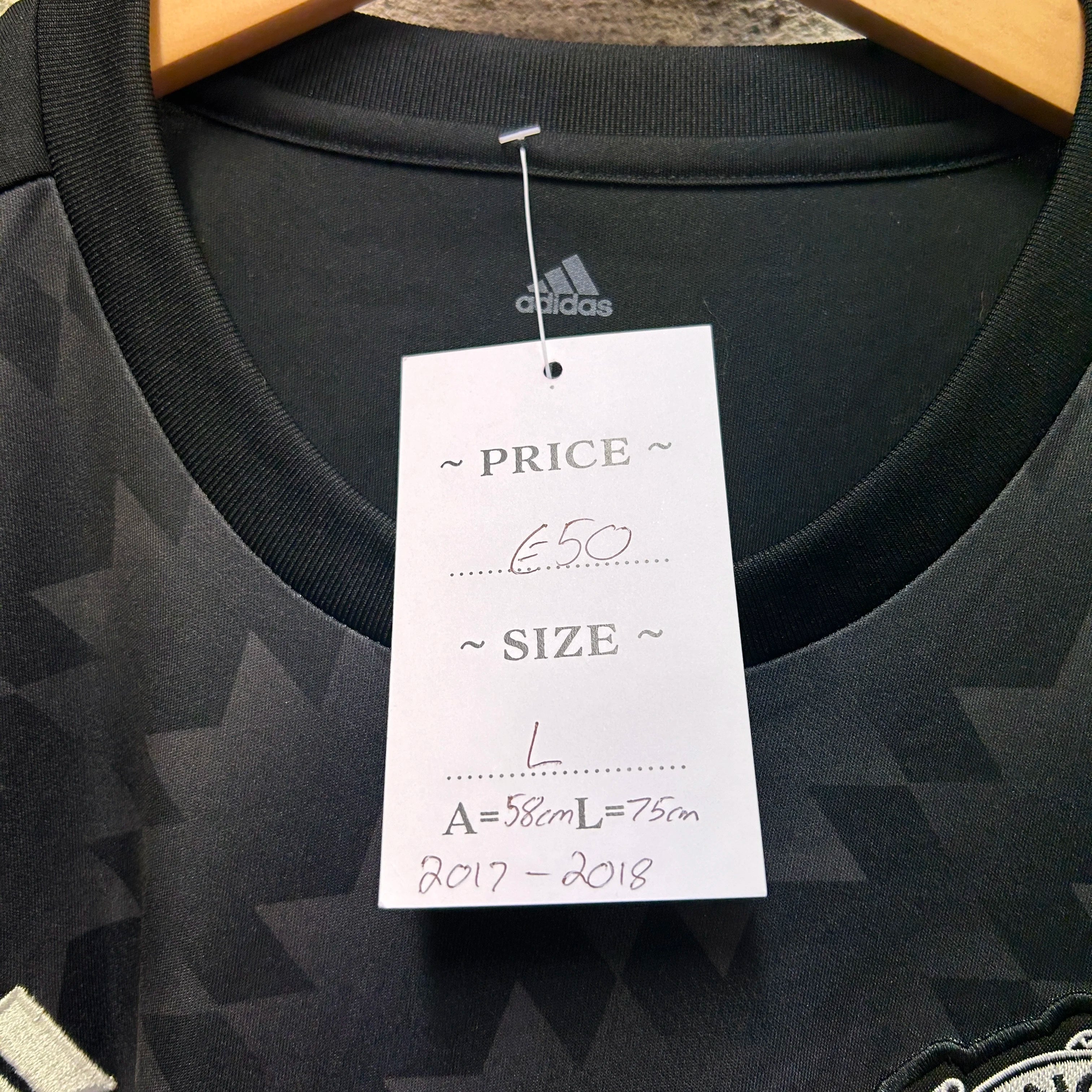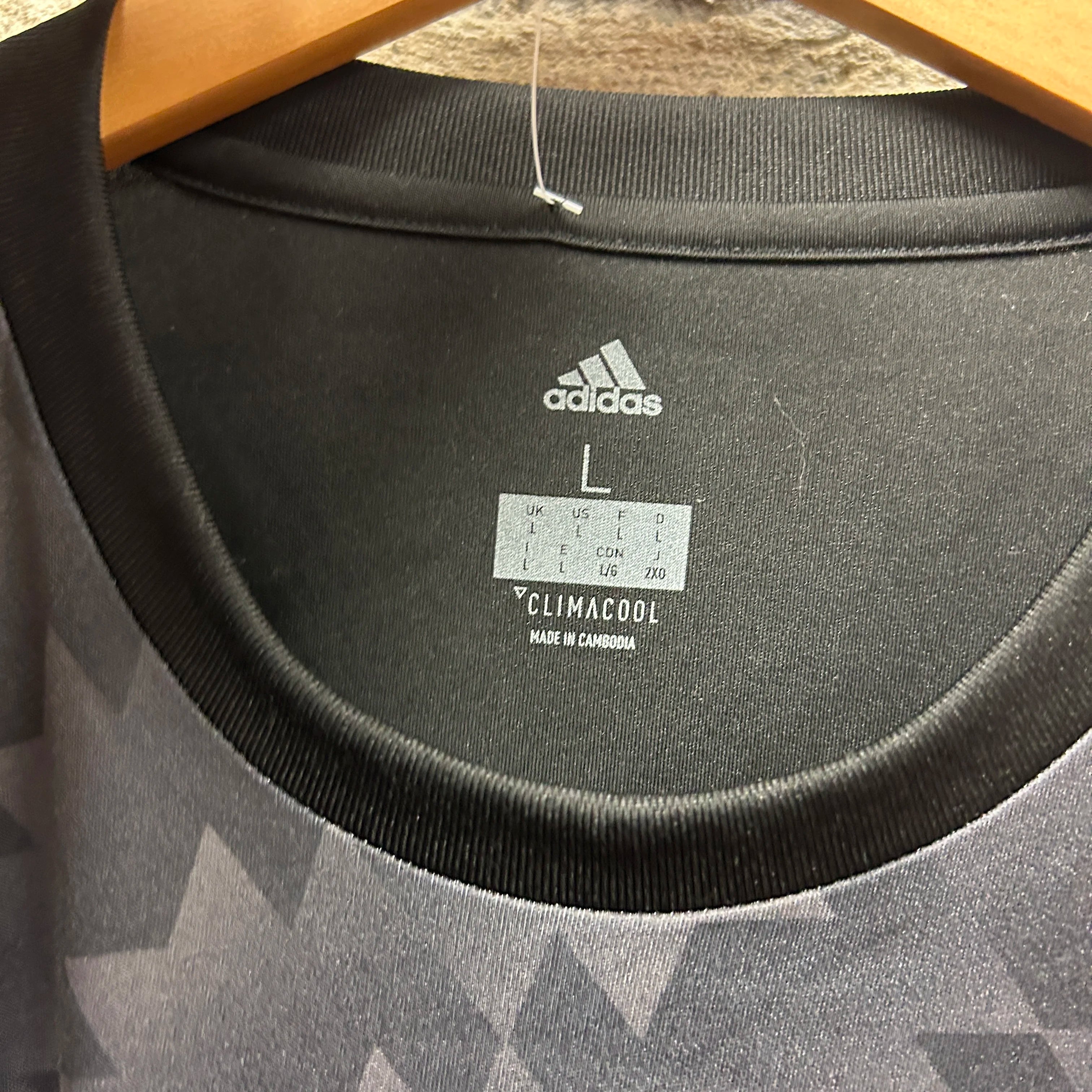 Product details: Black with tonal zigzag print, Manchester United club crest, Chevrolet sponsor, Adidas logo, Climacool marked fabric, white side stripes, short sleeves, crew neck. Brand: Adidas.| Label Size | |