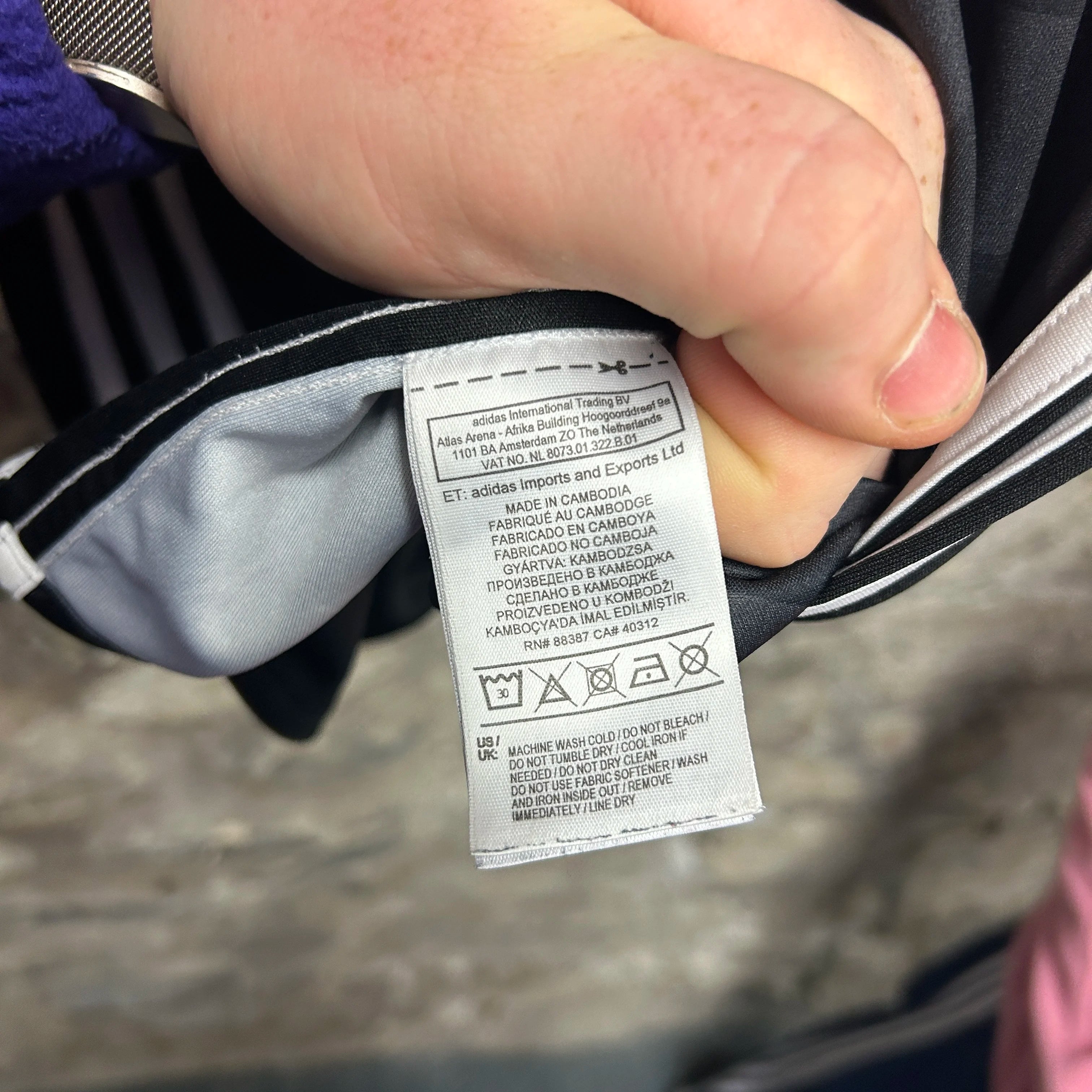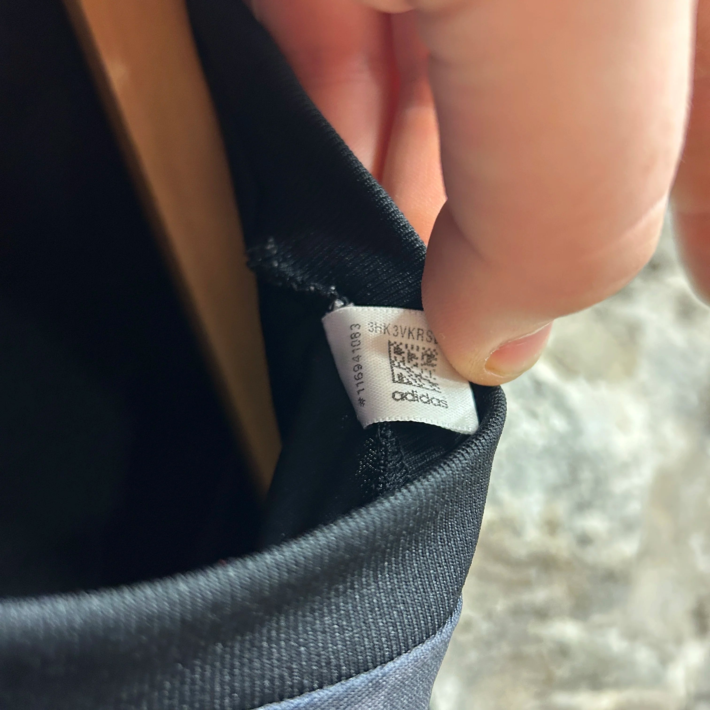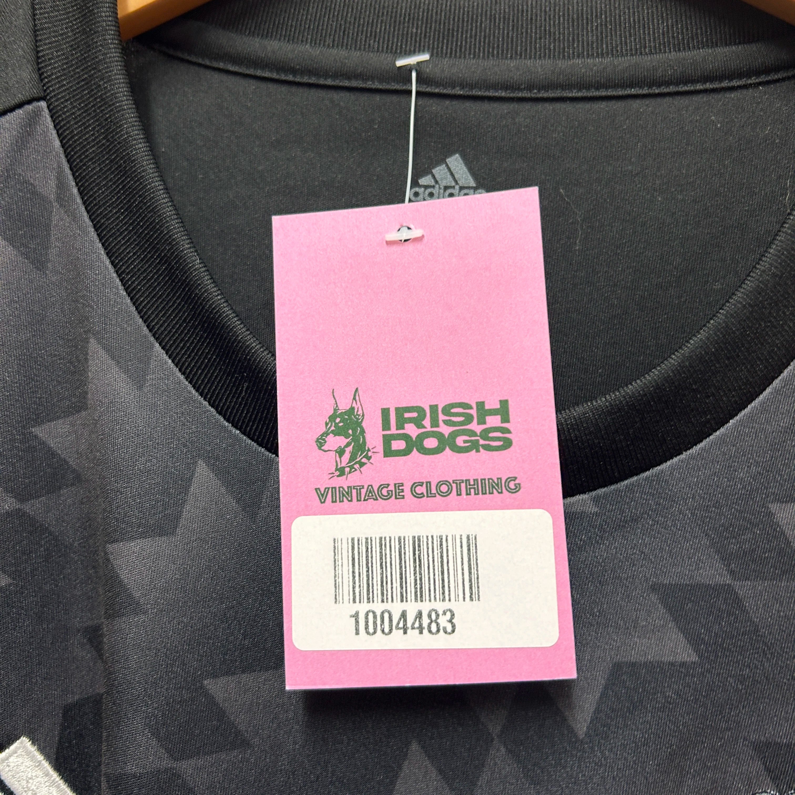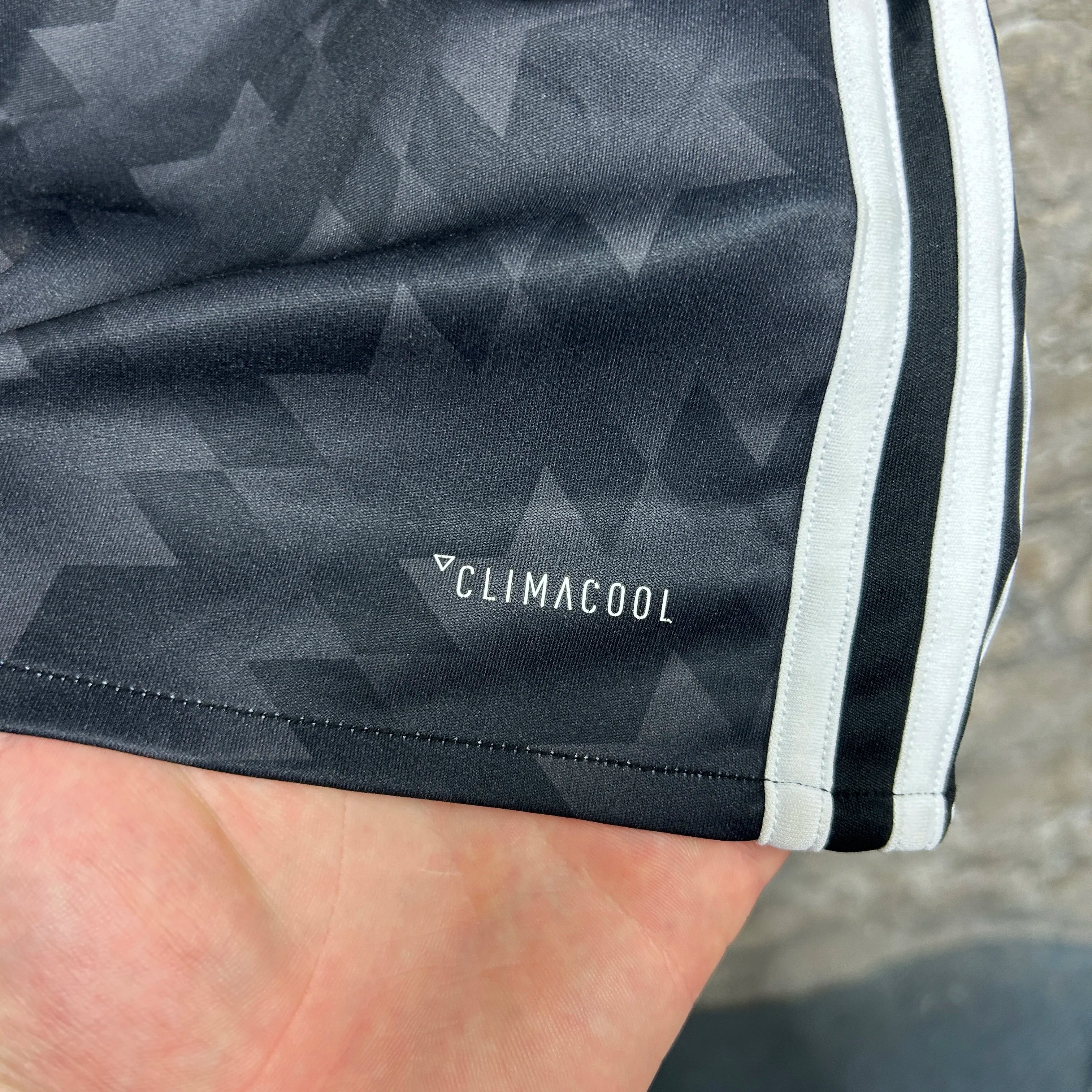 Product details: Black with tonal zigzag print, Manchester United club crest, Chevrolet sponsor, Adidas logo, Climacool marked fabric, white side stripes, short sleeves, crew neck. Brand: Adidas.| Label Size | |