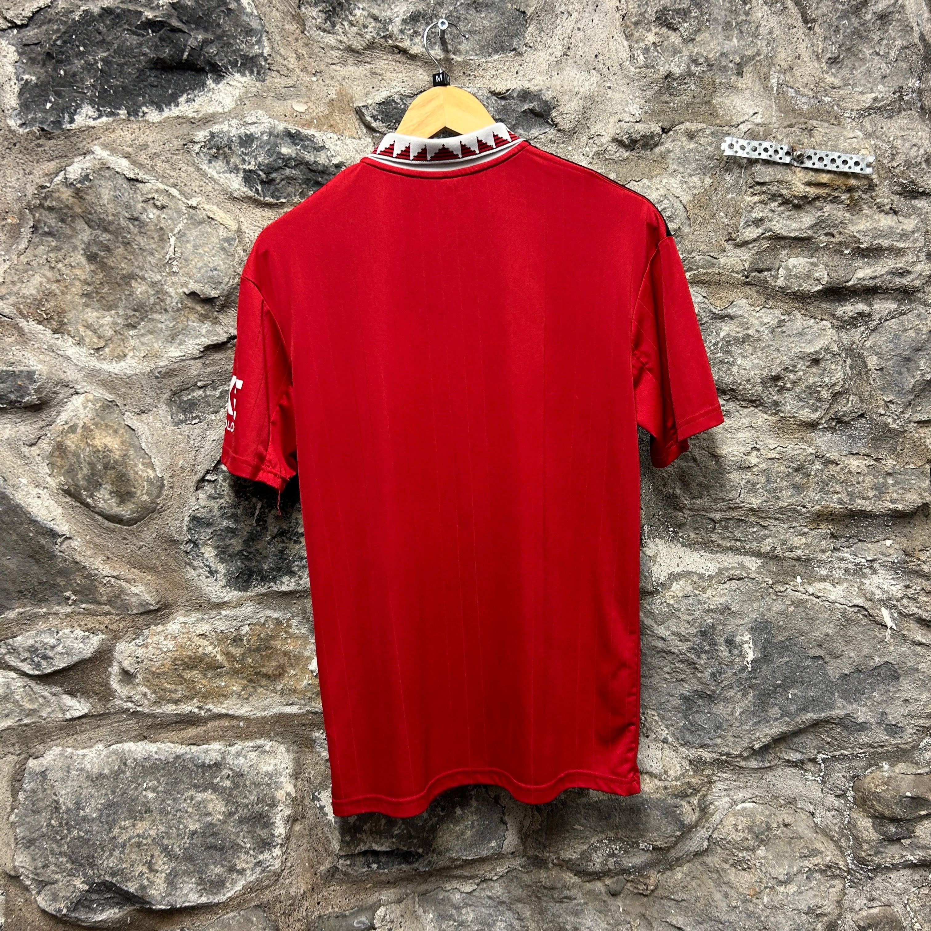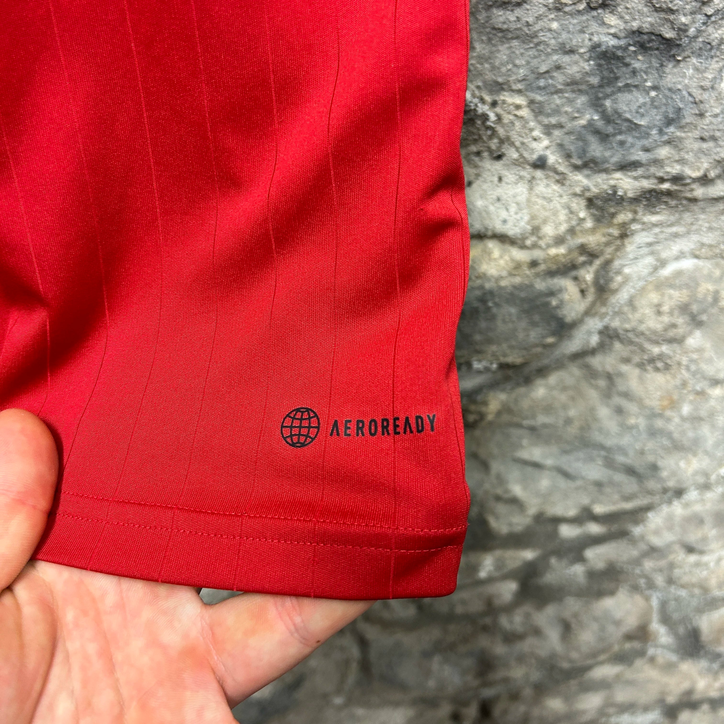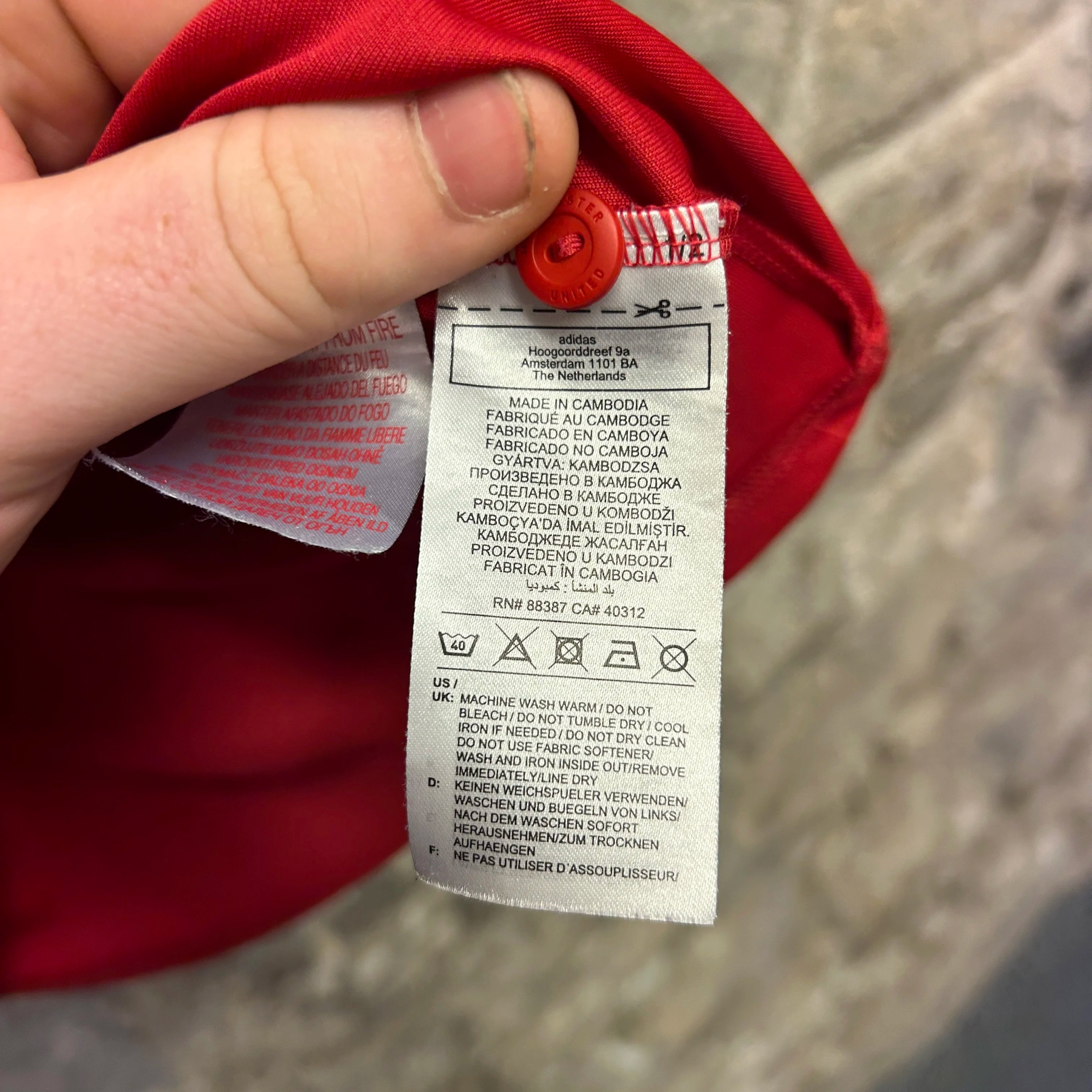 Product details: Red short sleeve football shirt with white and black contrast collar and embroidered triangular pattern. Manchester United crest and Adidas branding on chest, TeamViewer and DXC Technology sponsors printed on body and sleeve. Features AEROREADY fabric and "End Plastic Waste" internal neck print. Brand: Adidas.| Label Size | |
