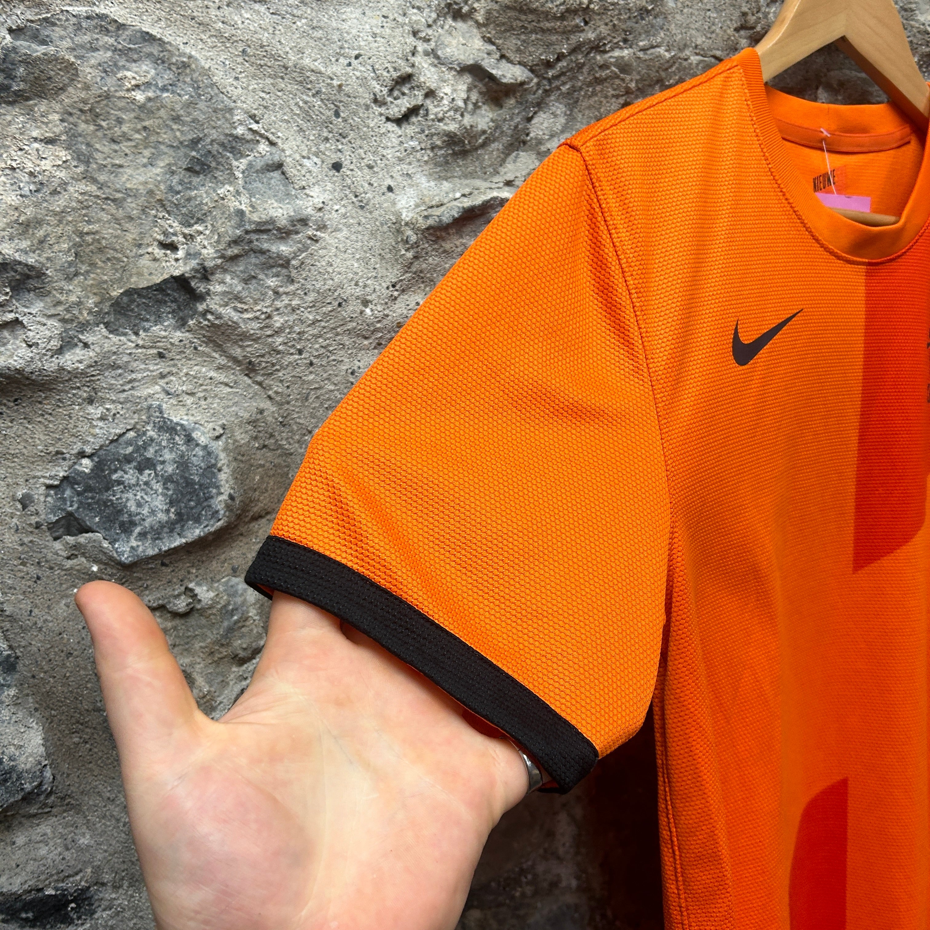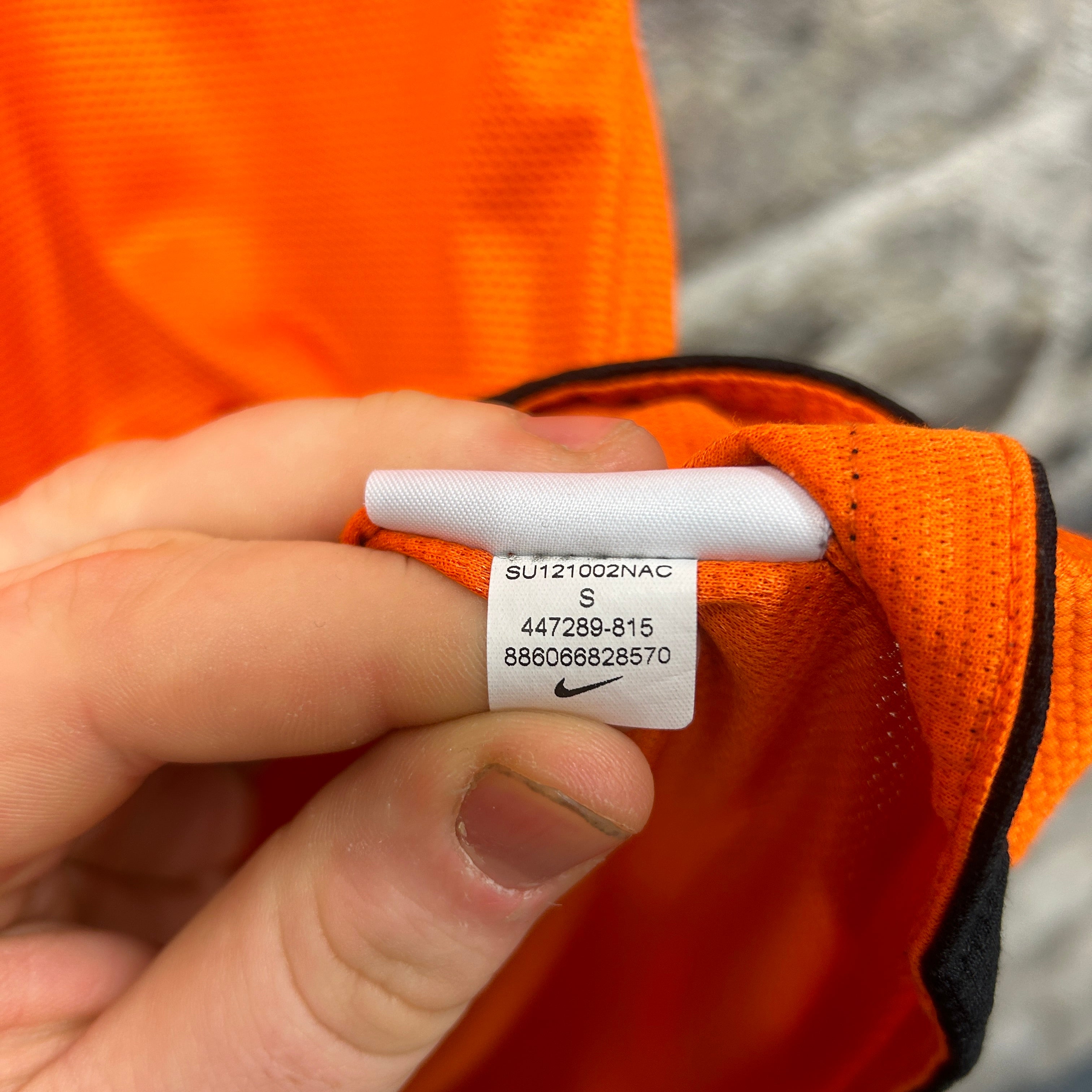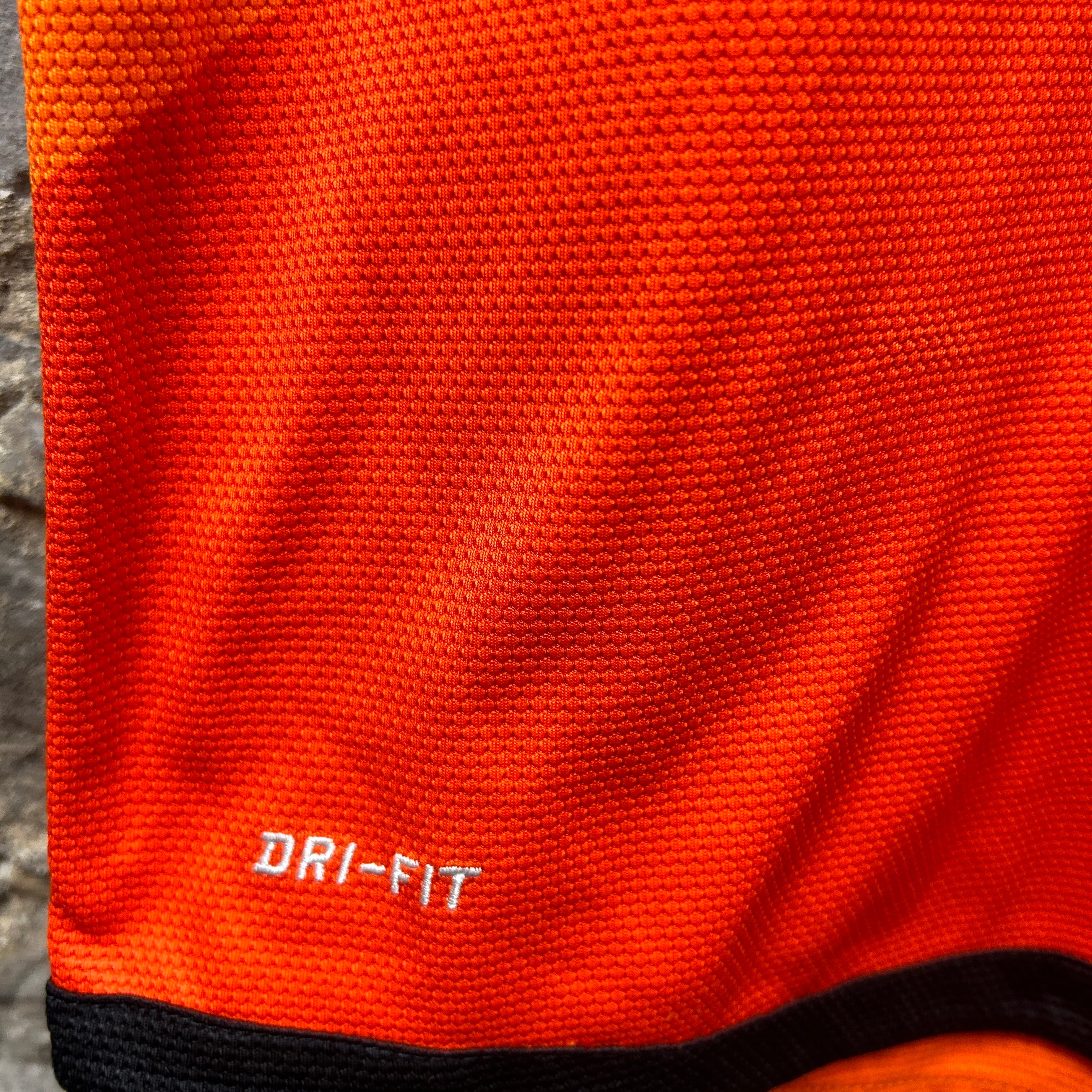Product details: Nike Netherlands (KNVB) Dri-FIT football shirt in bright orange with tonal geometric panel graphics; black Swoosh and KNVB crest print on chest; black contrast sleeve cuffs and hem; textured breathable mesh fabric; "AUTHENTIC" jock tag near hem; small pull/hole visible near the back neck seam in close-up. Brand: Nike.| Label Size | |