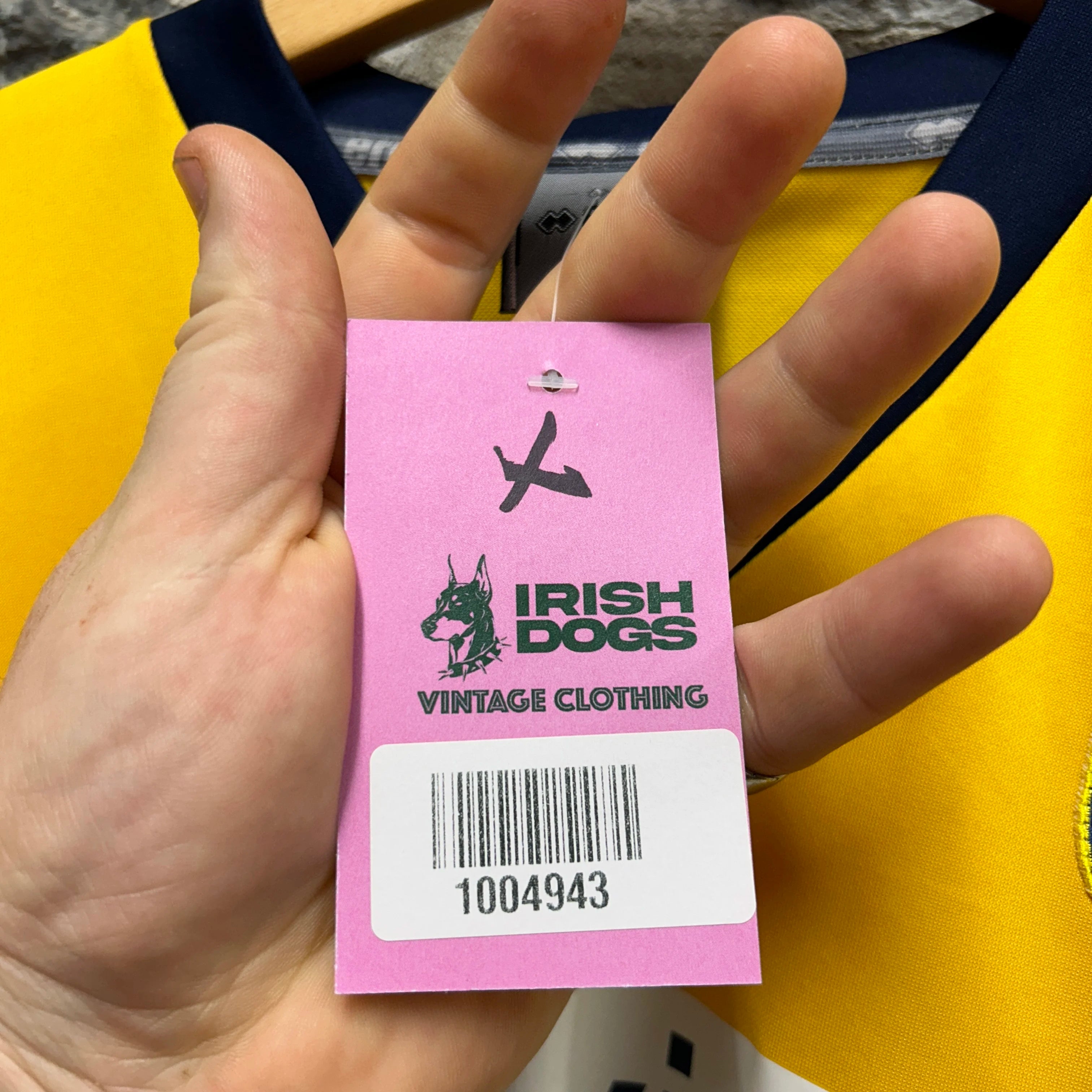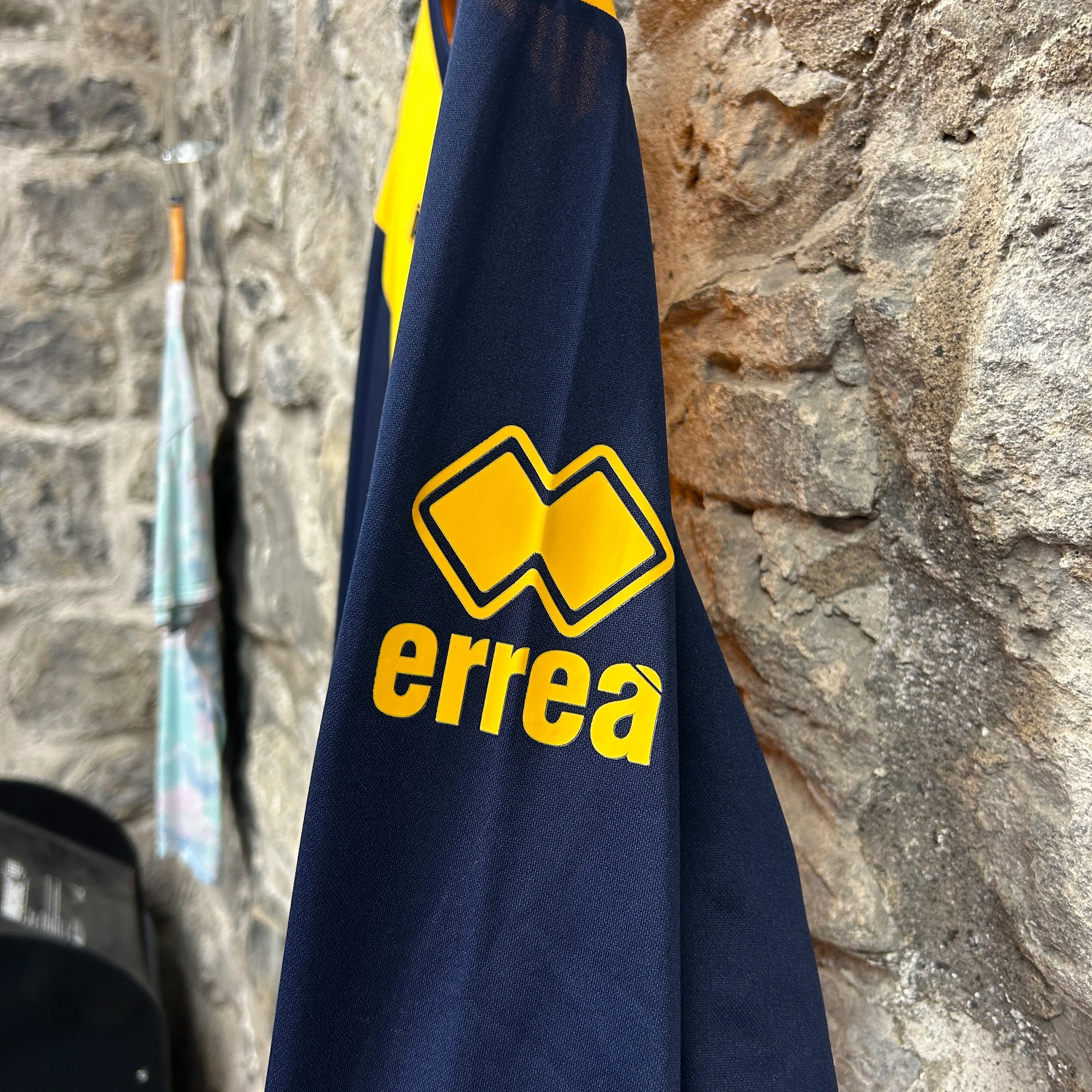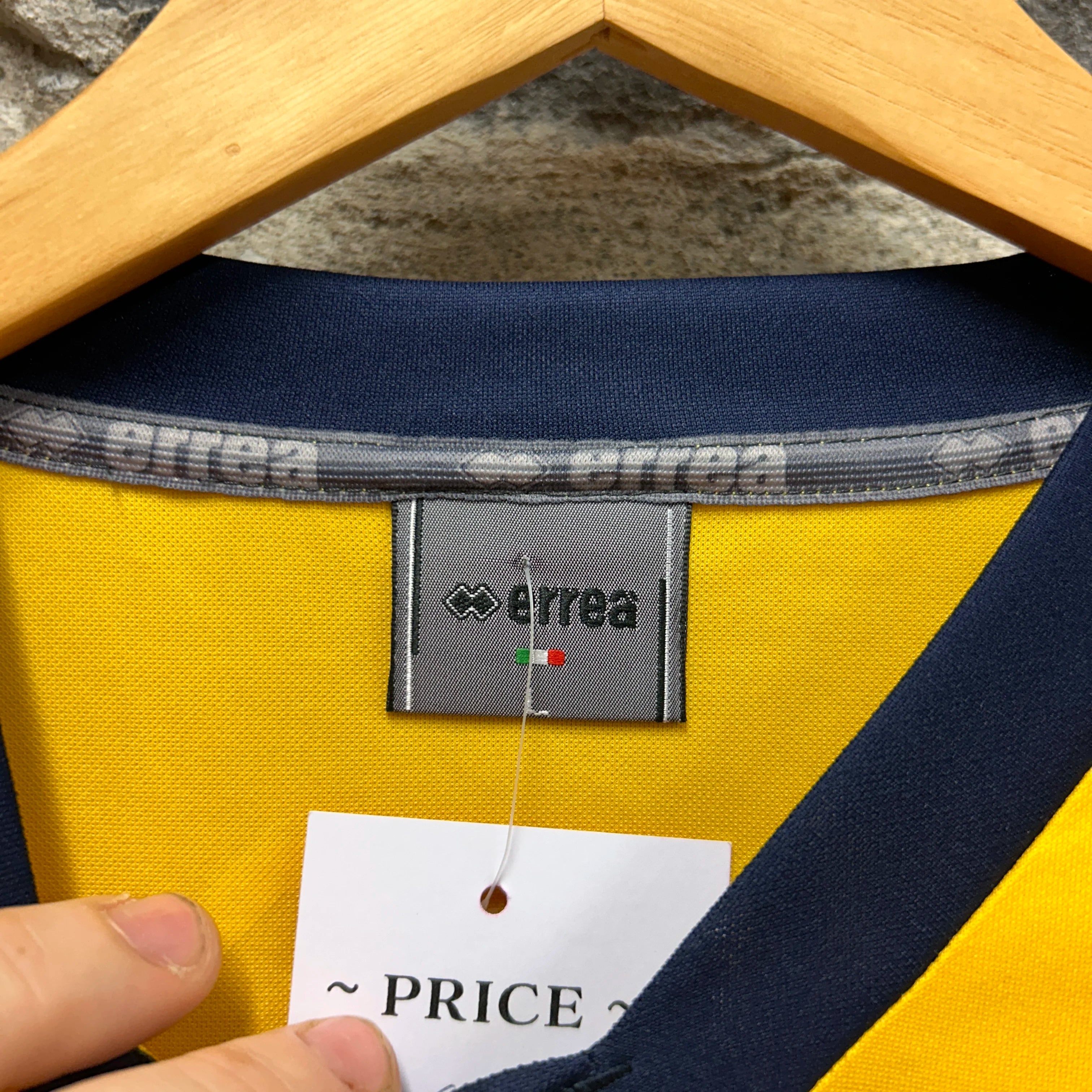 Product details: Yellow and navy long sleeve football shirt with v-neck, navy side inserts, embroidered Parma FC badge, Errea logo, and printed 'navigare' sponsor on the chest and back. Iconic Errea sleeve branding. Original tags present. Some wear to sponsor print. Brand: Errea.| Label Size | |