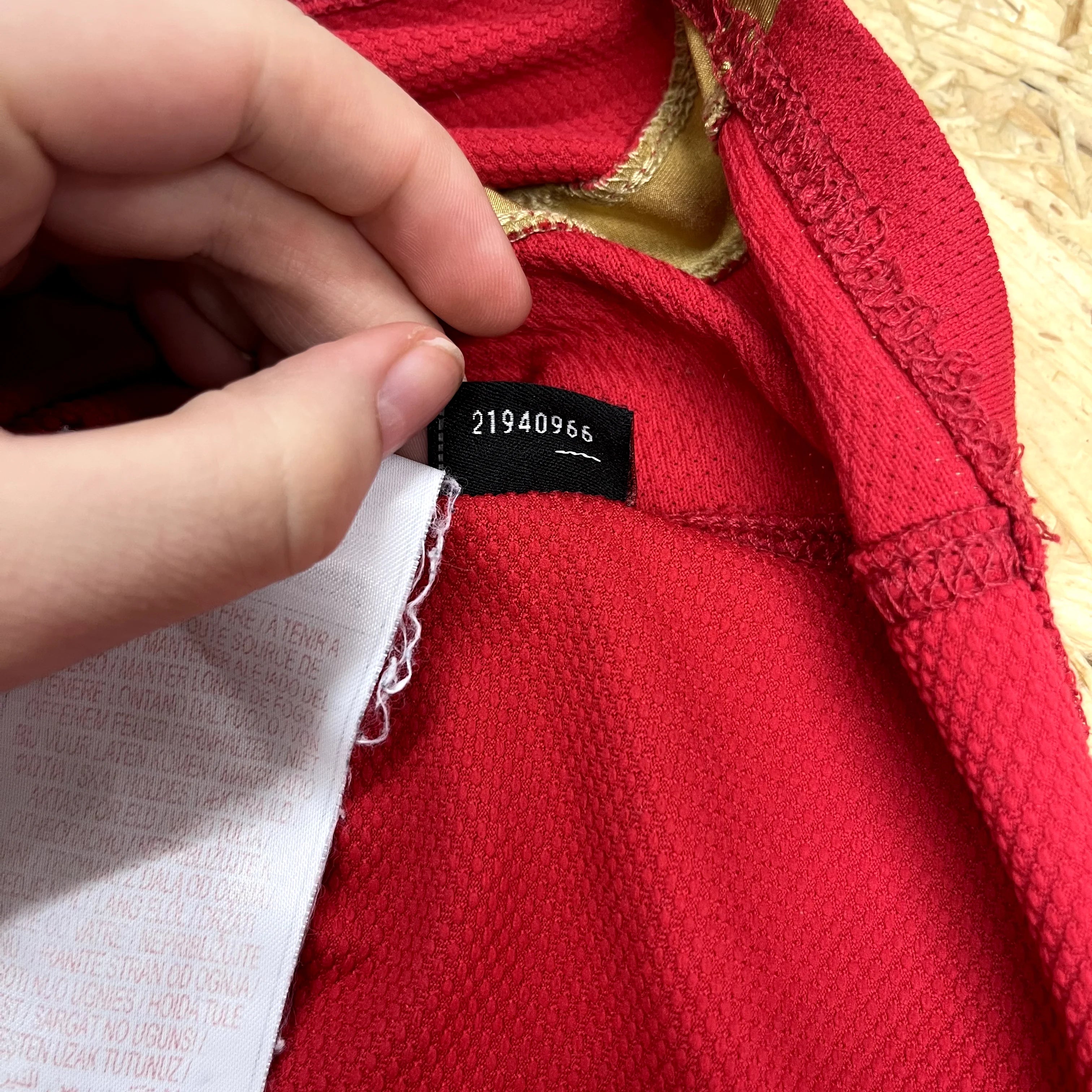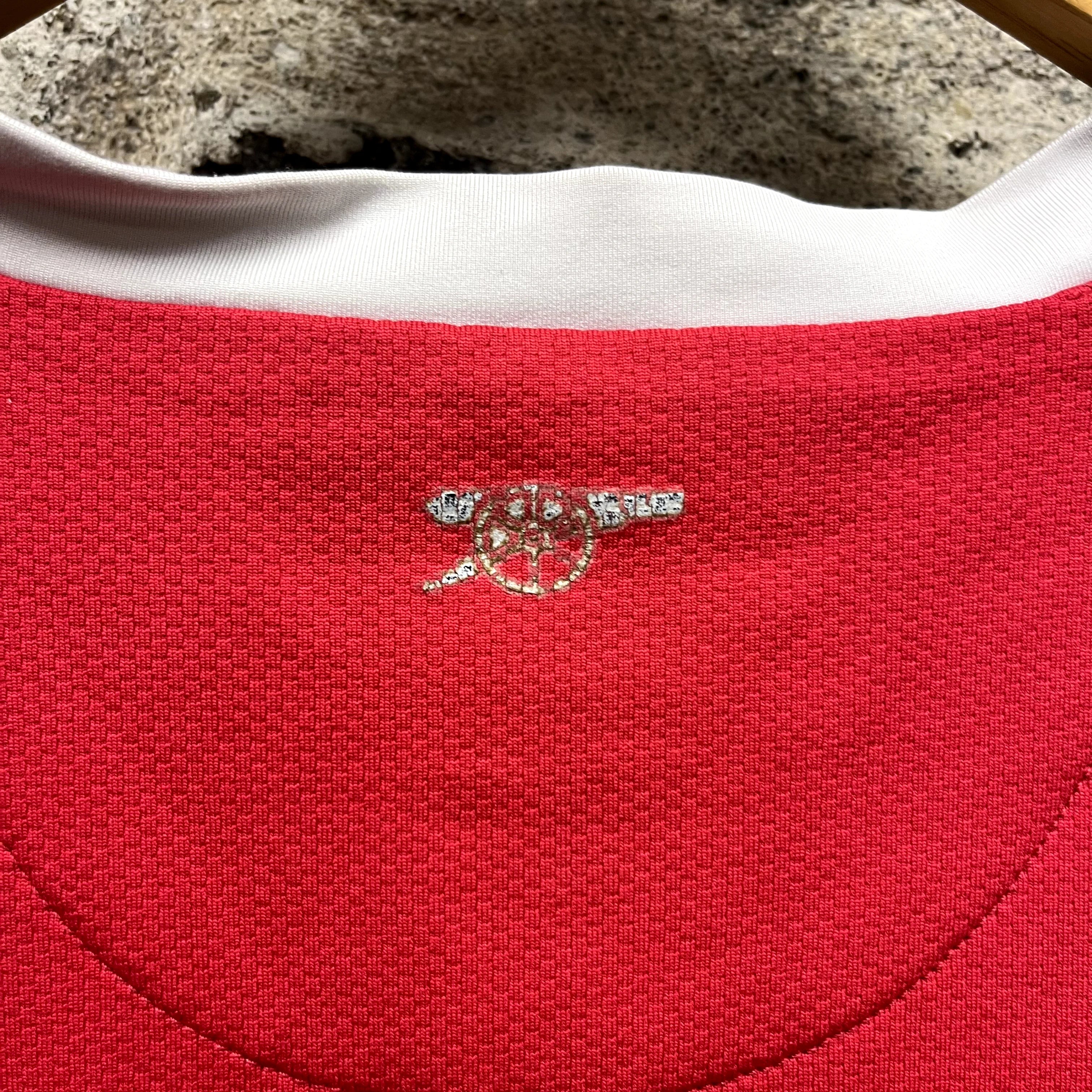 Product details: Red body with white sleeves, embroidered Arsenal badge and Nike logo, Fly Emirates sponsor print, gold piping on sides, mesh technical polyester fabric, back neck Arsenal cannon emblem, classic 2006 style code. Brand: Nike.| Label Size | |
