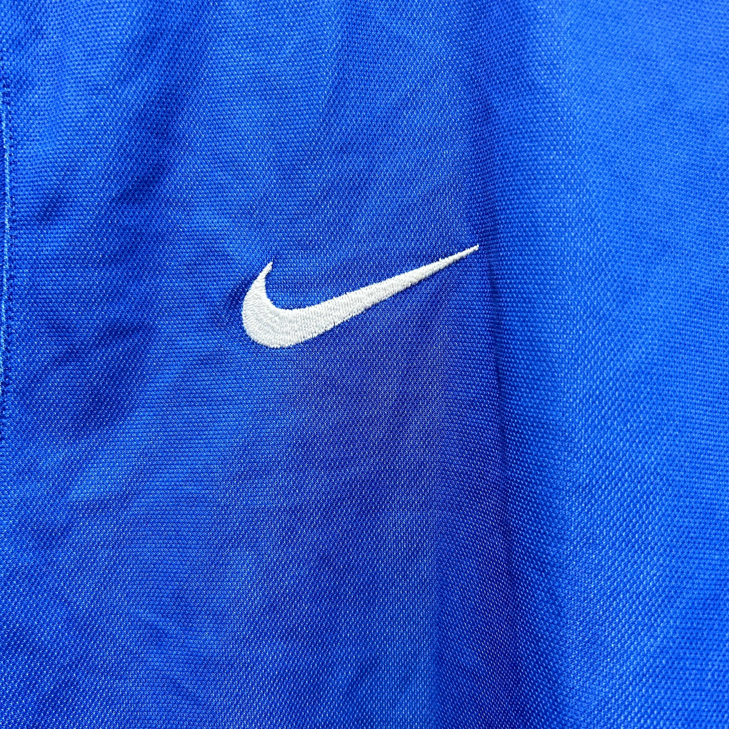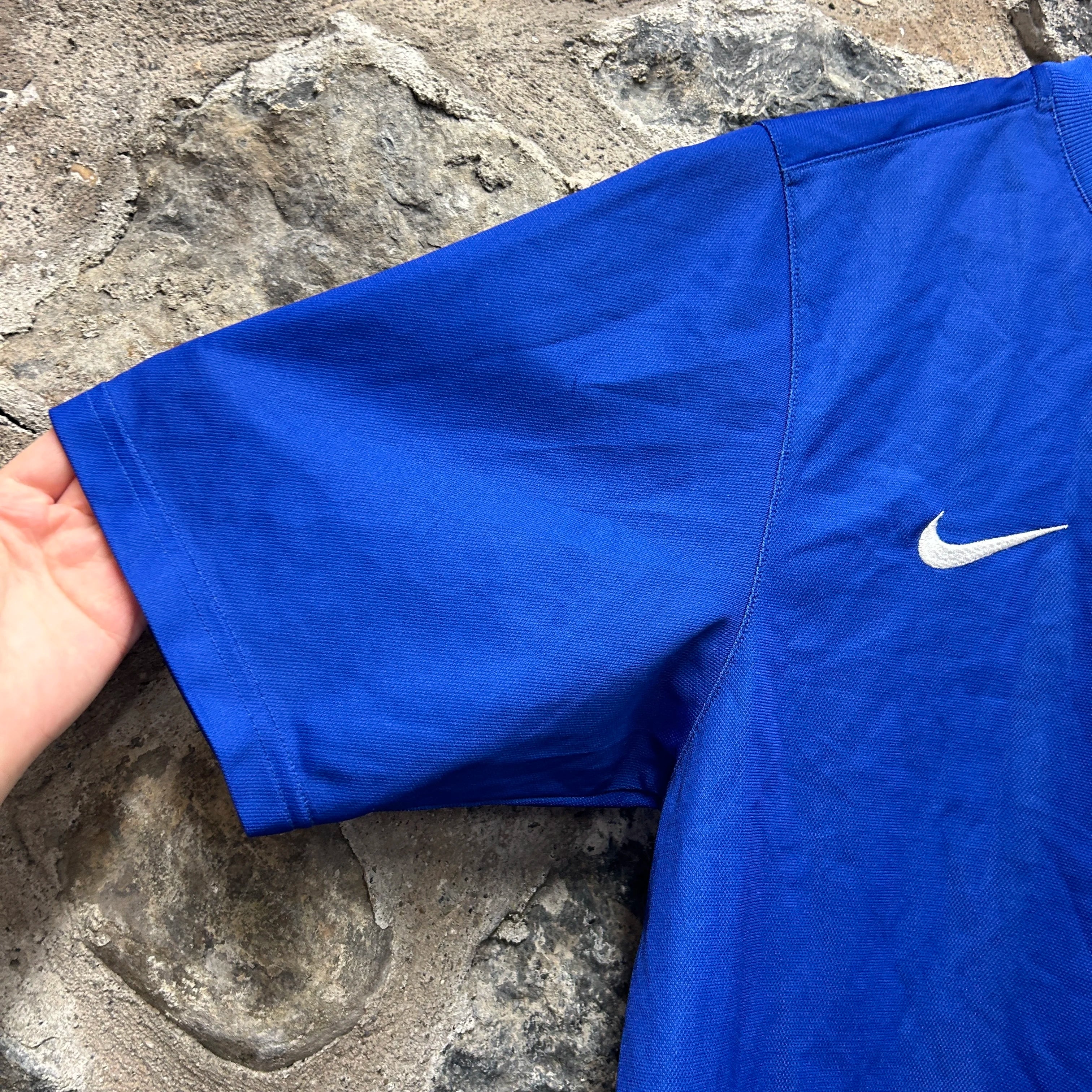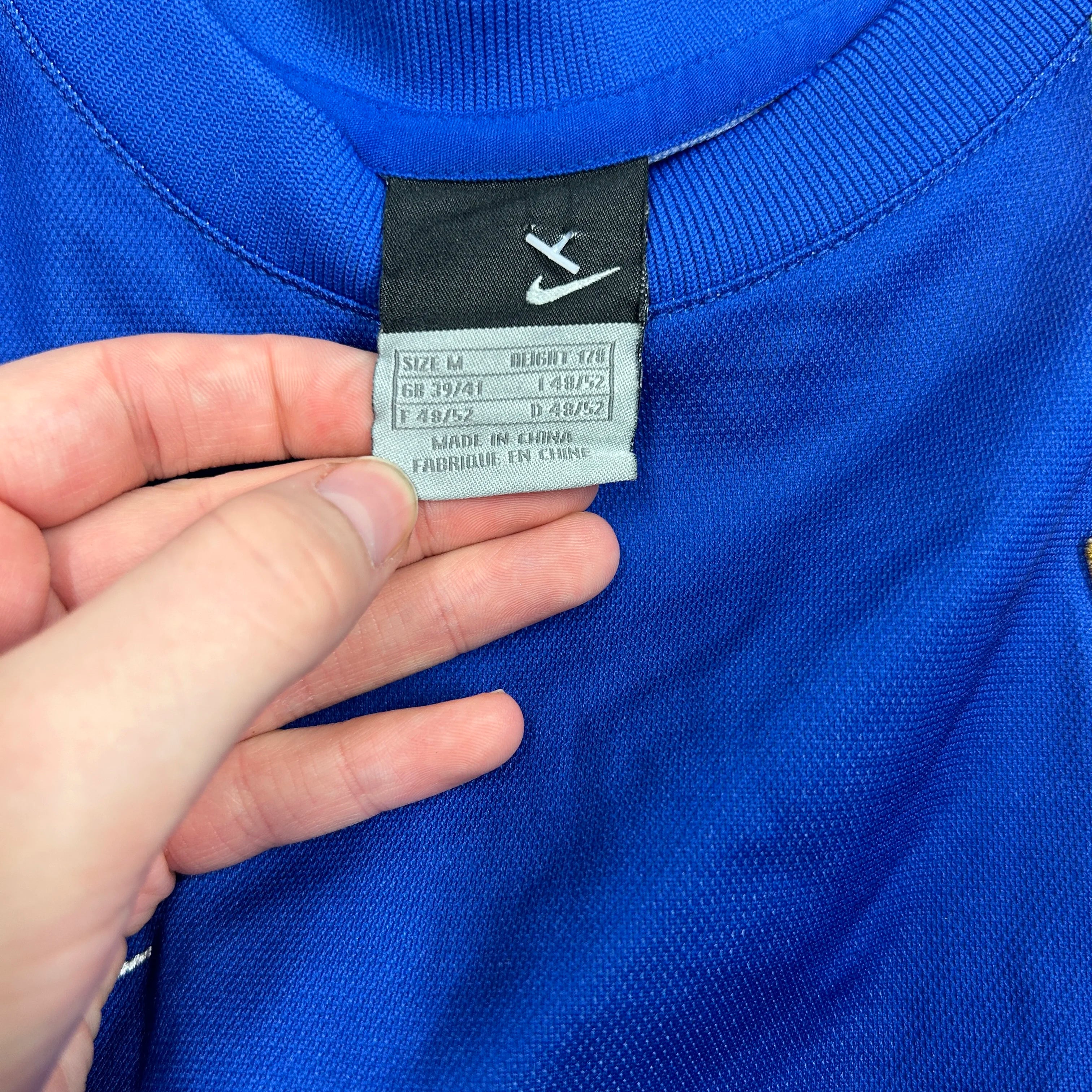 Product details: Blue base with a vertical red and white checkerboard panel, embroidered HNS Croatia football crest, white Nike Swoosh logo, ribbed neckline, polyester sport fabric, c. 2006-2008. Brand: Nike.| Label Size | |