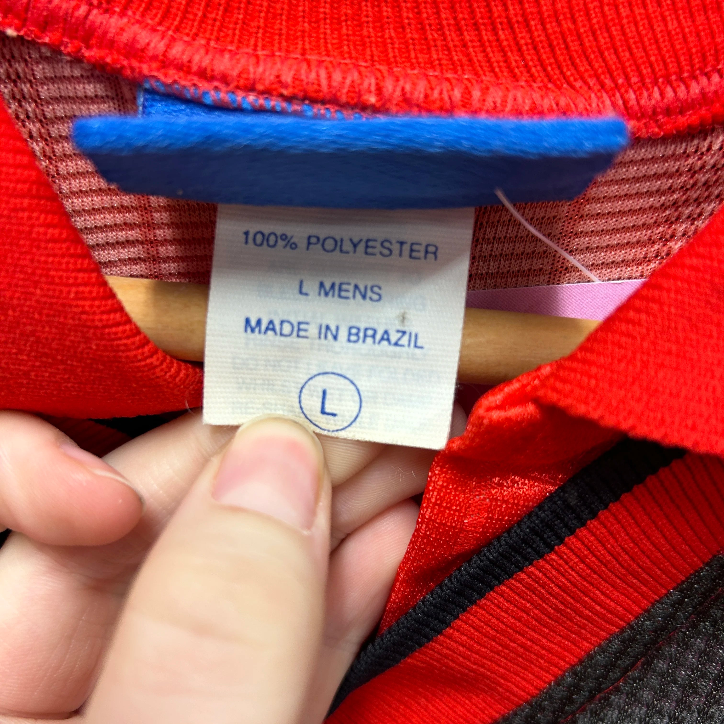 Product details: Distinctive red and black striped design with subtle jacquard club badge patterns in fabric, embroidered Flamengo crest, Umbro and Lubrax sponsor logos, FLA 100 anniversary patch on sleeve, and patterned sleeve cuffs. Made of lightweight, textured polyester. Features side split hem and short sleeves. Brand: Umbro.| Label Size | |