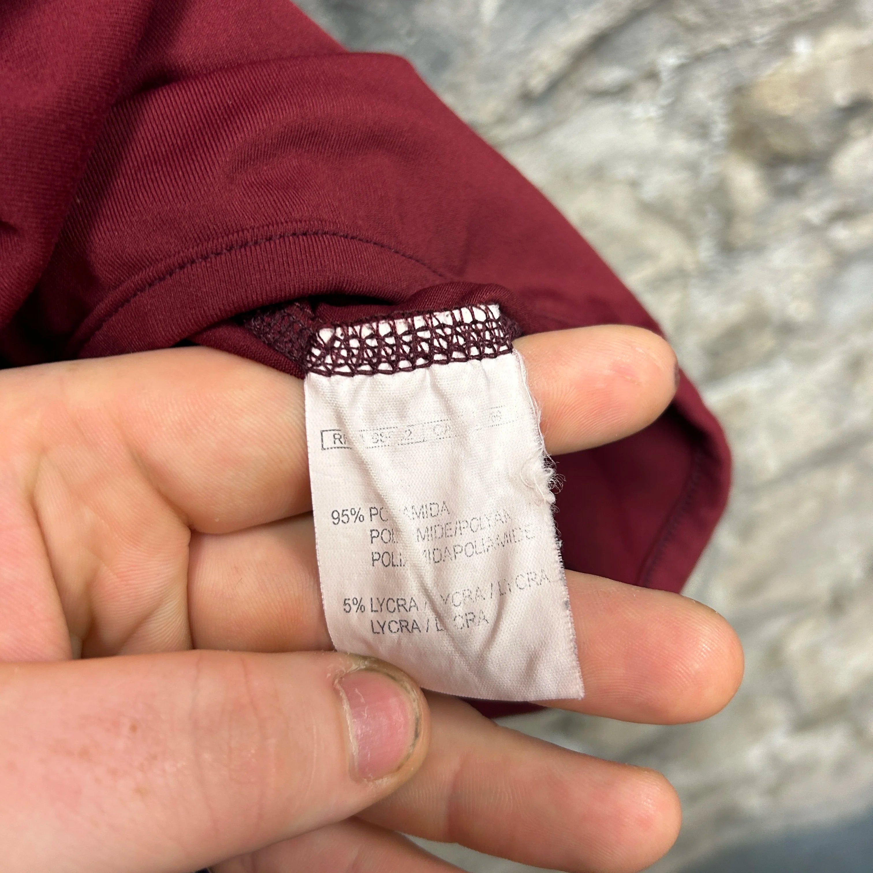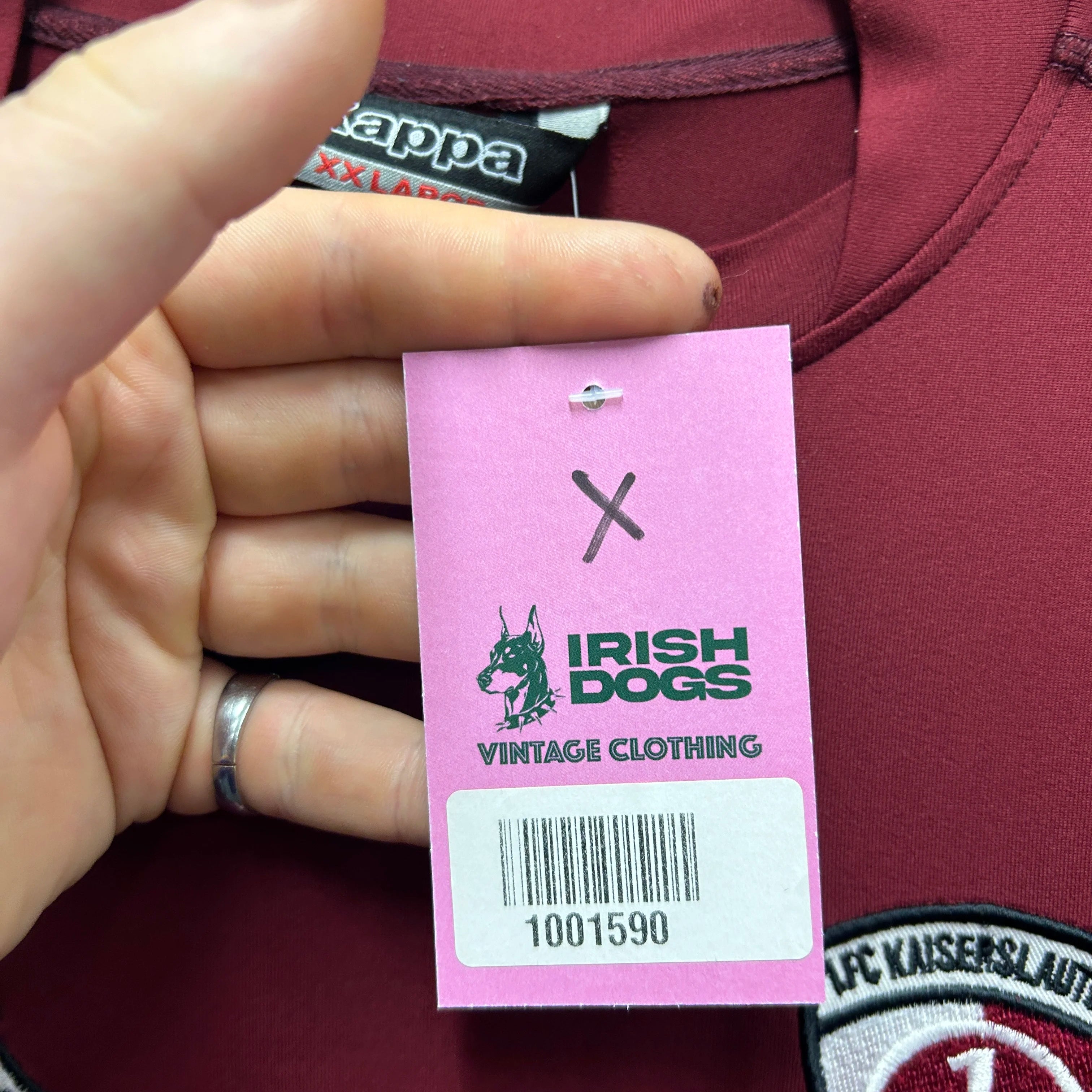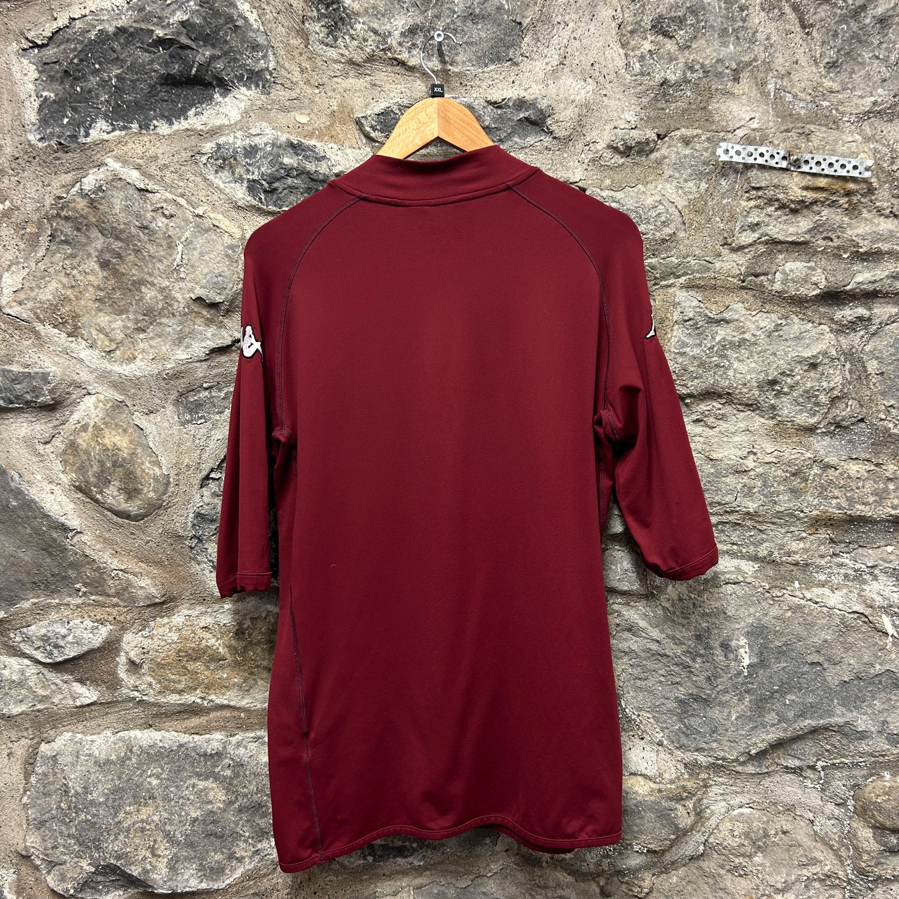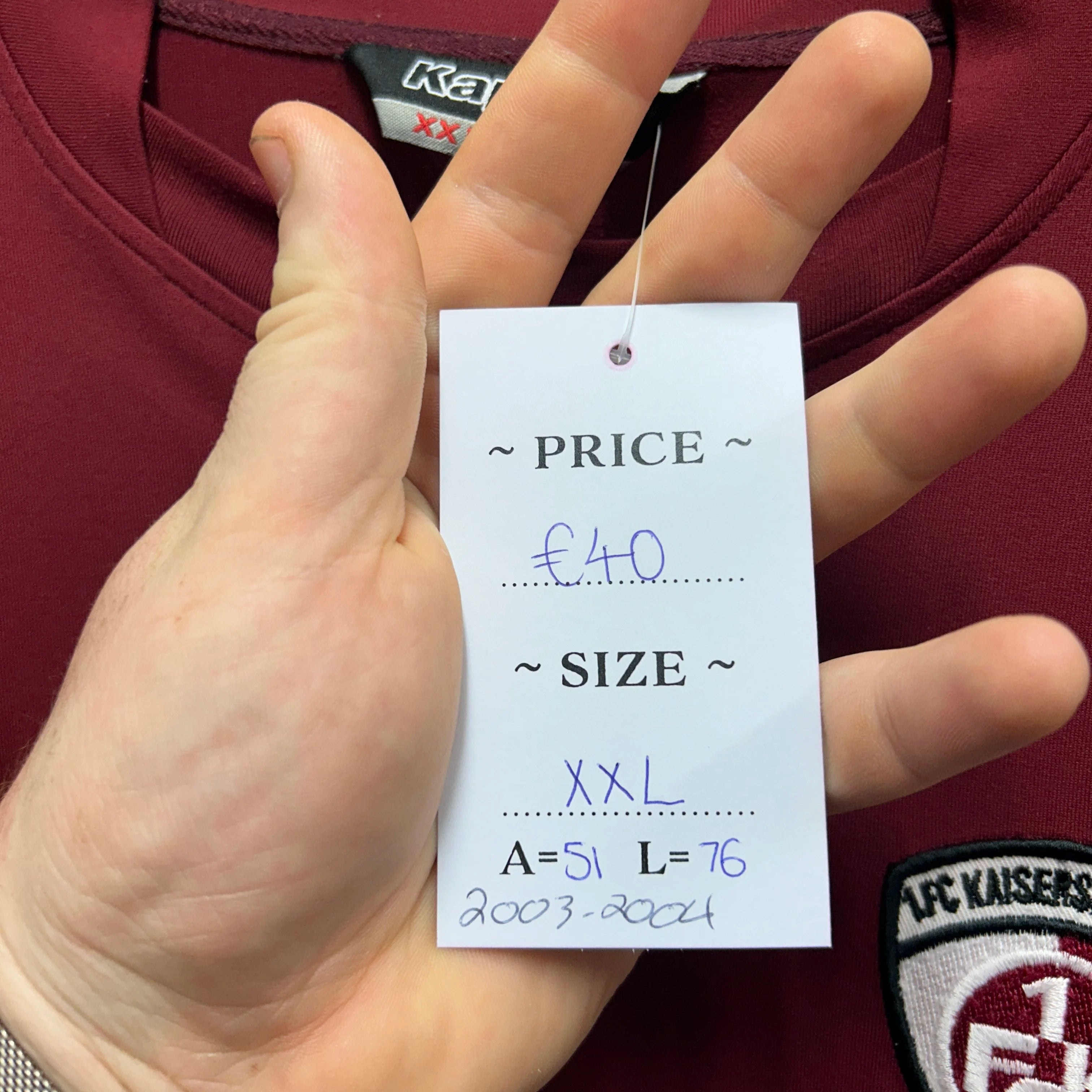 Product details: Maroon short sleeve football jersey, embroidered Kappa logos on both sleeves, 1. FC Kaiserslautern club badge on chest, sponsor print 'Deutsche Vermögensberatung', crew neck, mesh stretch performance fabric, size XXL, 2003-2004 season. Brand: Kappa.| Label Size | |