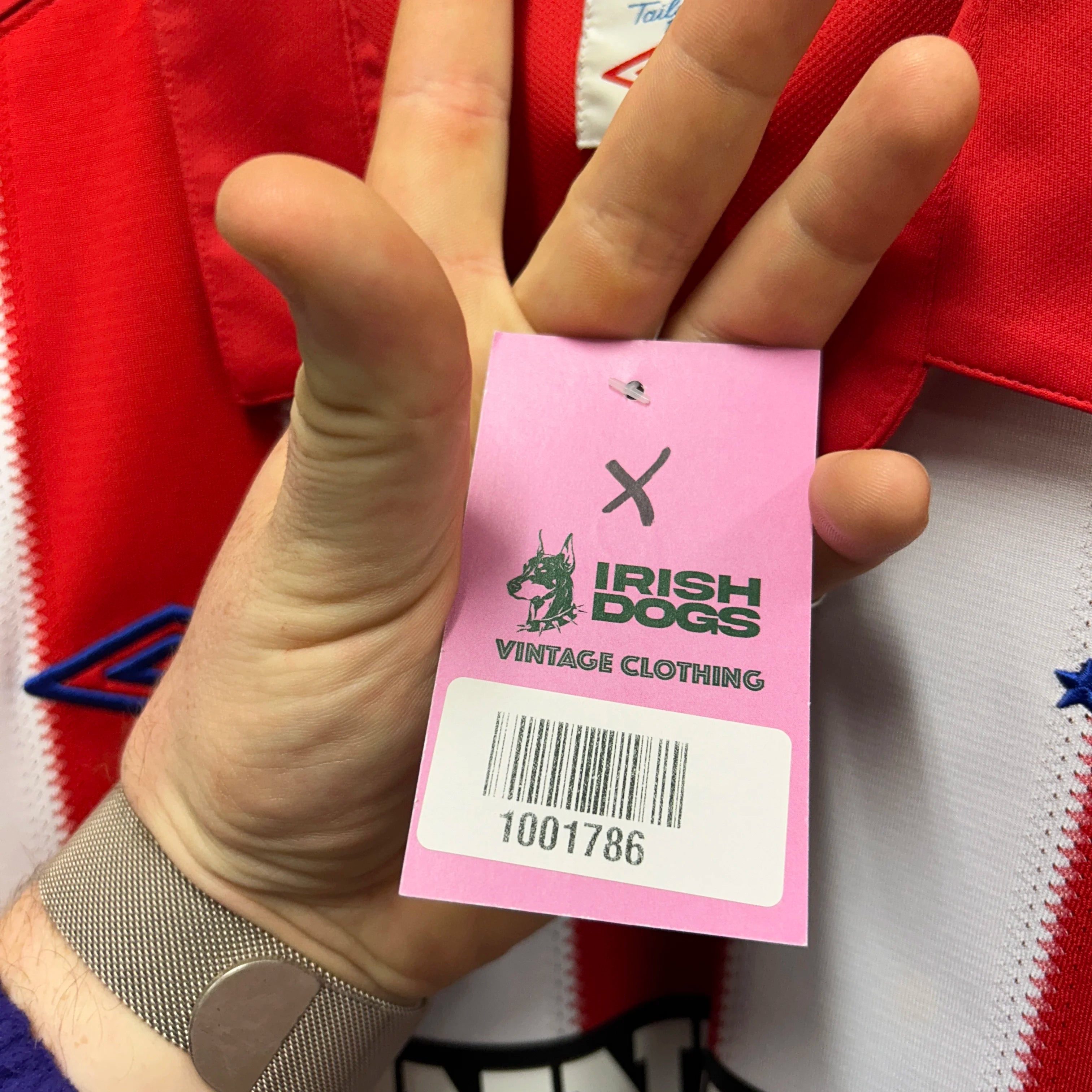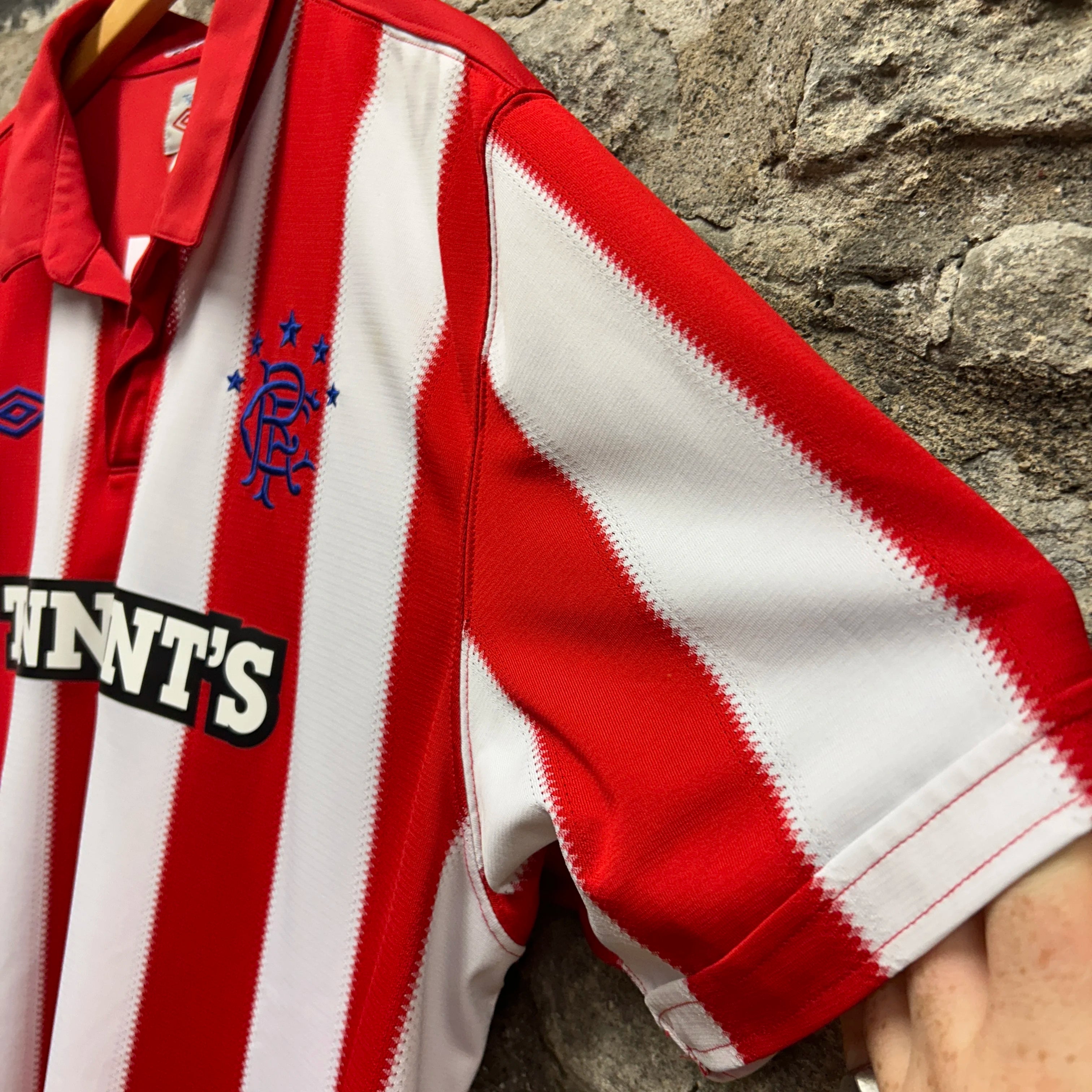 Product details: Red and white vertical stripes, tailored Umbro fit, Rangers FC crest, blue Umbro logo, Tennent's sponsor, "el hadj 17" printed on the back, collared, size XXL, 2010-2011 season, made in Indonesia. Brand: Umbro.| Label Size | |