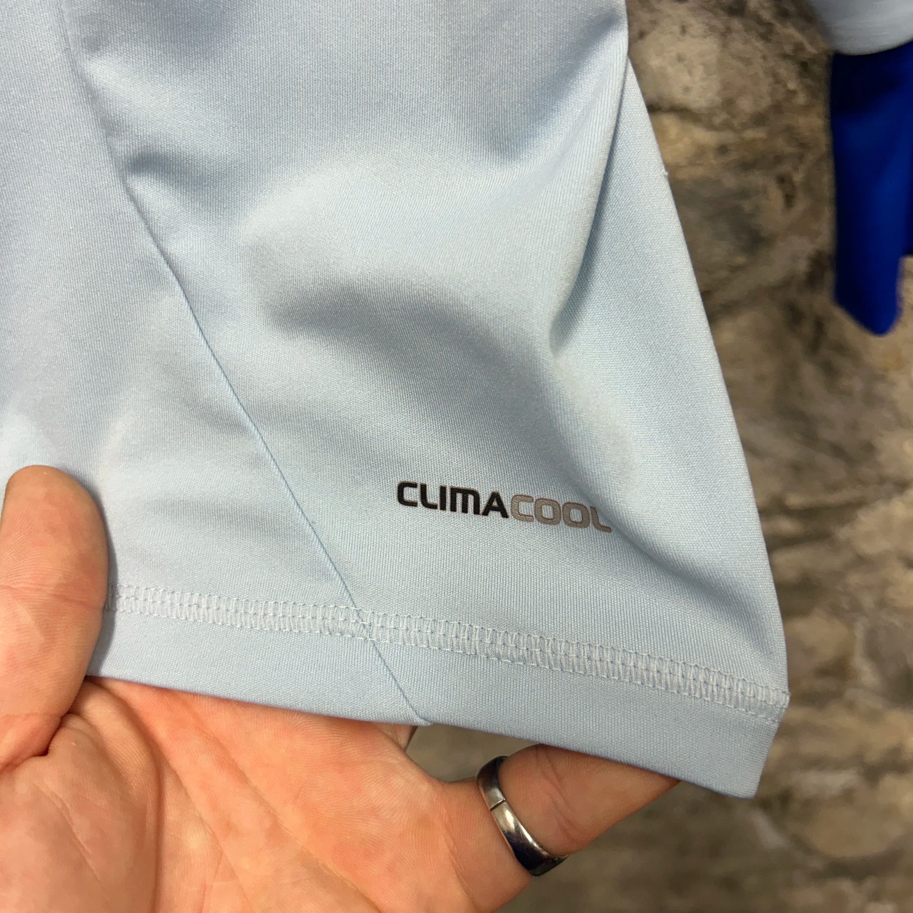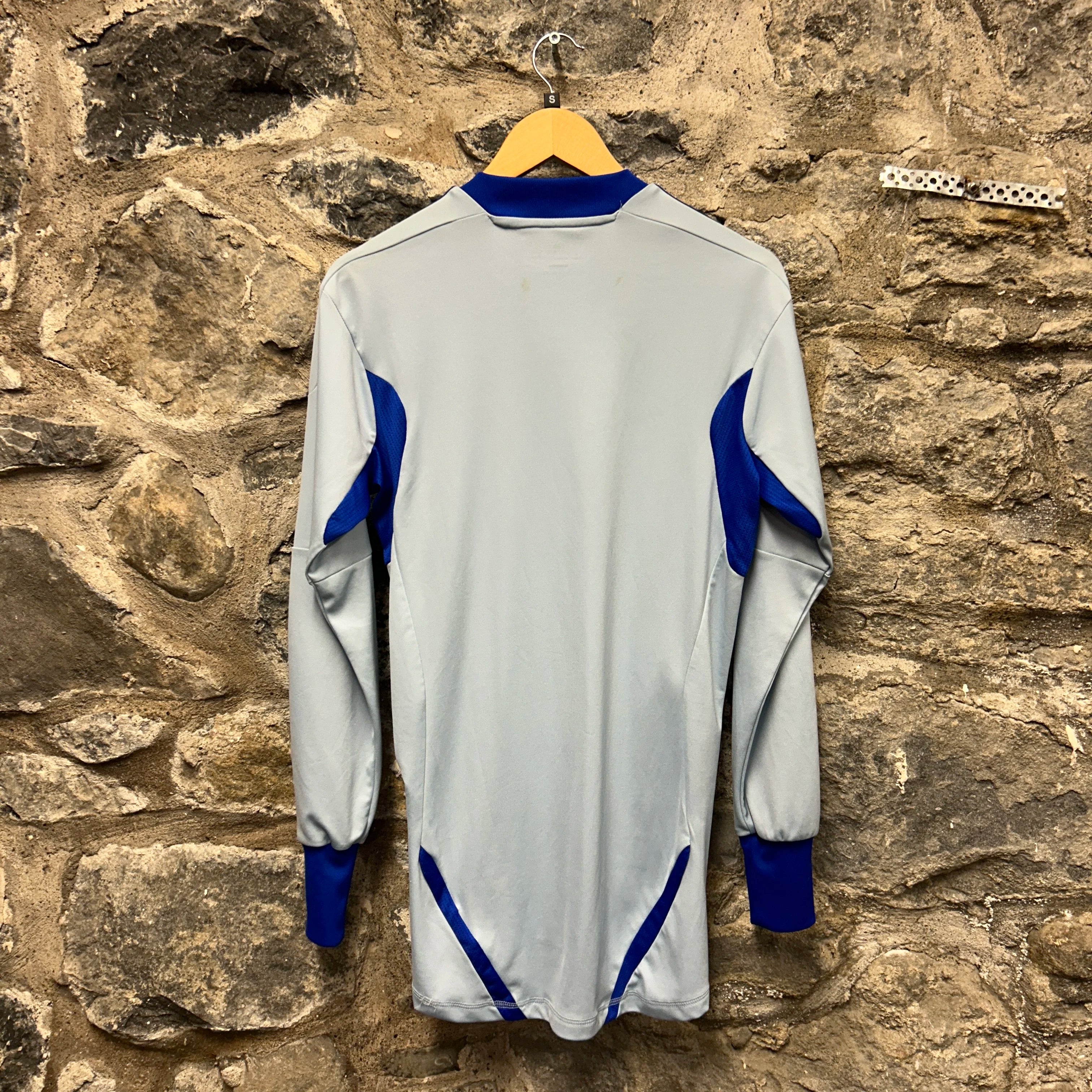 Product details: Adidas FC Schalke 04 2011-2012 long sleeve away football jersey with blue 3-stripes details, embroidered club badge, 'Gazprom' front sponsor, Climacool fabric, ribbed cuffs, and signature adidas branding at hem, size S. Mesh underarm panels for breathability. Brand: Adidas.| Label Size | |