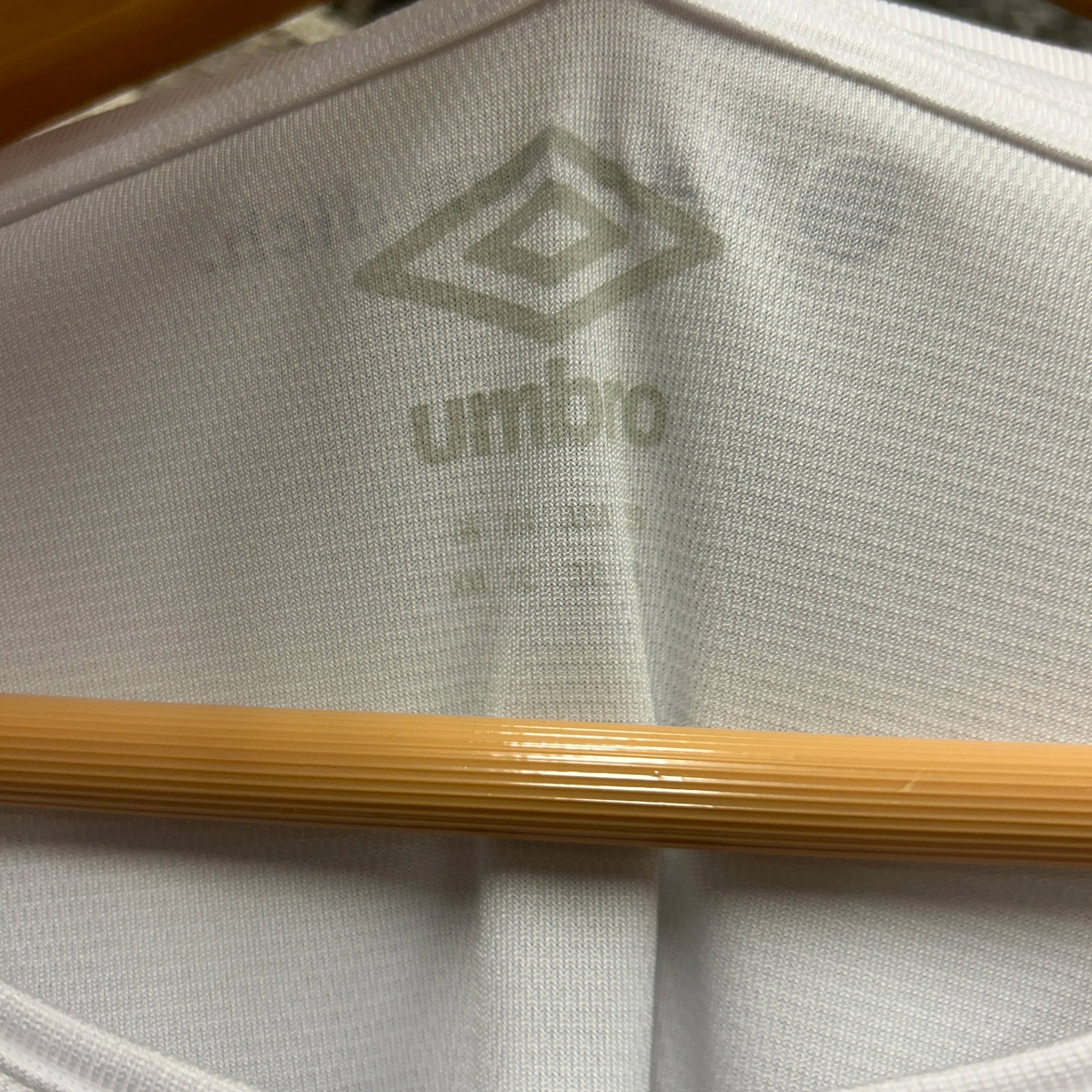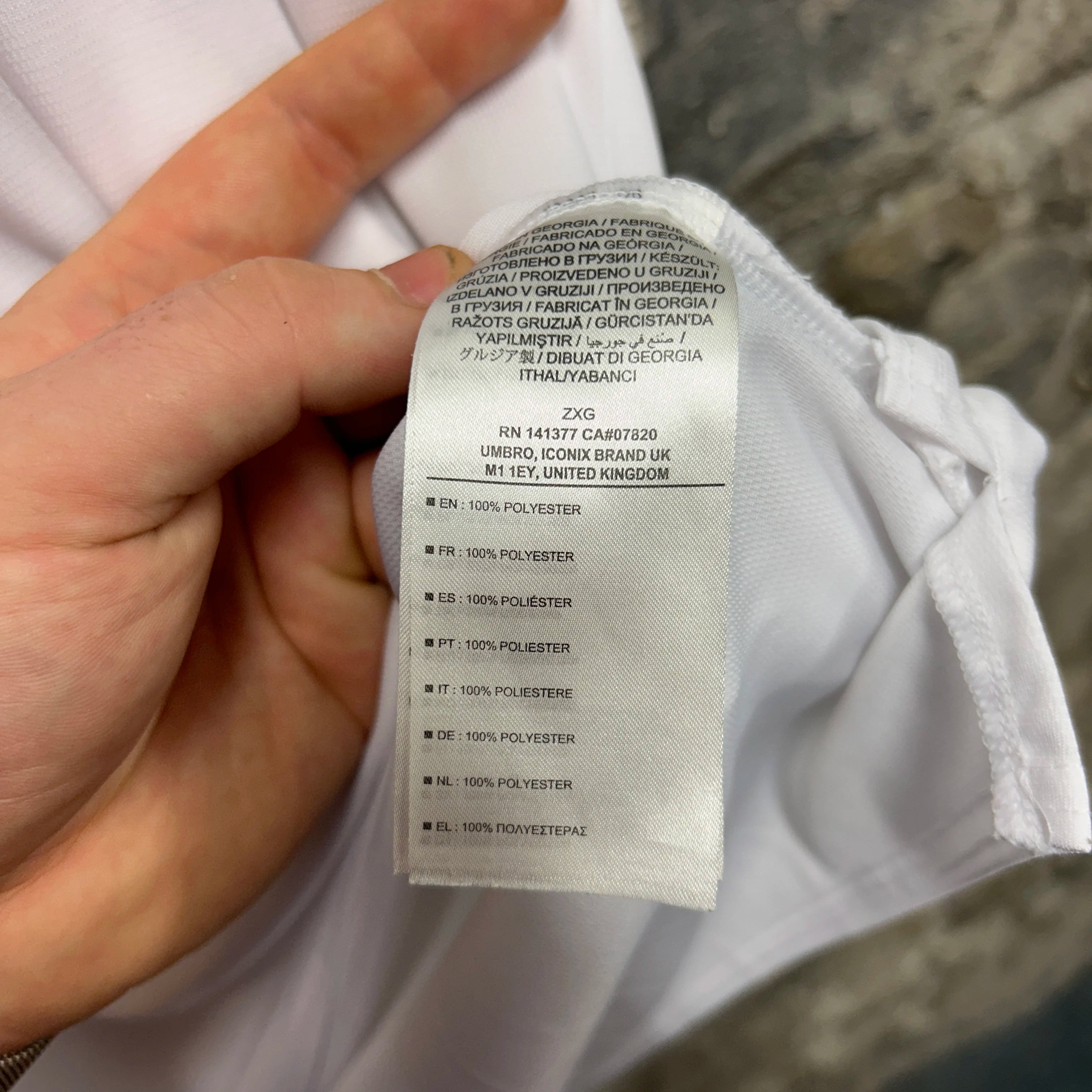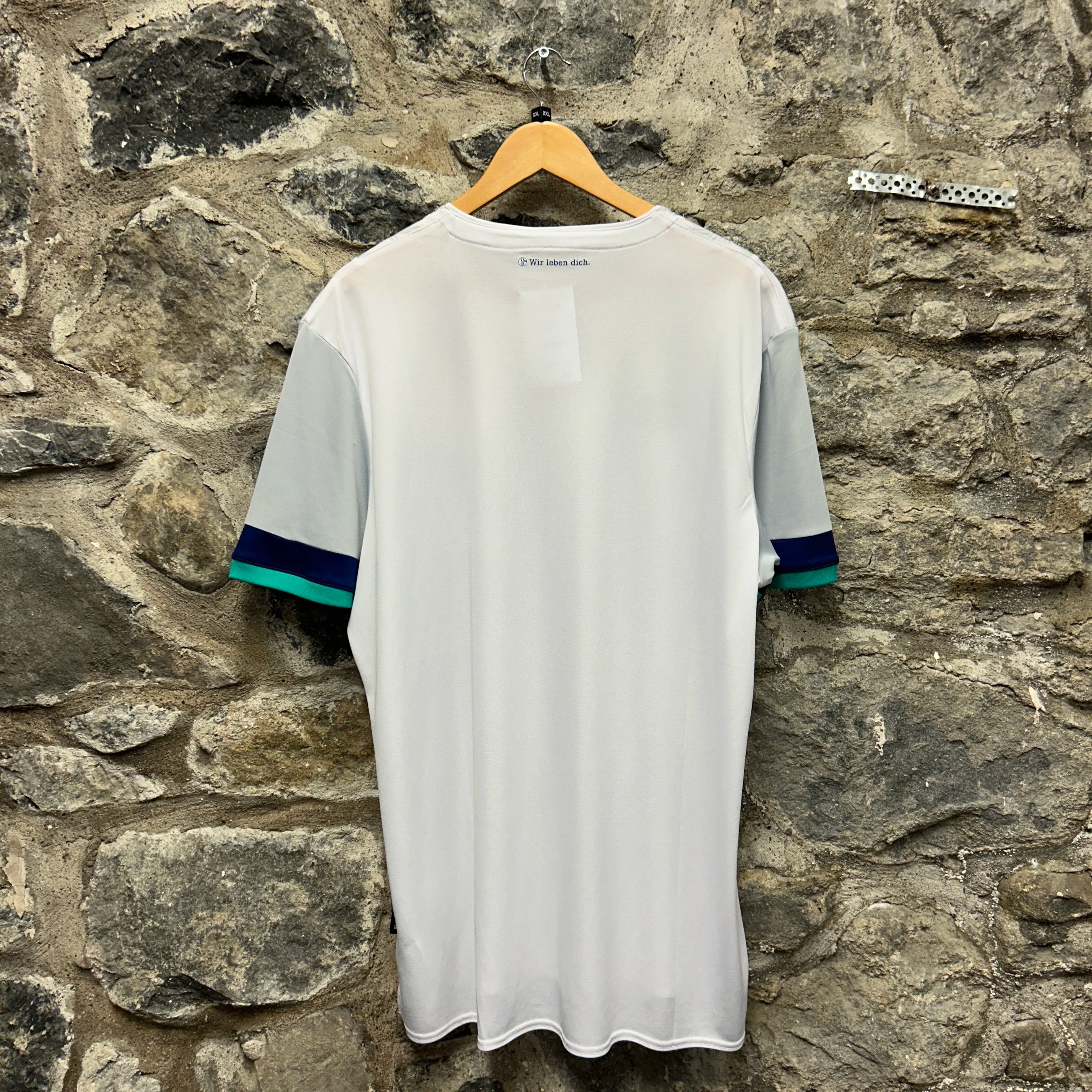 Product details: Authentic 2019-2020 Schalke 04 away shirt by Umbro. White body with navy and teal stripes at sleeve cuffs, navy sponsor detail, classic fit, 100% polyester. Crest and Umbro logos printed on chest. Brand: Umbro.| Label Size | |
