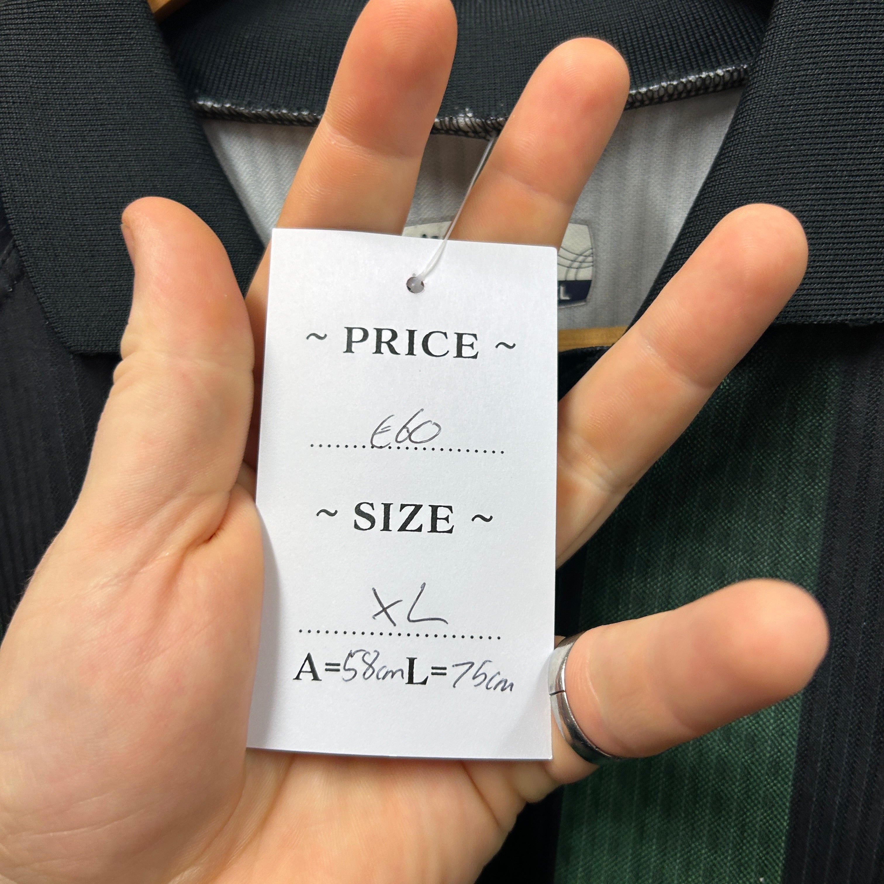 Product details: O’Neills short-sleeve football shirt with black/green vertical stripes, subtle tonal jacquard/mesh texture, V-neck with fold-over collar, embroidered crest-style cross badge on chest pocket, and embroidered O’Neills logo patch. Lightweight performance fabric typical of late-90s/00s kits. Brand: O'neills.| Label Size | |