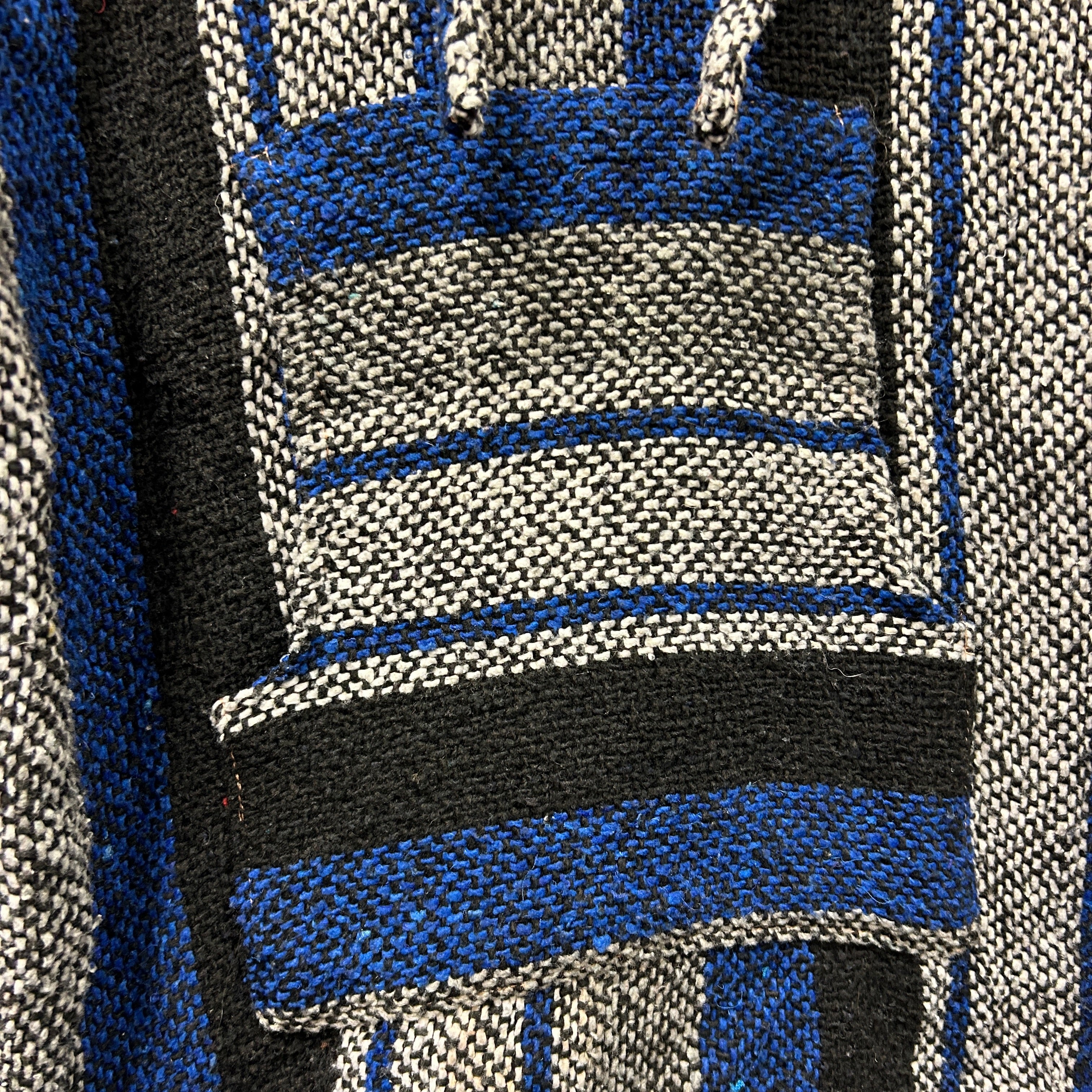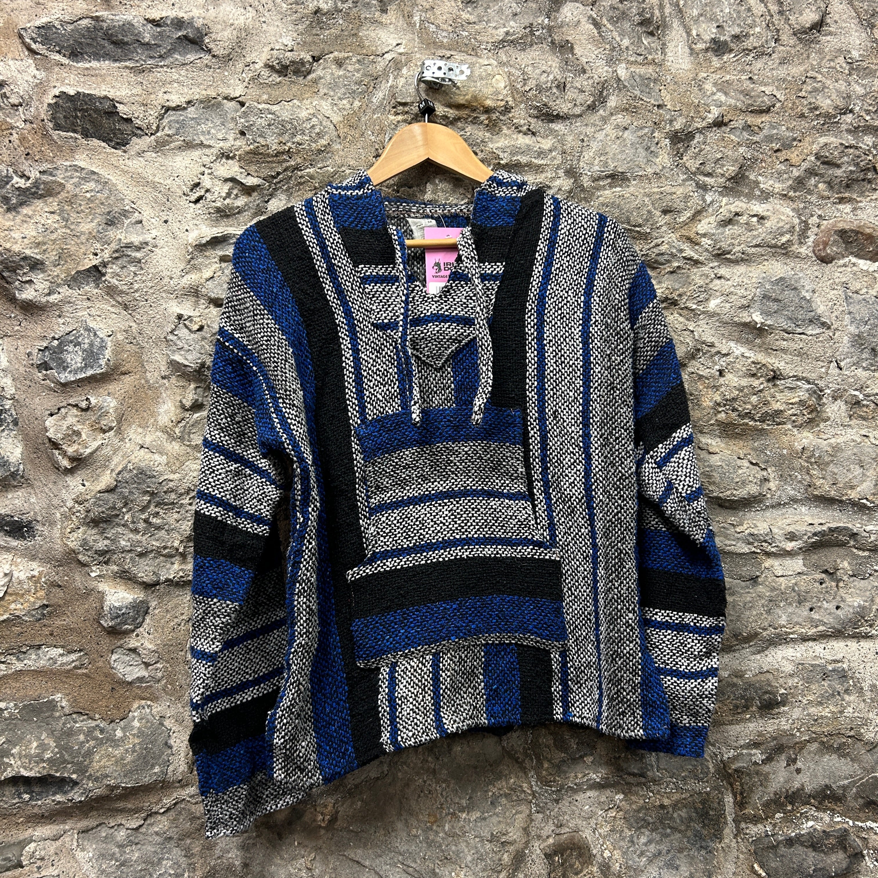 Product details: Classic woven Baja hoodie with bold striped pattern in cobalt blue, black, grey and white. Features a relaxed boxy cut, V-notch neckline with drawcords, and a large front kangaroo pocket; thick textured blanket weave typical of surf/skater Baja pullovers. Brand: .