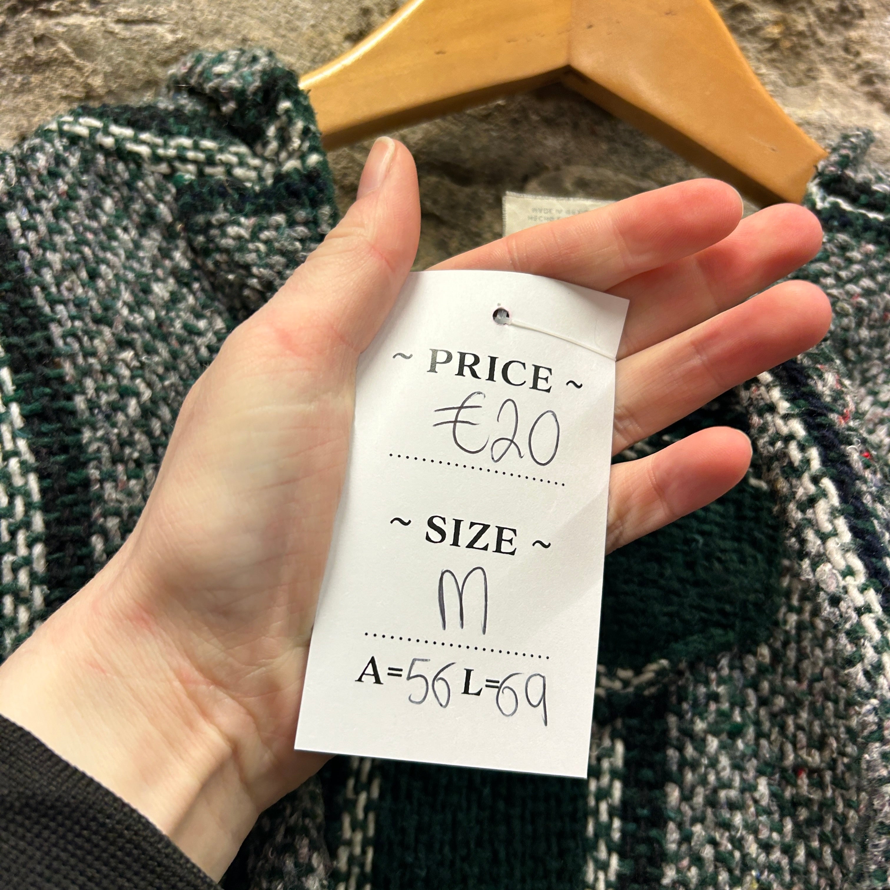 Product details: Woven baja hoodie with forest green/grey/white vertical stripe pattern and speckled yarn texture; relaxed boxy fit with dropped shoulders, attached hood with drawstrings, and classic front kangaroo pocket; raw/overlocked hem finish. Brand: .