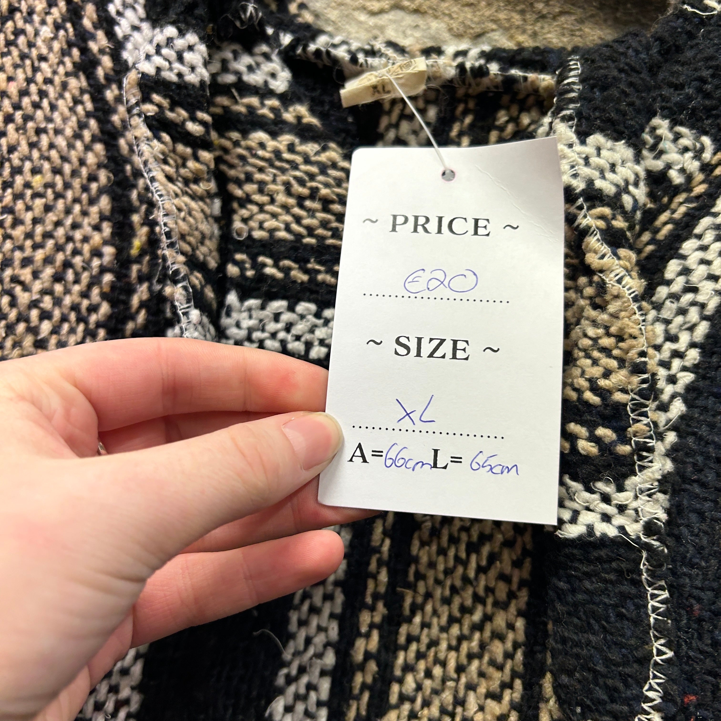 Product details: Woven baja (drug rug) style hoodie with bold vertical stripe pattern in black, beige and white; classic kangaroo pouch pocket; relaxed fit with drop shoulders; rough textured woven fabric with raw/frayed hem edge typical of baja hoodies; attached hood. Brand: Del-mex.| Label Size | |