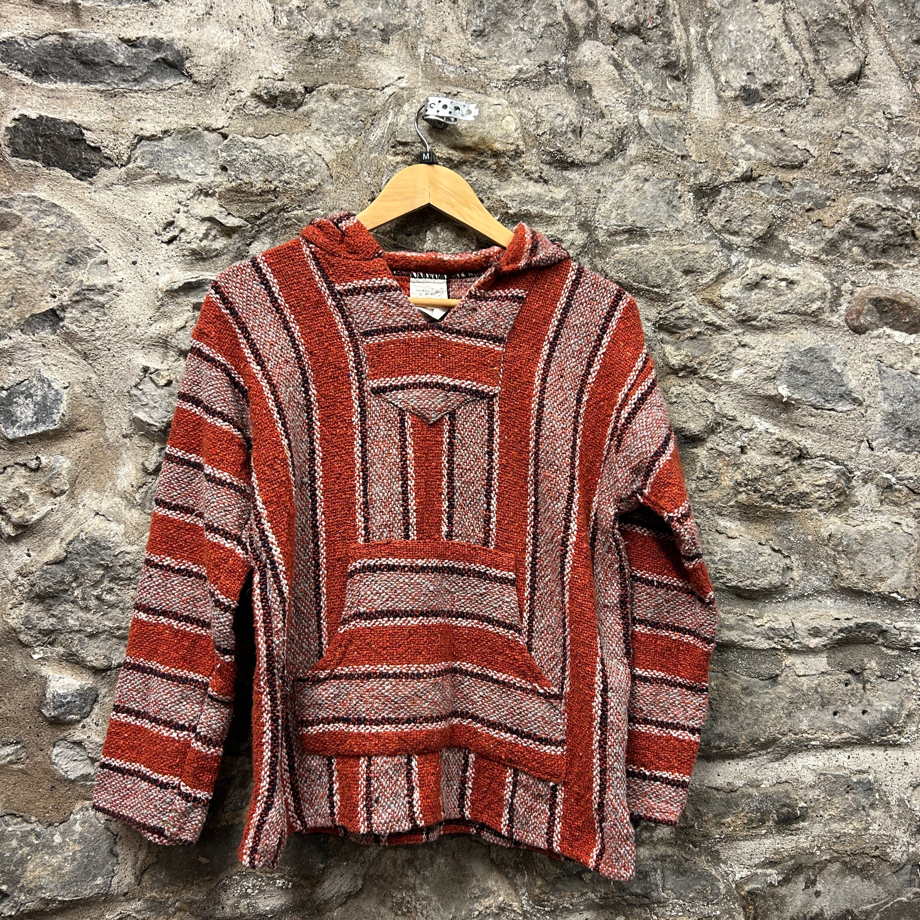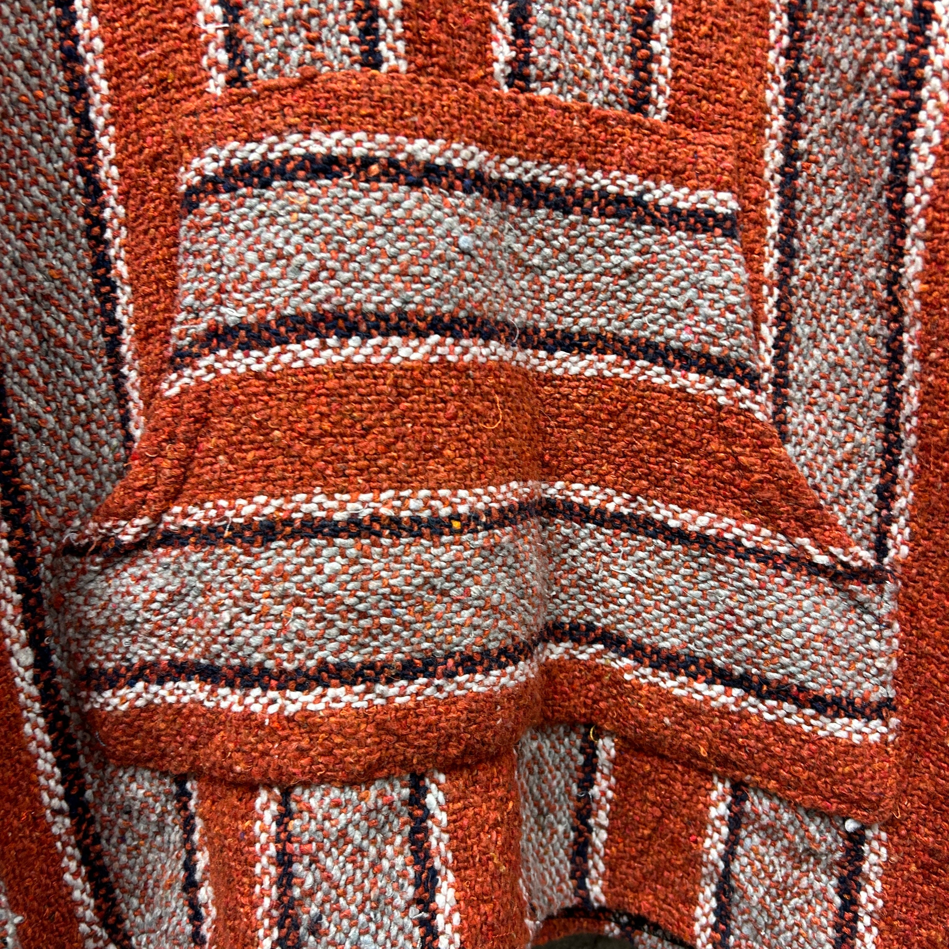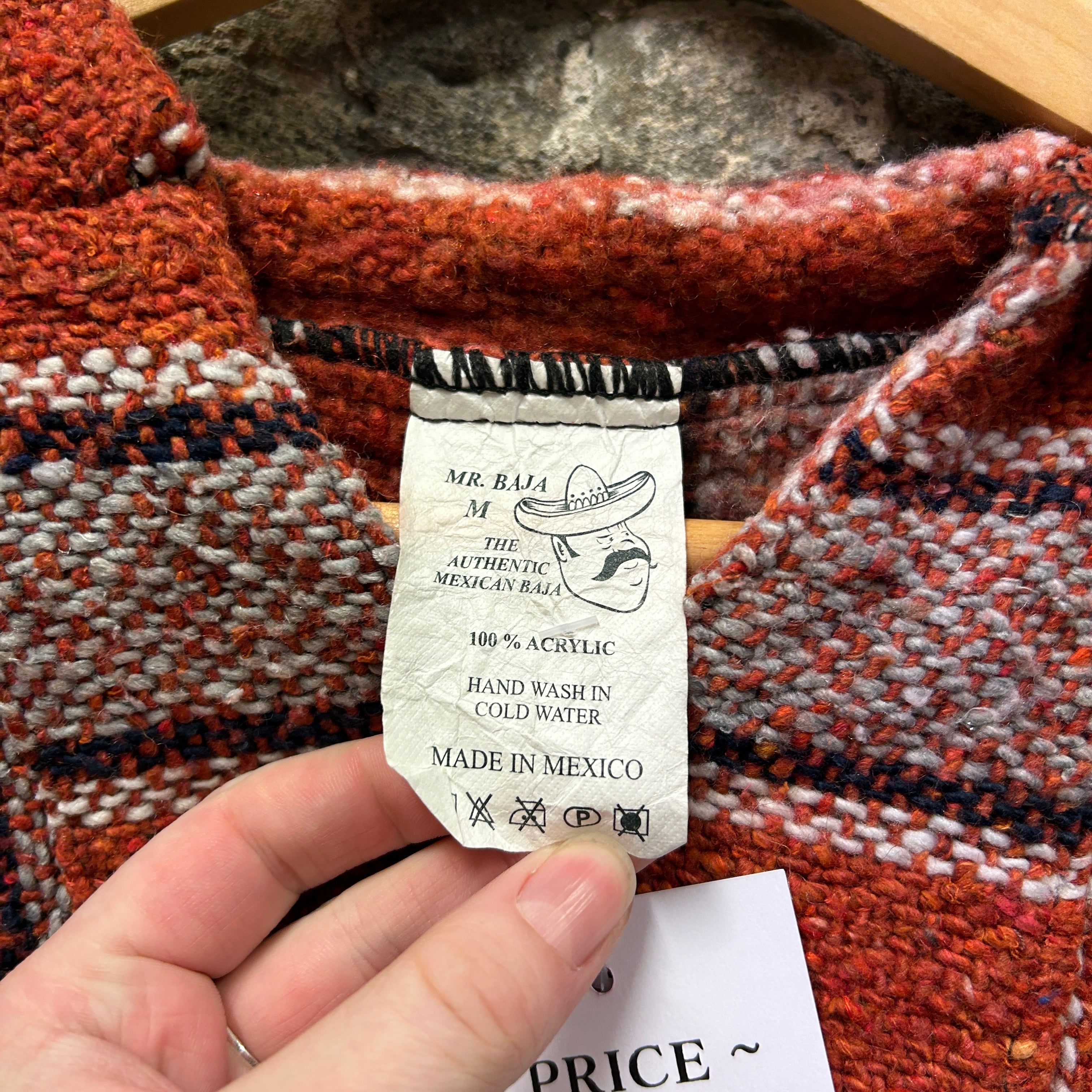 Product details: Mexican baja hoodie in a chunky woven, blanket-style fabric with rust red and heather grey stripe pattern plus thin black/white accent lines. Features a V-notch hooded neckline, long sleeves, and classic front kangaroo pouch pocket. Tag reads “MR. BAJA – The Authentic Mexican Baja,” size M; made in Mexico. Brand: Mr. Baja.| Label Size | |