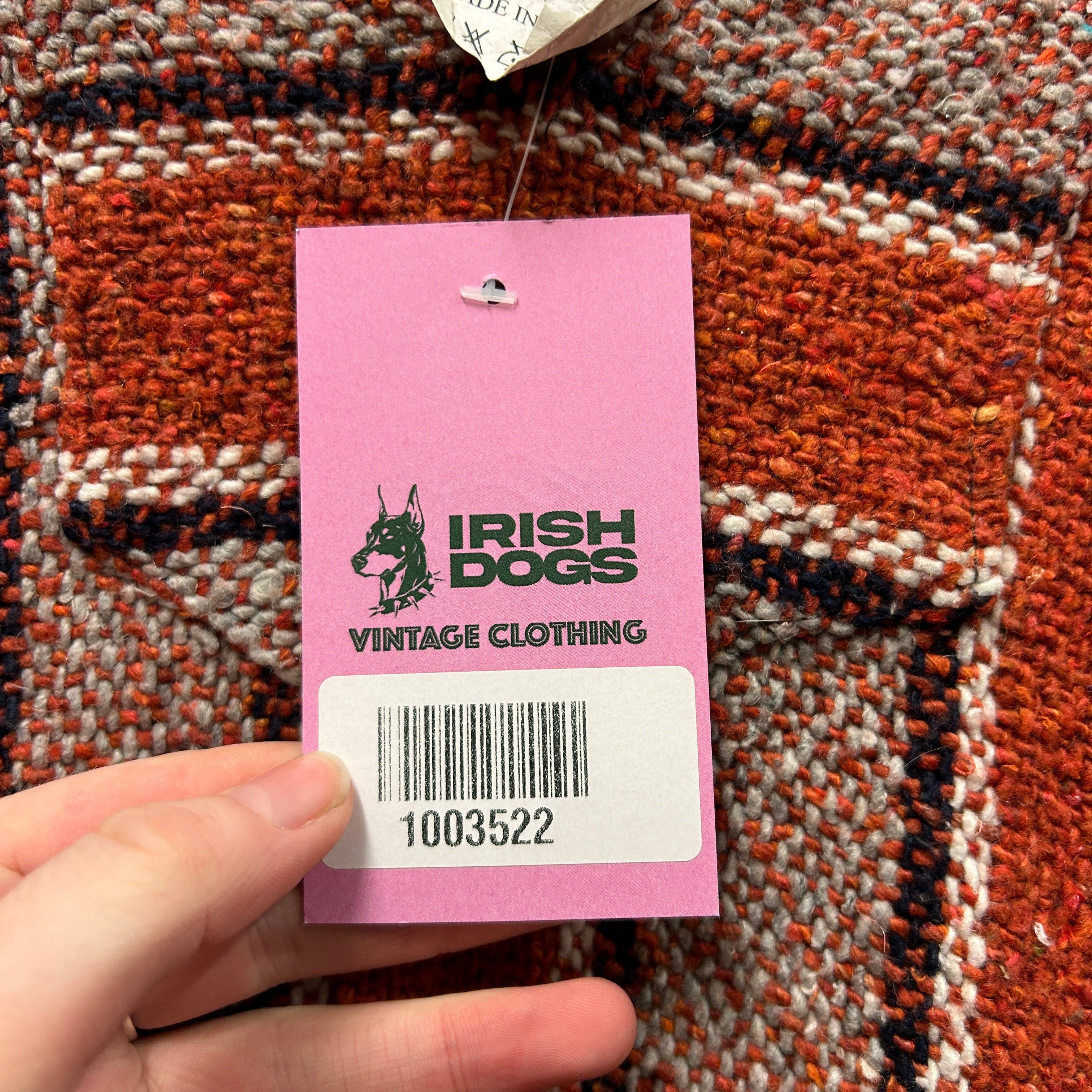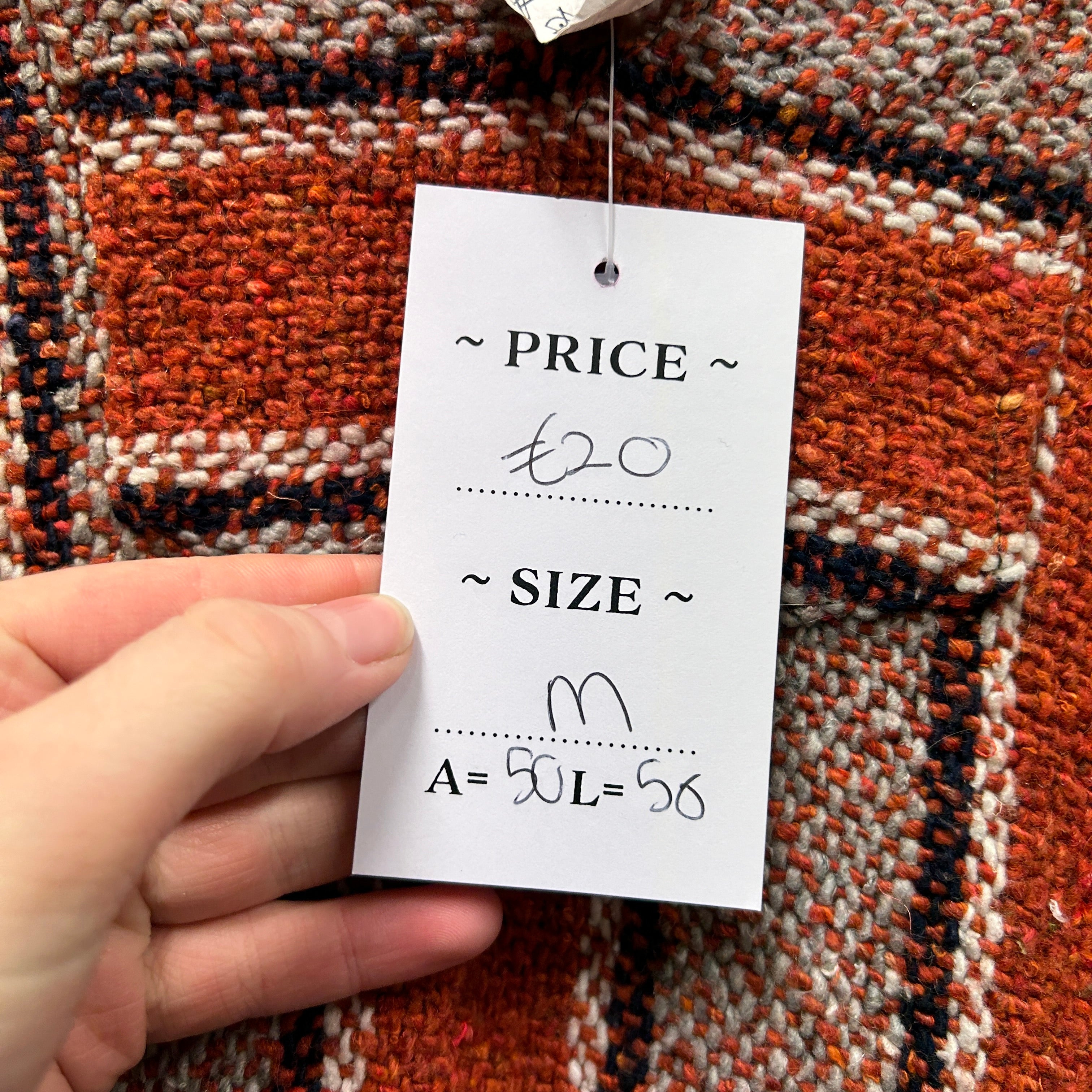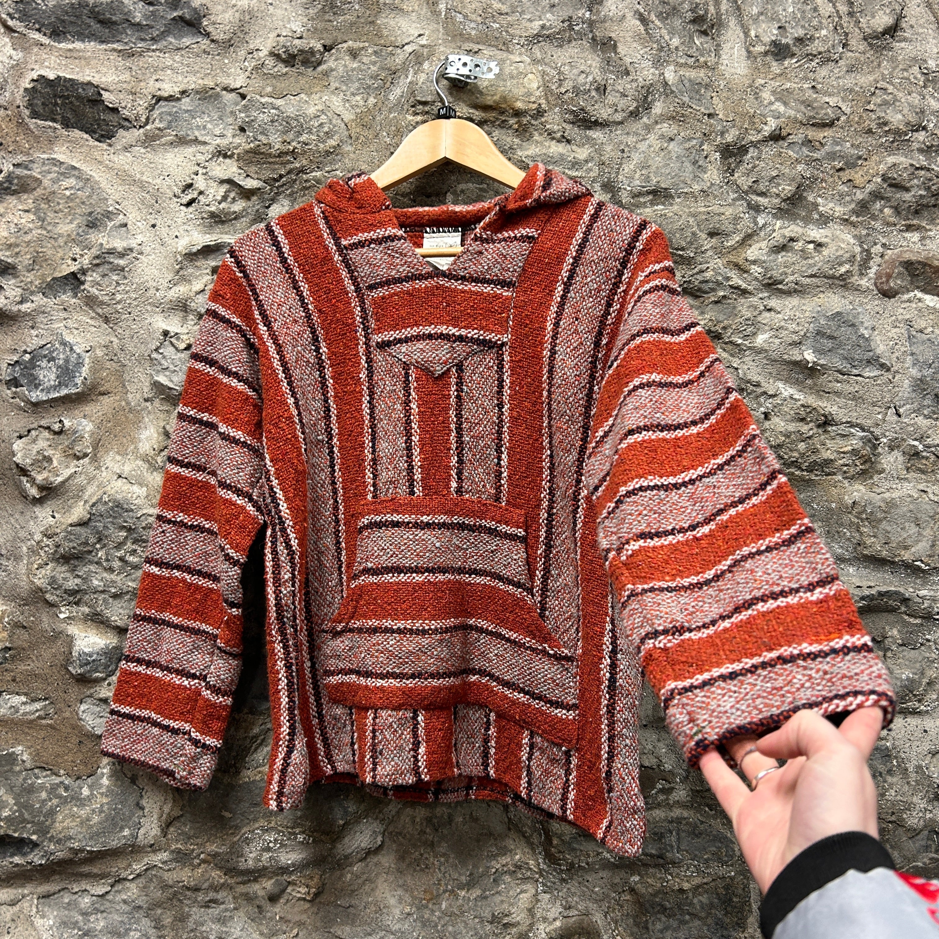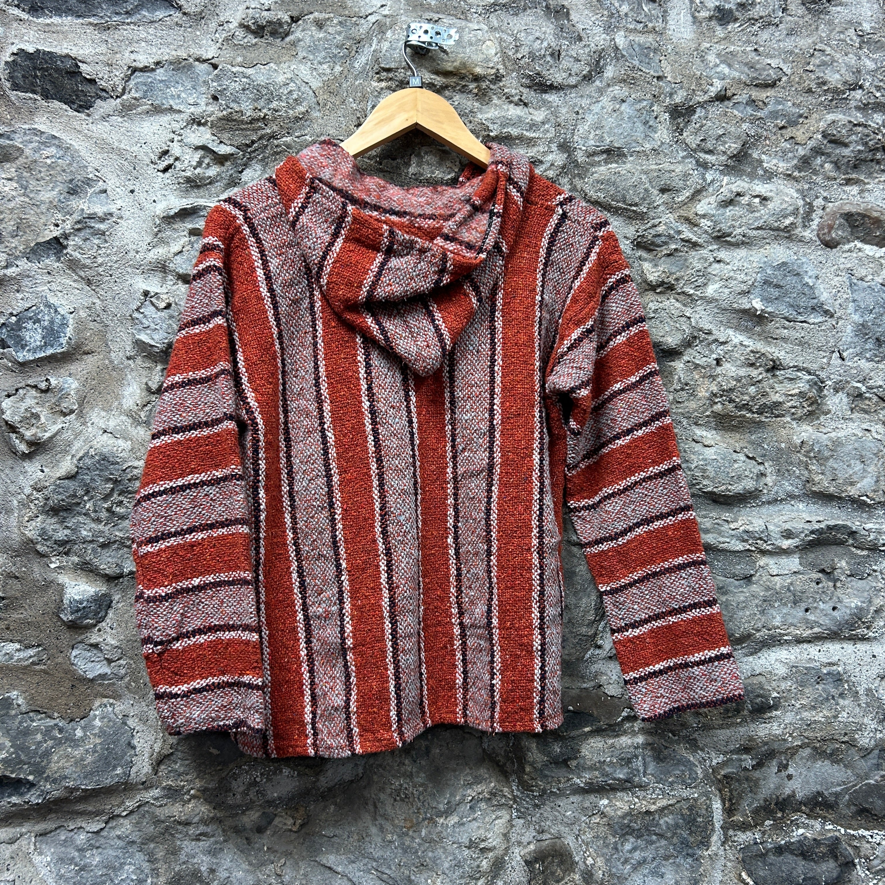 Product details: Mexican baja hoodie in a chunky woven, blanket-style fabric with rust red and heather grey stripe pattern plus thin black/white accent lines. Features a V-notch hooded neckline, long sleeves, and classic front kangaroo pouch pocket. Tag reads “MR. BAJA – The Authentic Mexican Baja,” size M; made in Mexico. Brand: Mr. Baja.| Label Size | |