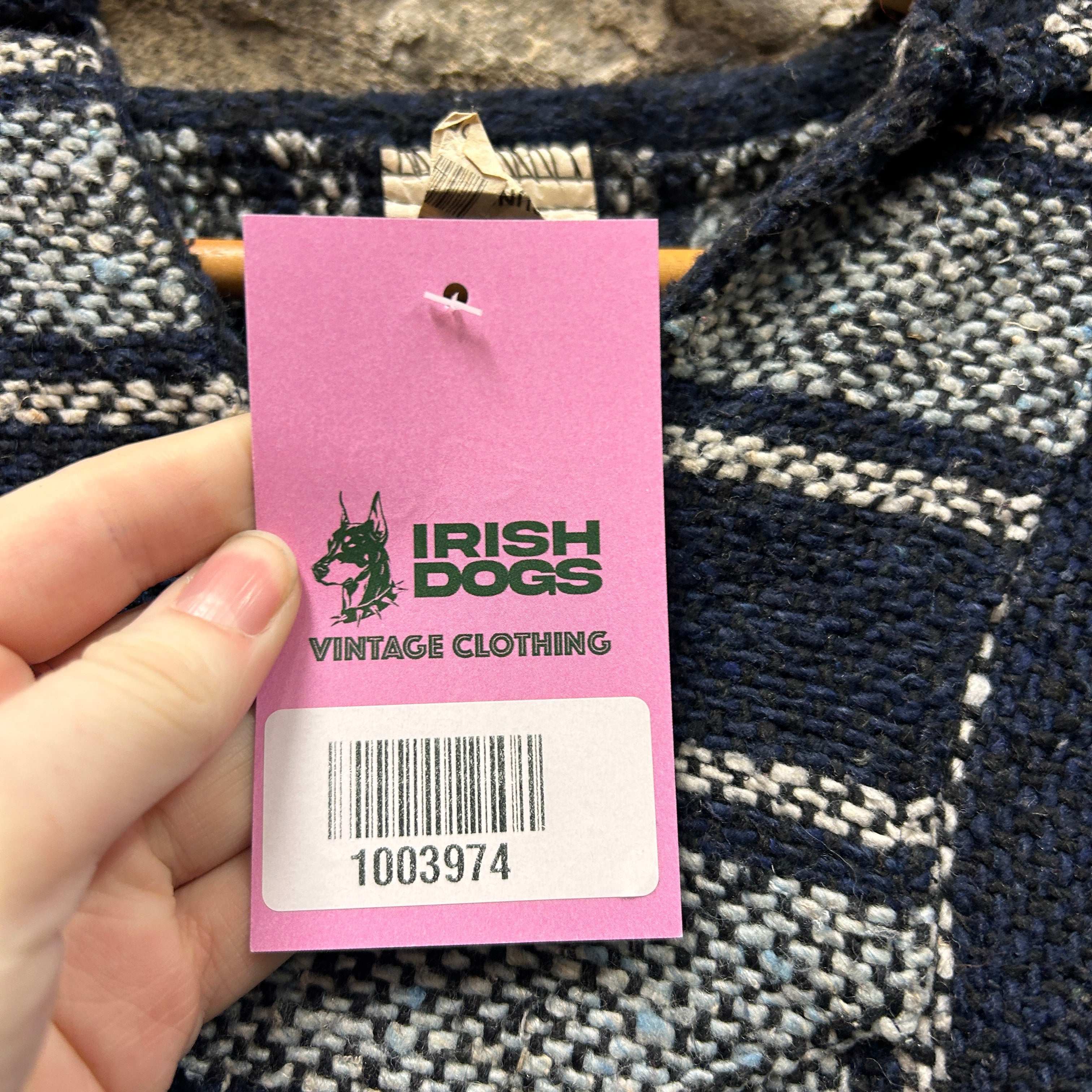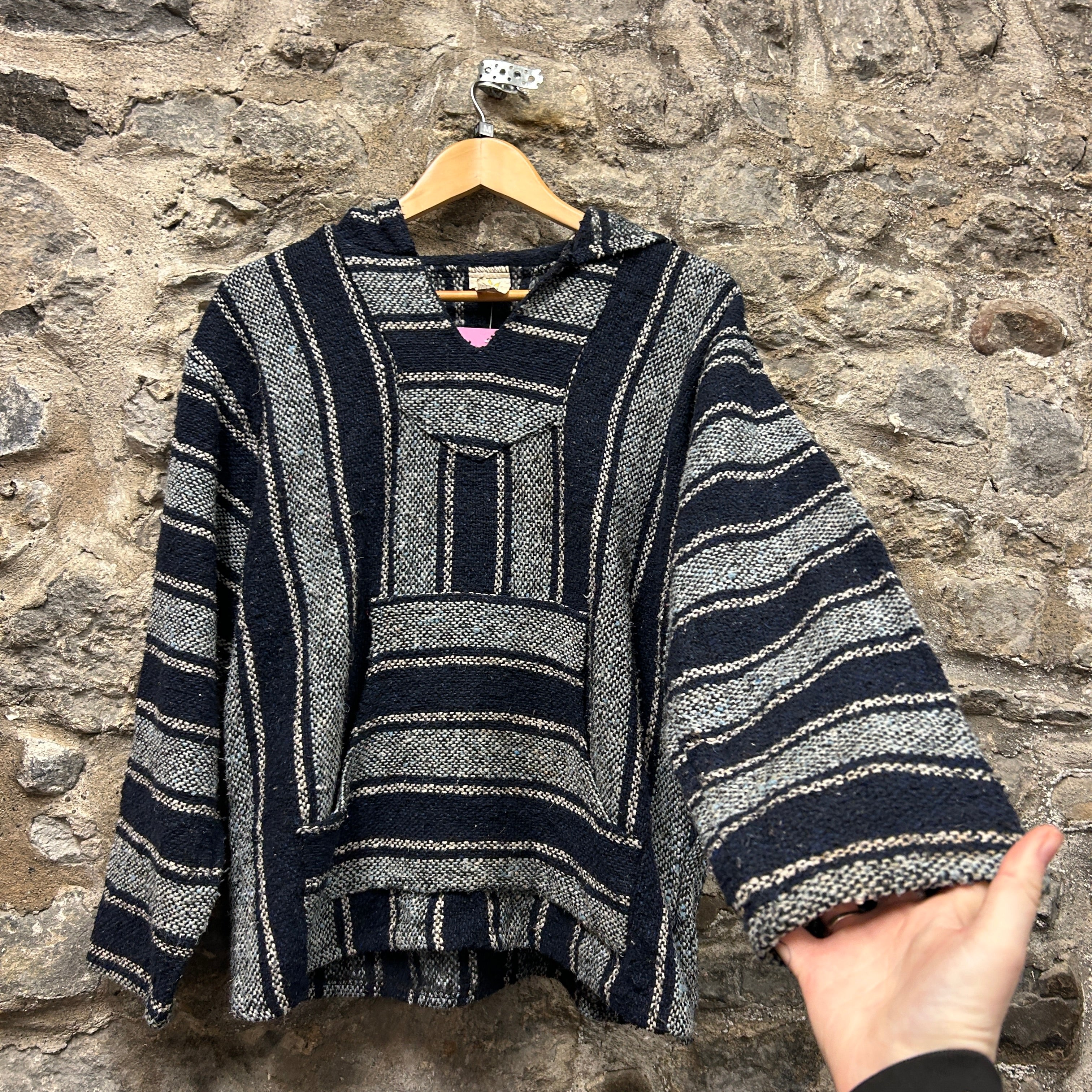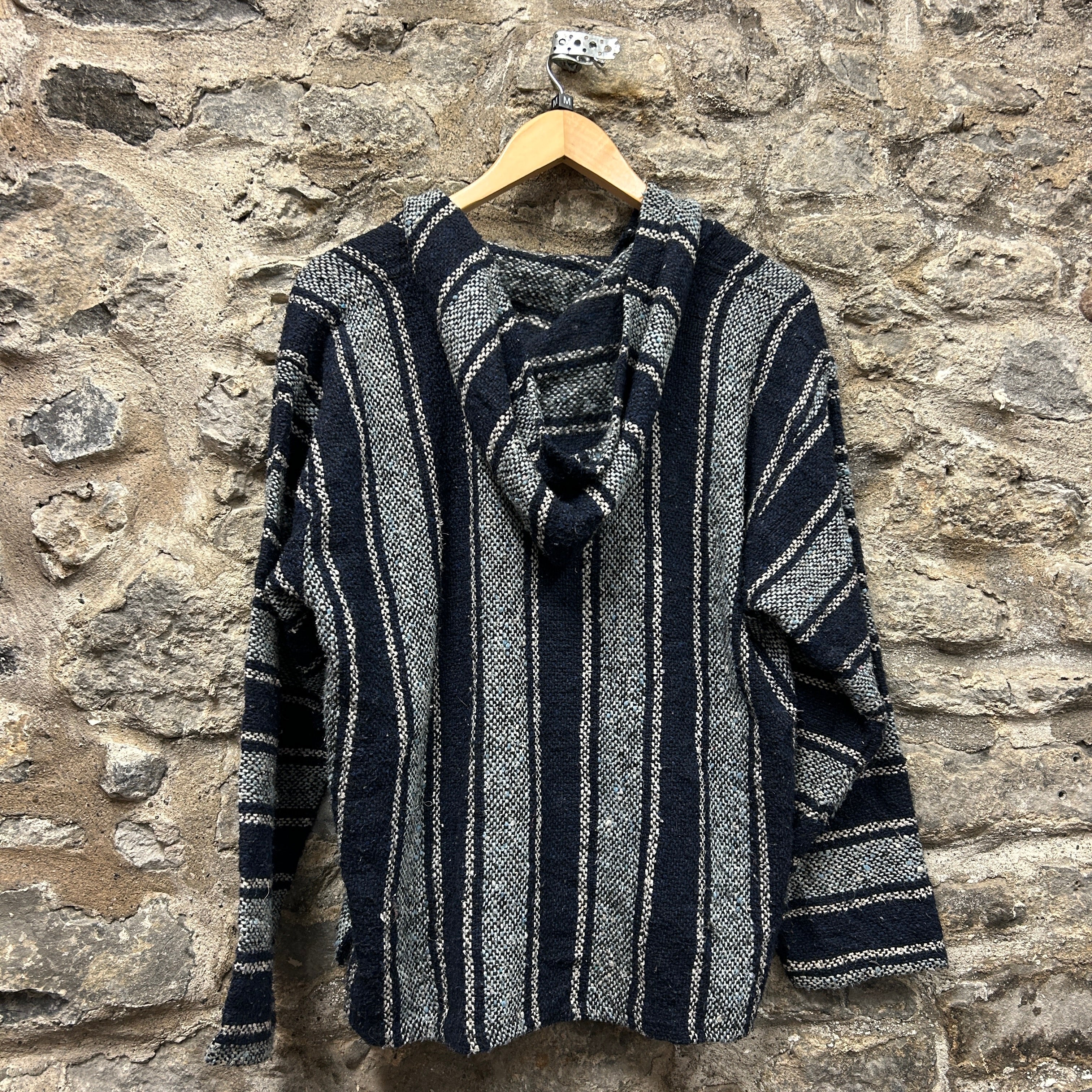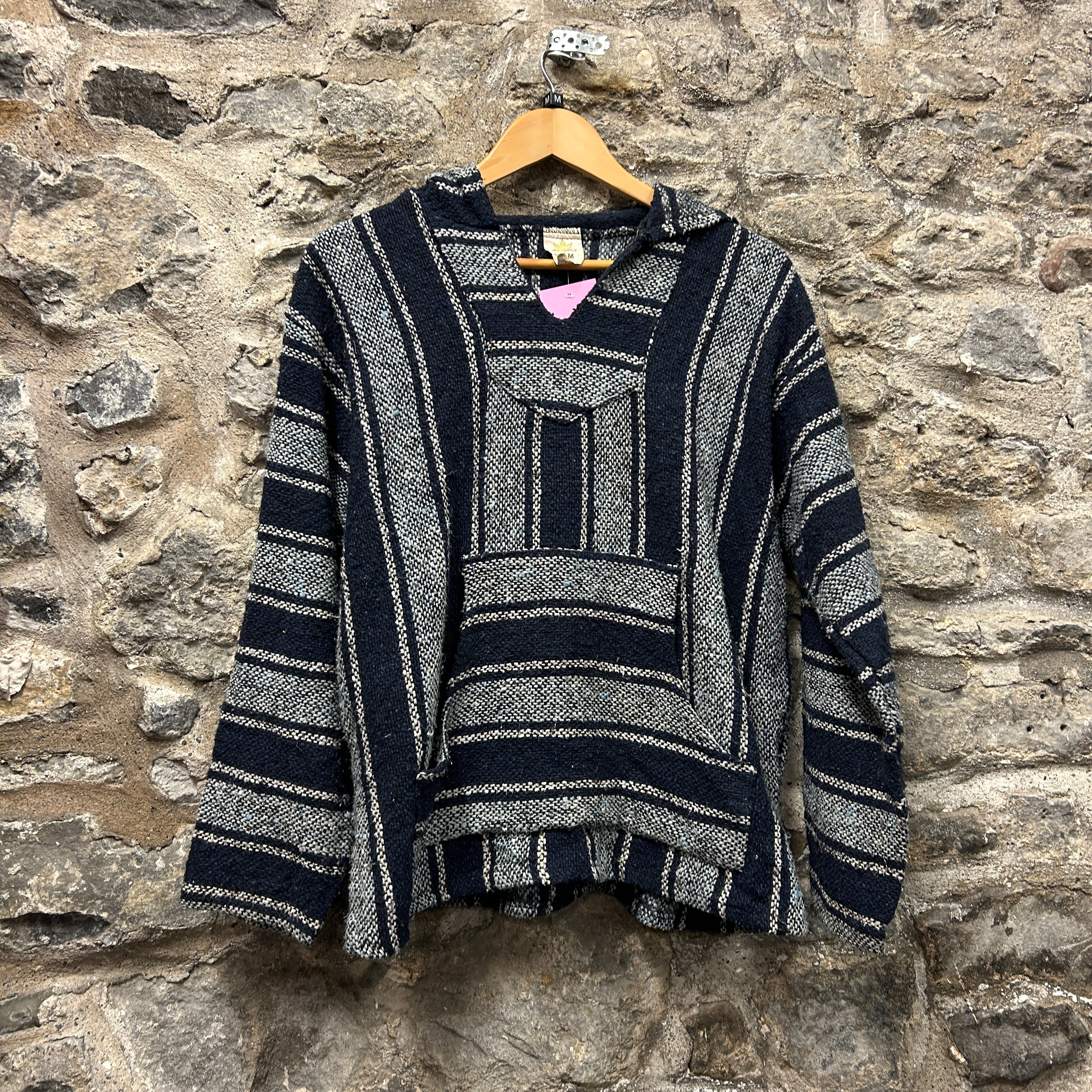 Product details: Woven striped Baja/jerga hoodie in navy and heather grey with cream pinstripes; classic V-notch neckline, attached hood, and front kangaroo pocket. Relaxed boxy fit with slightly frayed hem edge typical of woven Baja styles. Brand: Sunspecs.| Label Size | |