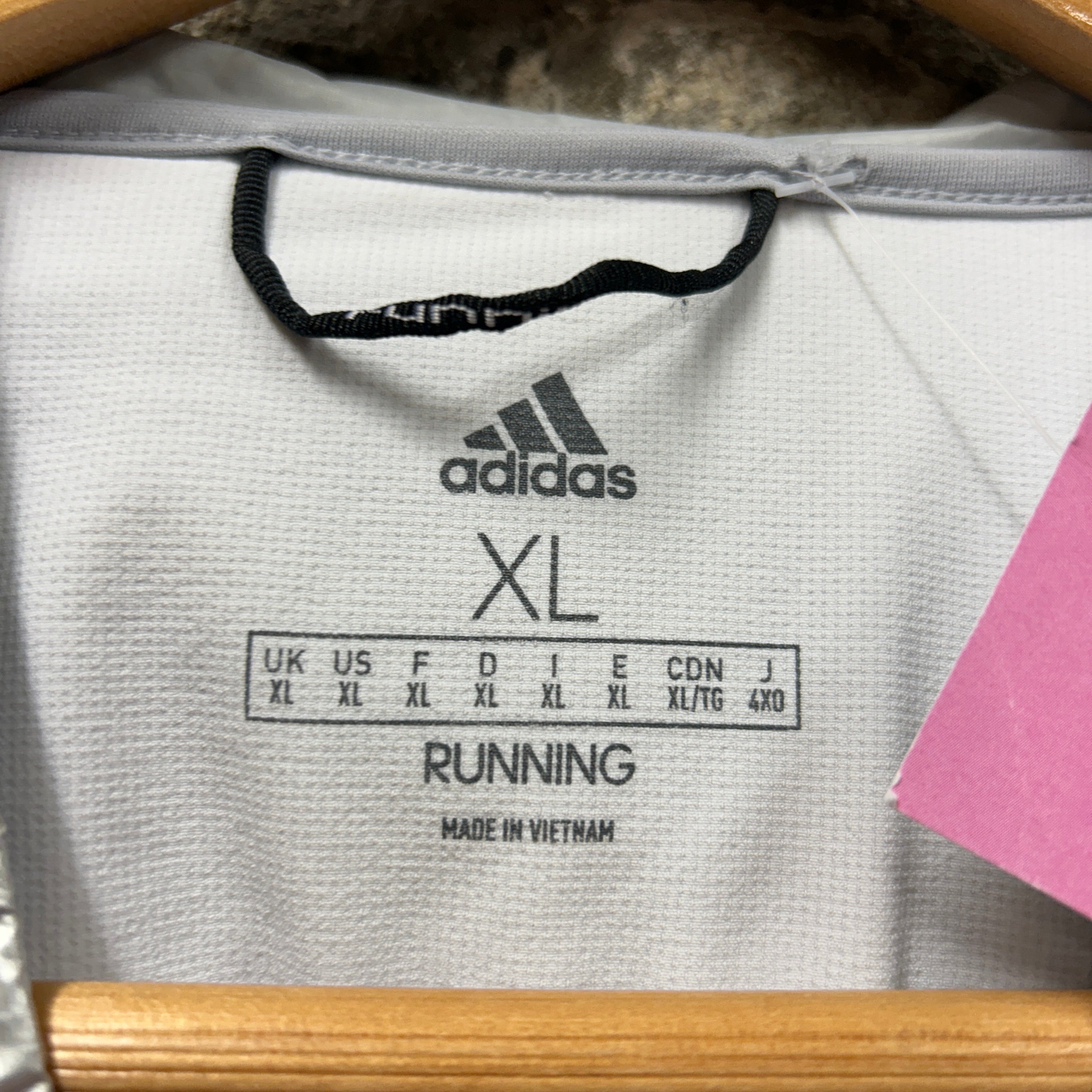 Product details: Adidas metallic silver hooded windbreaker with grey/white paneling and bright blue piping; full-zip front, zip hand pockets, elastic cuffs/hem. NASA mission-style patches on chest (NASA “meatball” and triangular space/astronaut graphic). Mesh-lined interior; size XL; style code shown on tag: CK8816 / ATV001. Brand: Adidas.| Label Size | |