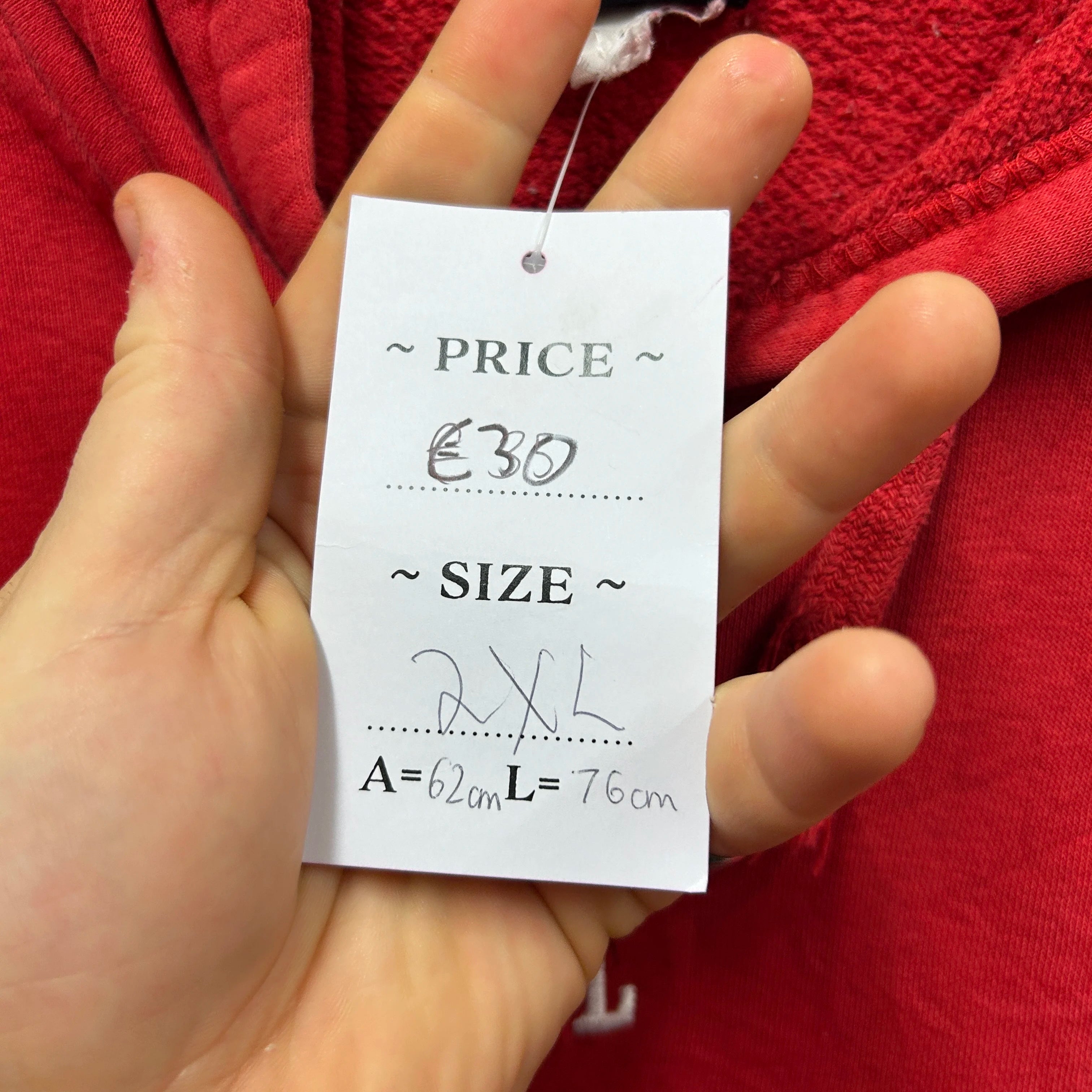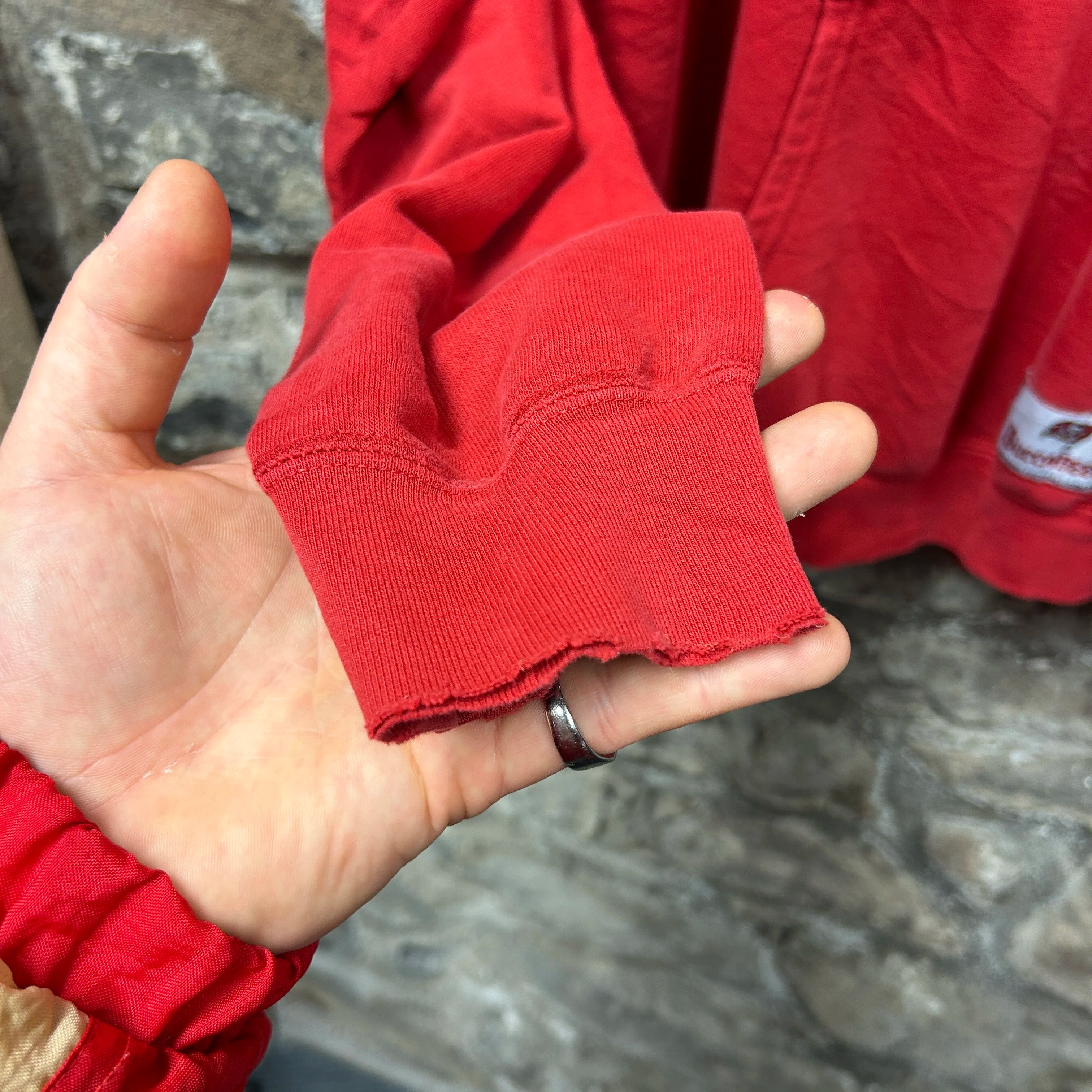 Product details: Red pullover hoodie with embroidered Buccaneers NFL logo on chest, pouch pocket, visible wear/distressing on cuffs and hem, NFL Team Apparel branding, oversized 2XL fit. Fabric appears to be classic sweatshirt cotton blend. Brand: Nfl Team Apparel.| Label Size | |