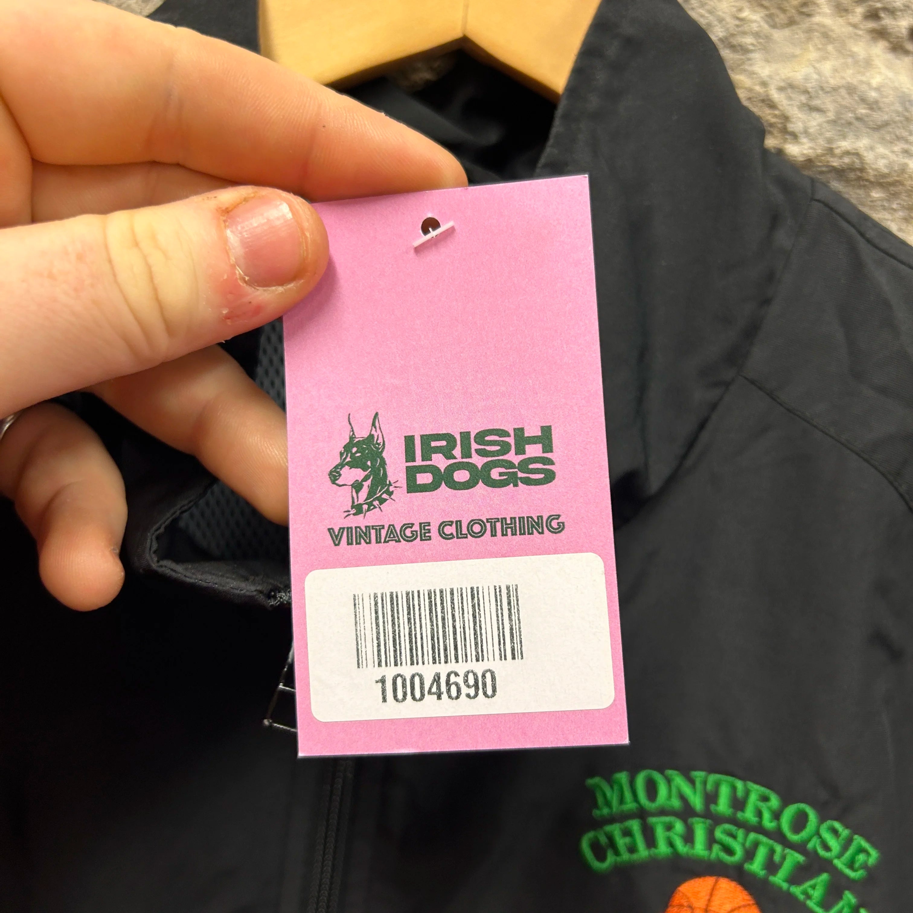 Product details: Embroidered Montrose Christian Lady Mustangs logo, white panel detailing, full zip front, elastic cuffs, Nike Swoosh logo, reflective back stripe, zippered pockets, mesh lining at collar. Brand: Nike.| Label Size | |