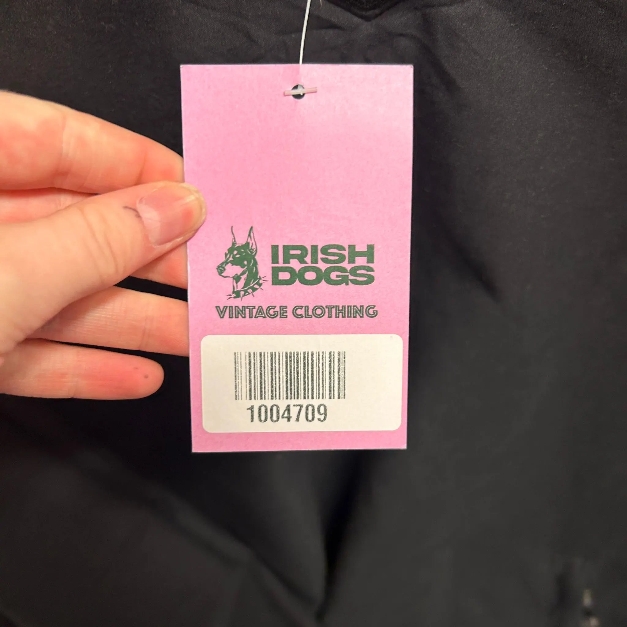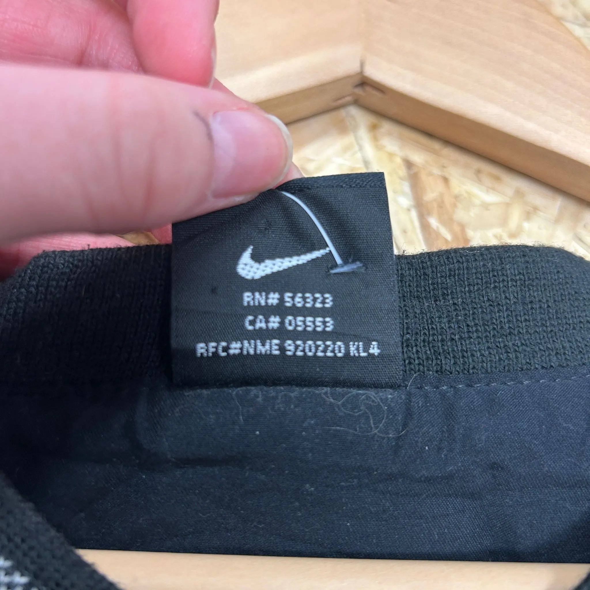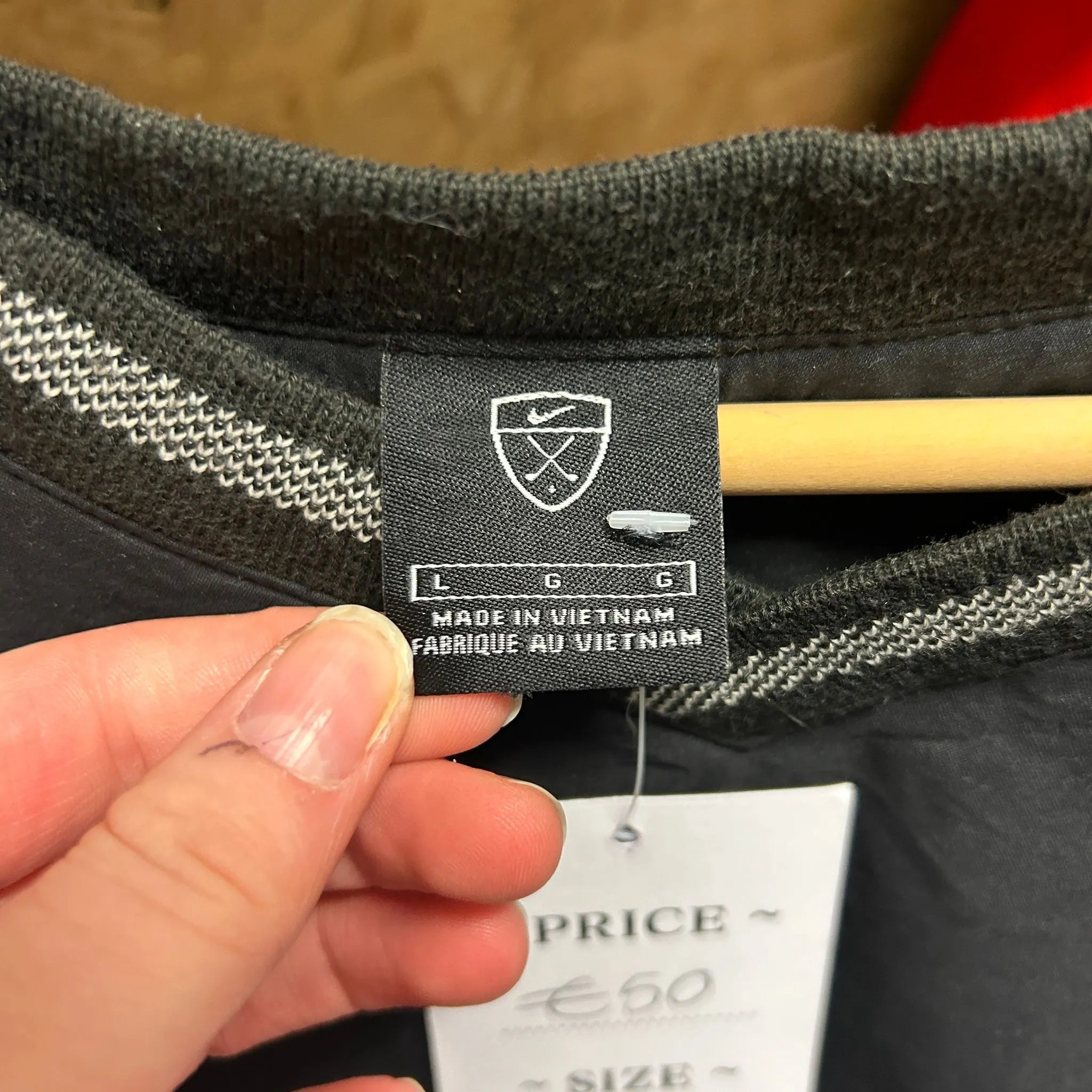Product details: Black, lightweight fabric, V-neck, ribbed cuffs and hem, two zippered front pockets, white Nike swoosh embroidered on sleeve, made in Vietnam, marked size Large. Brand: Nike.| Label Size | |