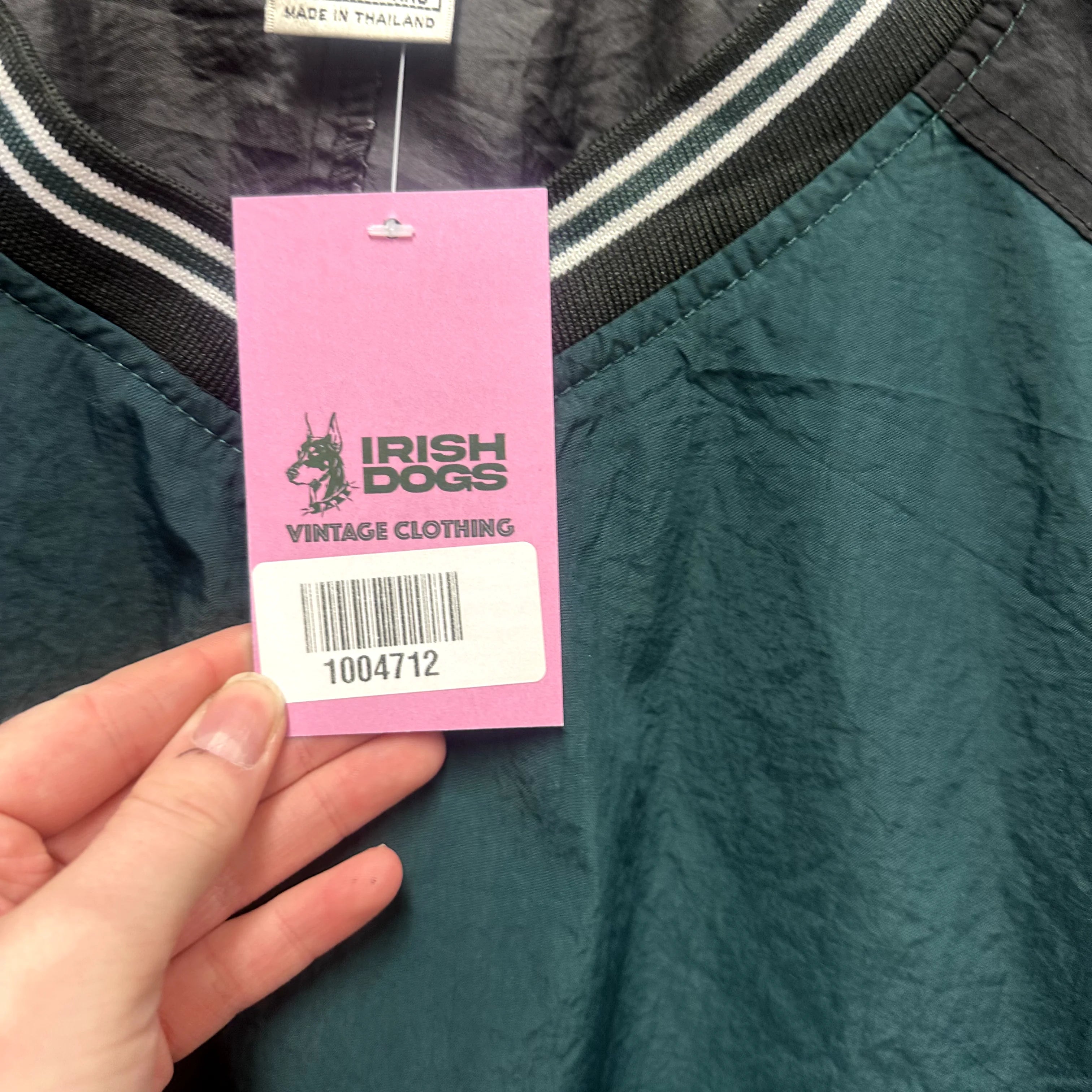 Product details: Raglan black sleeves, green torso, ribbed collar/cuffs/hem with stripes, classic Nike swoosh logo on chest, lightweight windbreaker nylon shell, 1990s Nike tag, XXL size. Brand: Nike.| Label Size | |