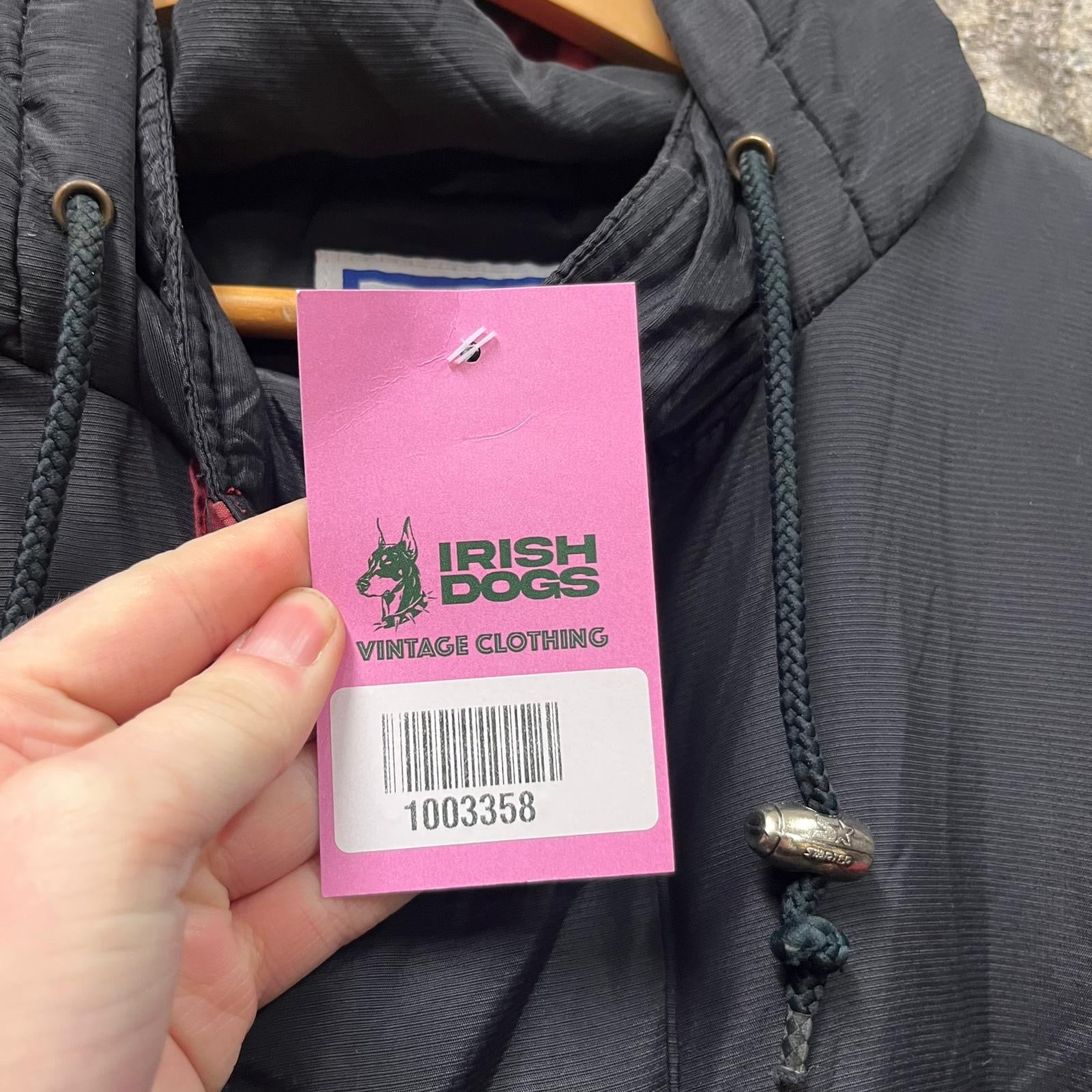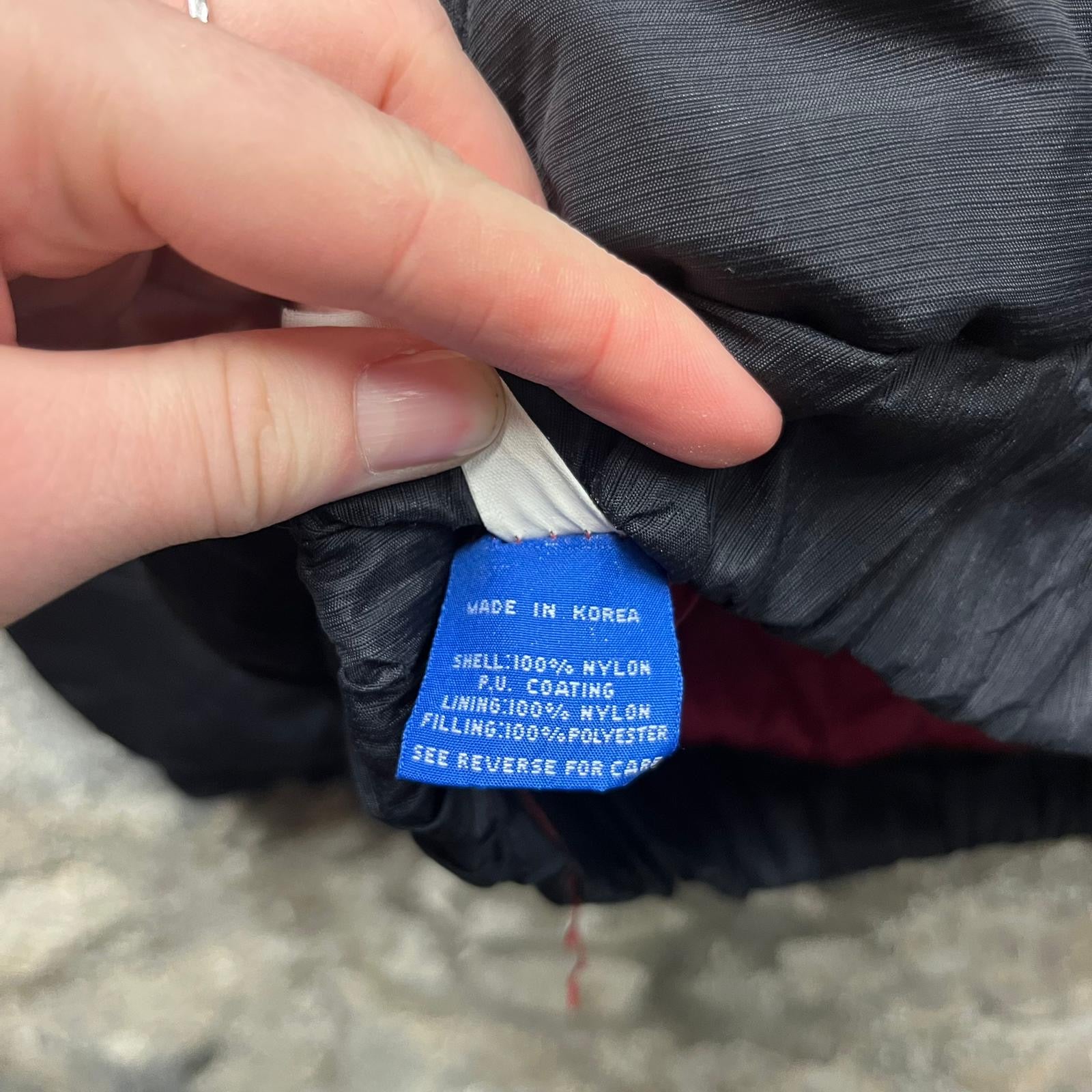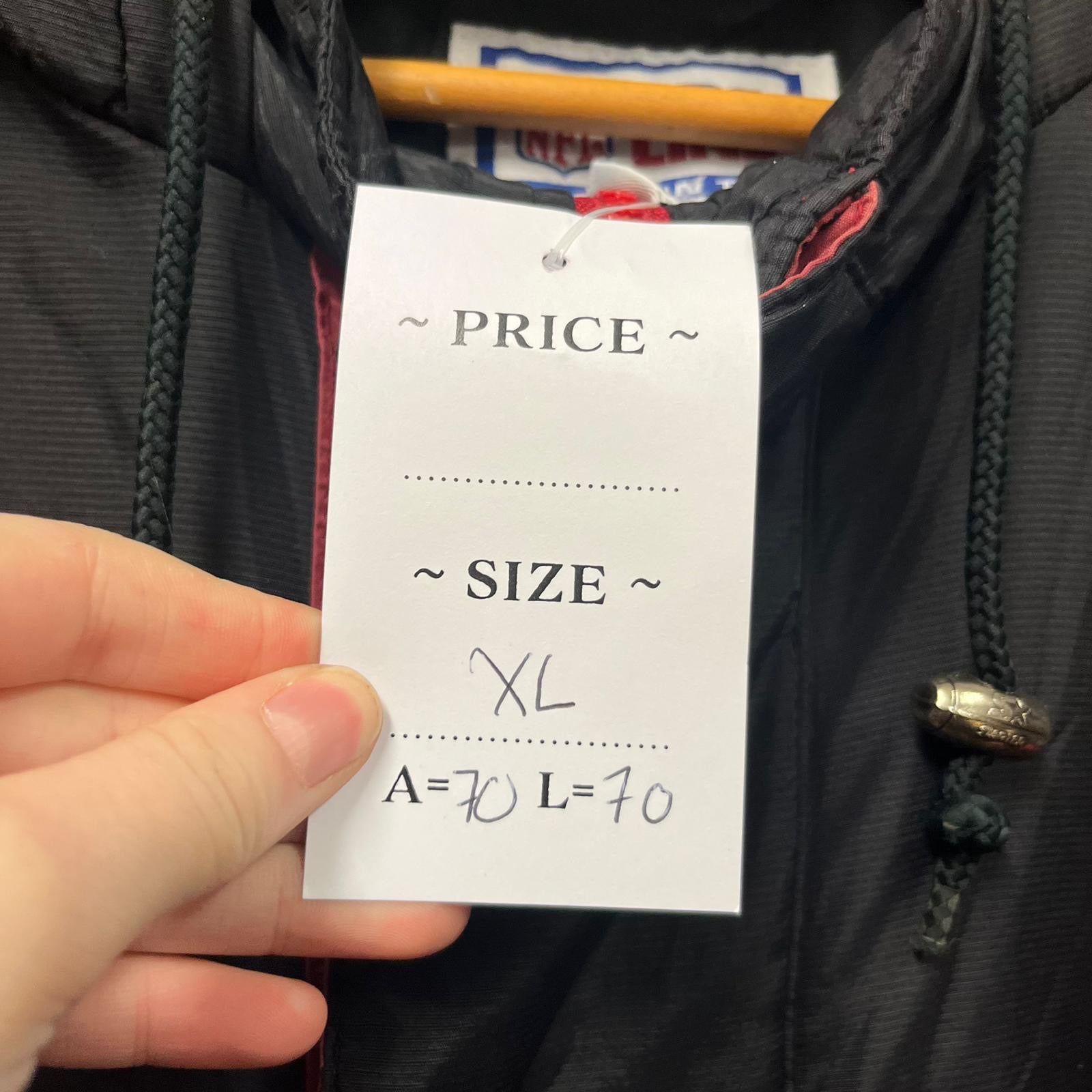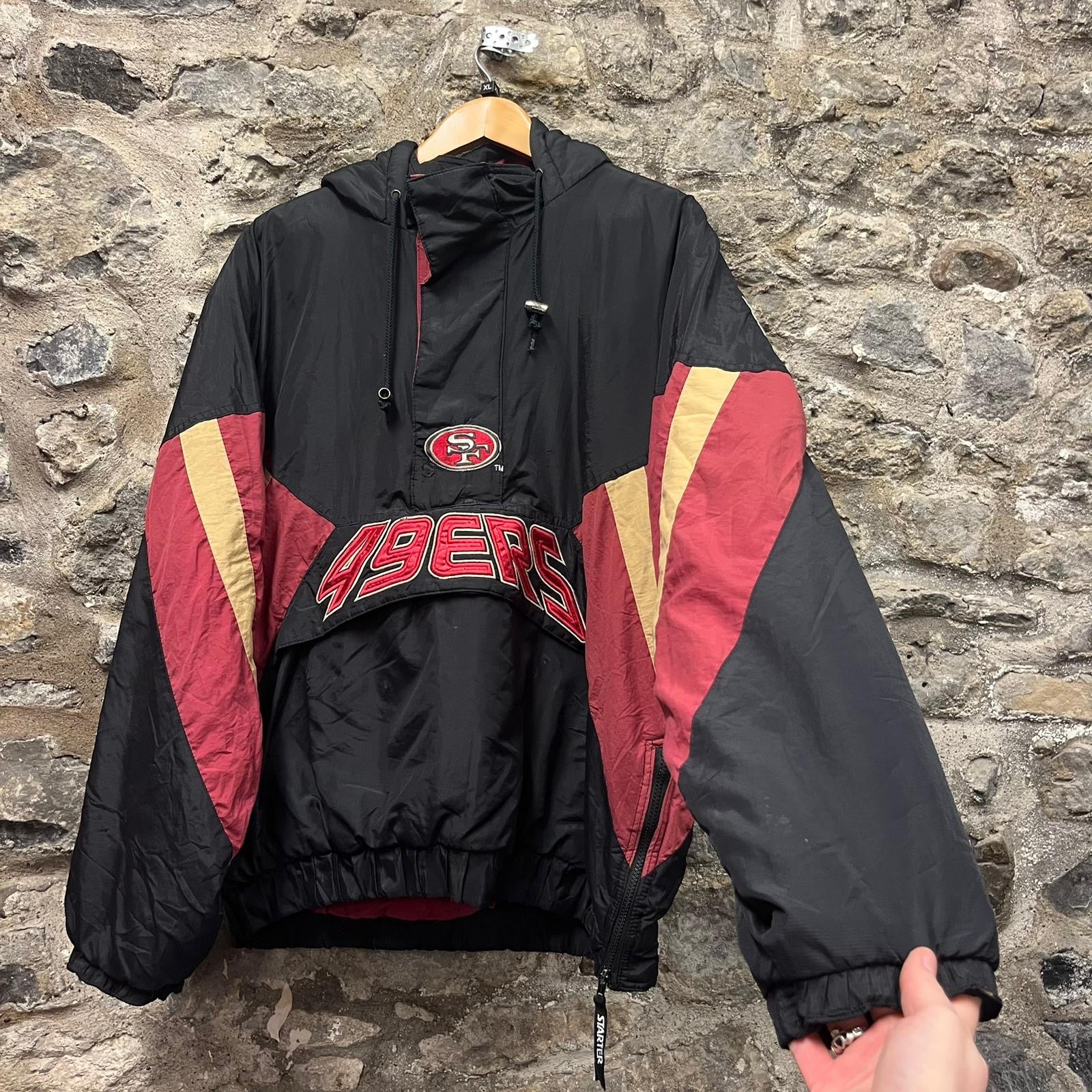 Product details: Vintage NFL Pro Line pullover hooded puffer-style jacket by Starter in black with red and gold color-block sleeves. Features large embroidered/appliqué ‘49ERS’ front wordmark with SF oval patch above, oversized SF oval back patch, NFL shield ‘Pro Line’ sleeve patch, and Starter logo embroidery at cuff/hood. Half-zip neckline with drawcord hood, elastic cuffs/hem, and nylon shell with PU coating; padded with polyester fill. Brand: Starter.| Label Size | |