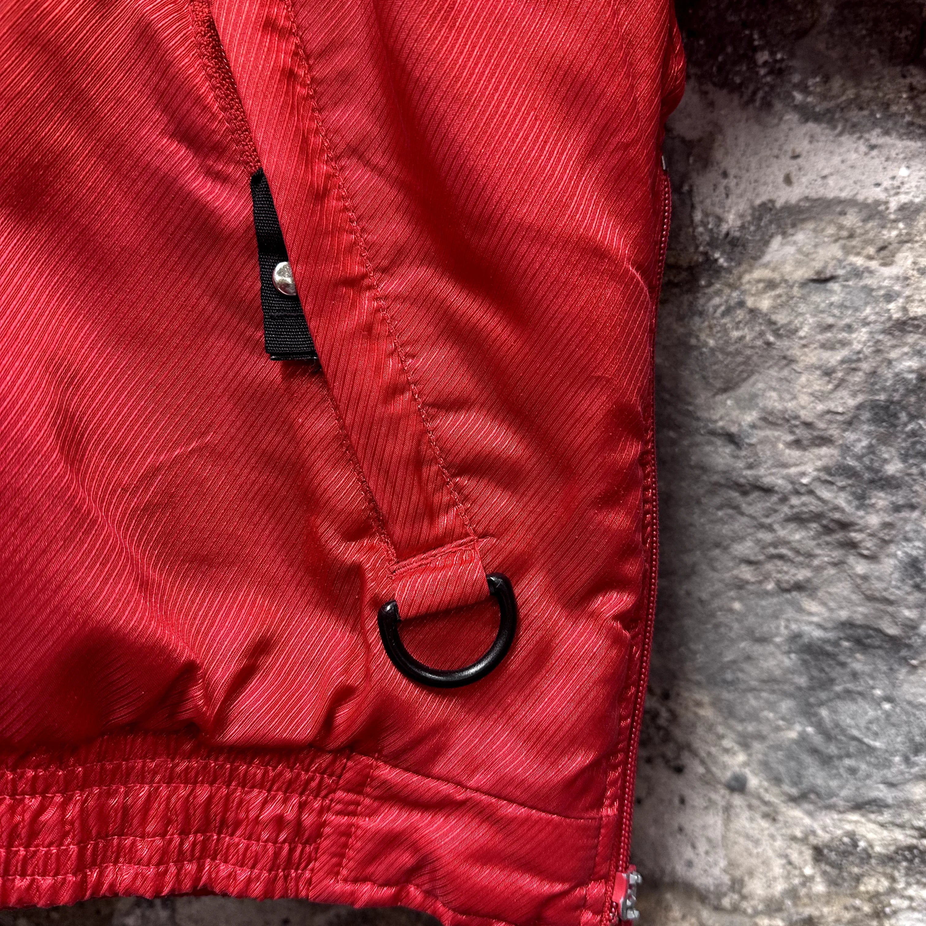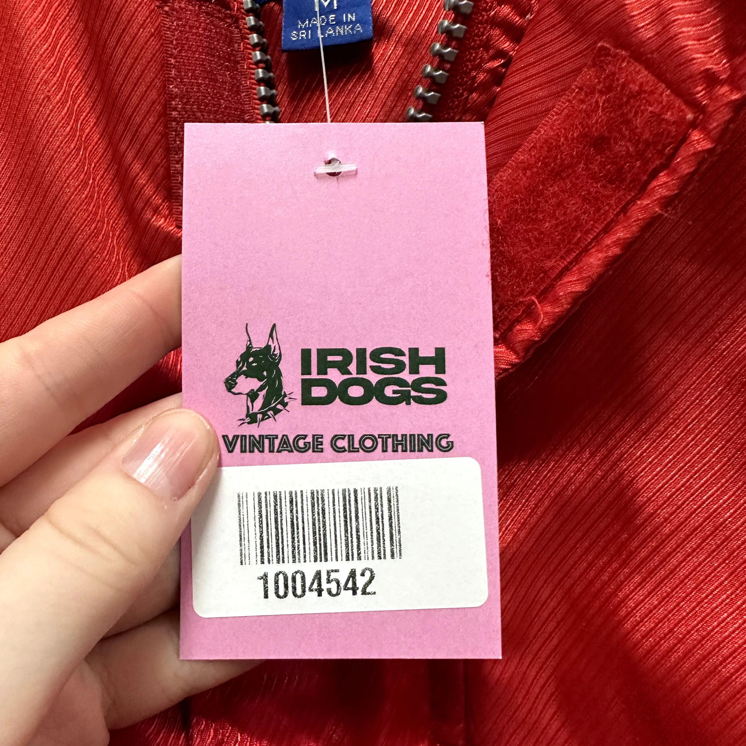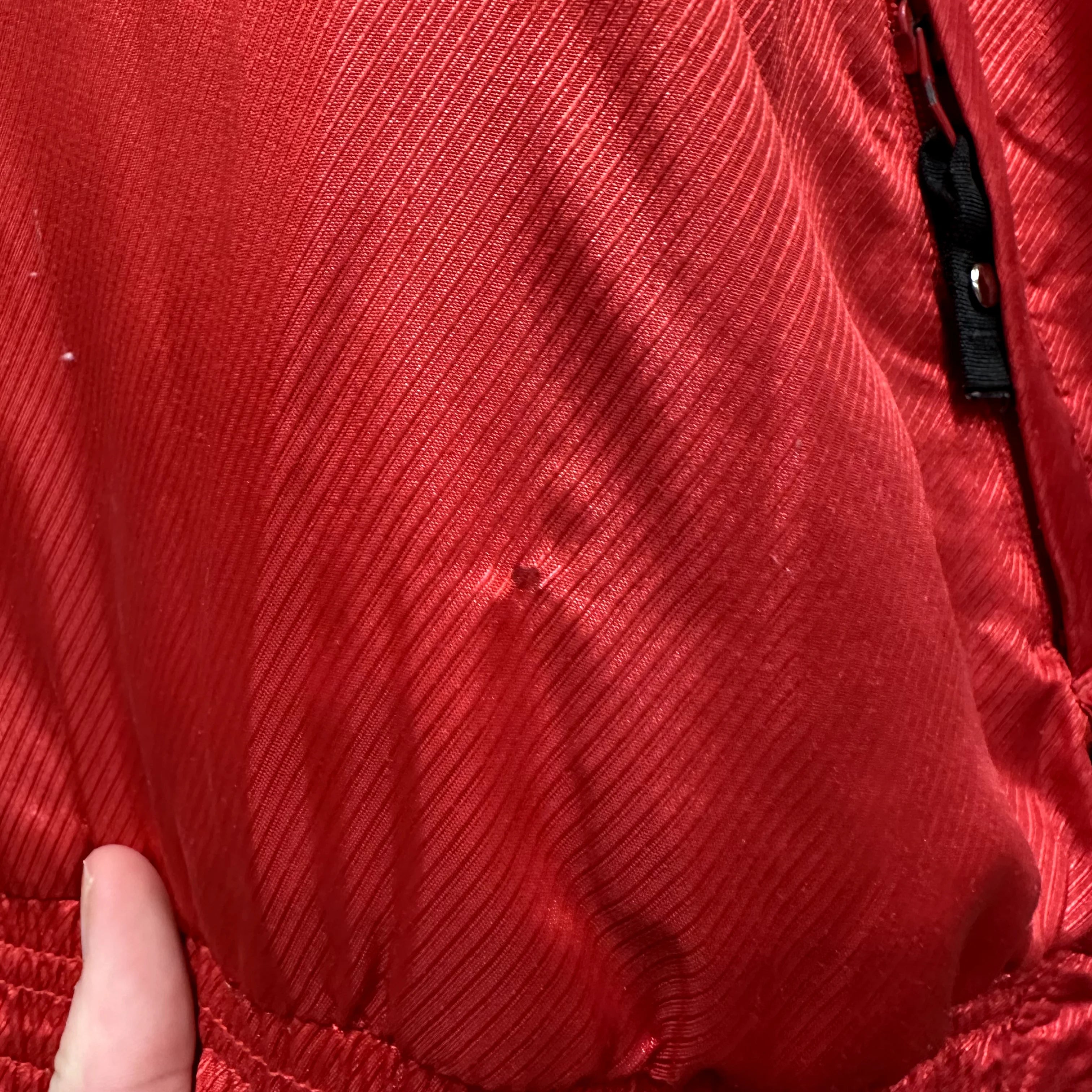 Product details: Red with grey color block sleeves, Starter logo embroidery, large stitched Ohio State chest and back logo, front zip with custom Starter pull, elasticized waistband and cuffs, kangaroo pocket, D-ring detail, collegiate style, visible vintage wear. Brand: Starter.| Label Size | |