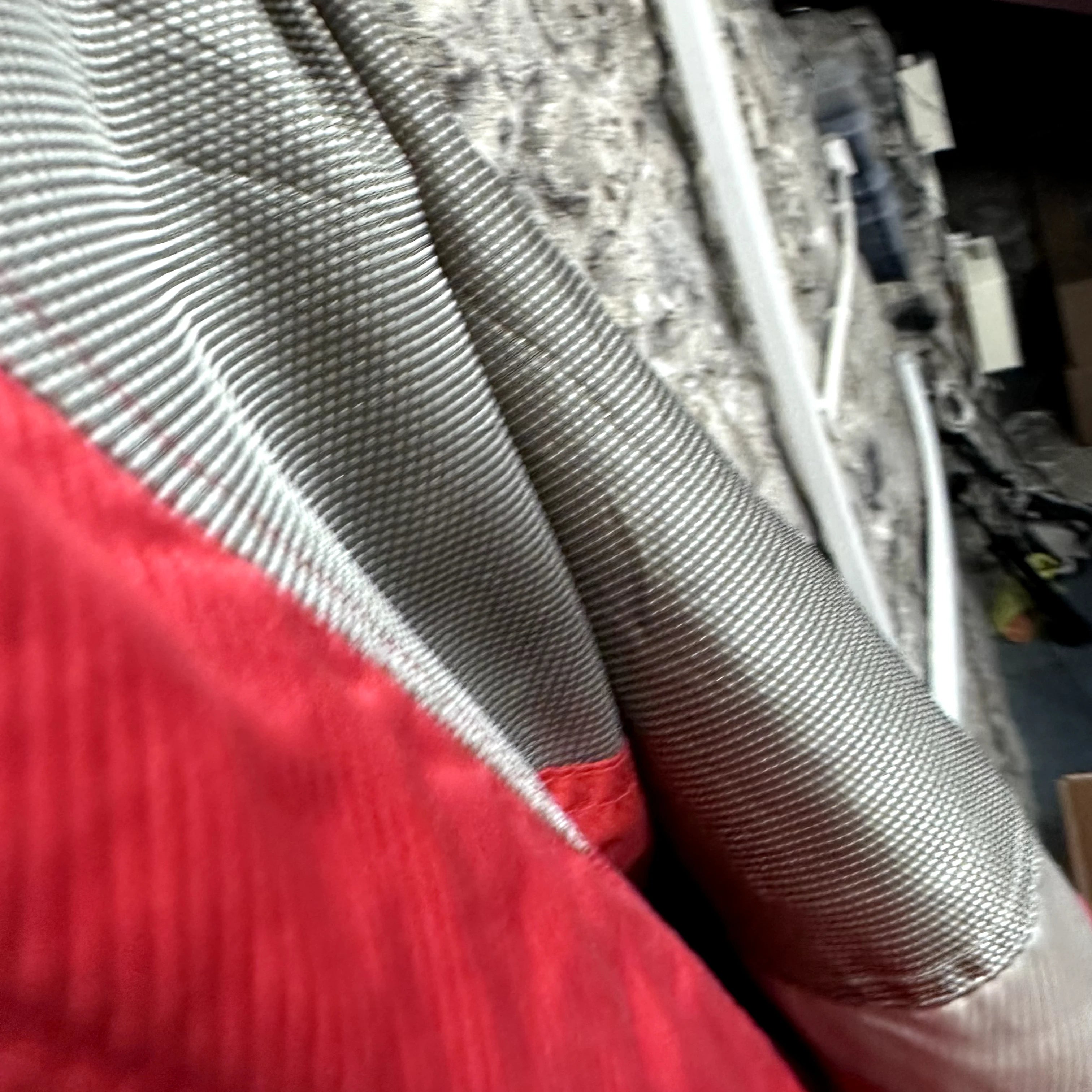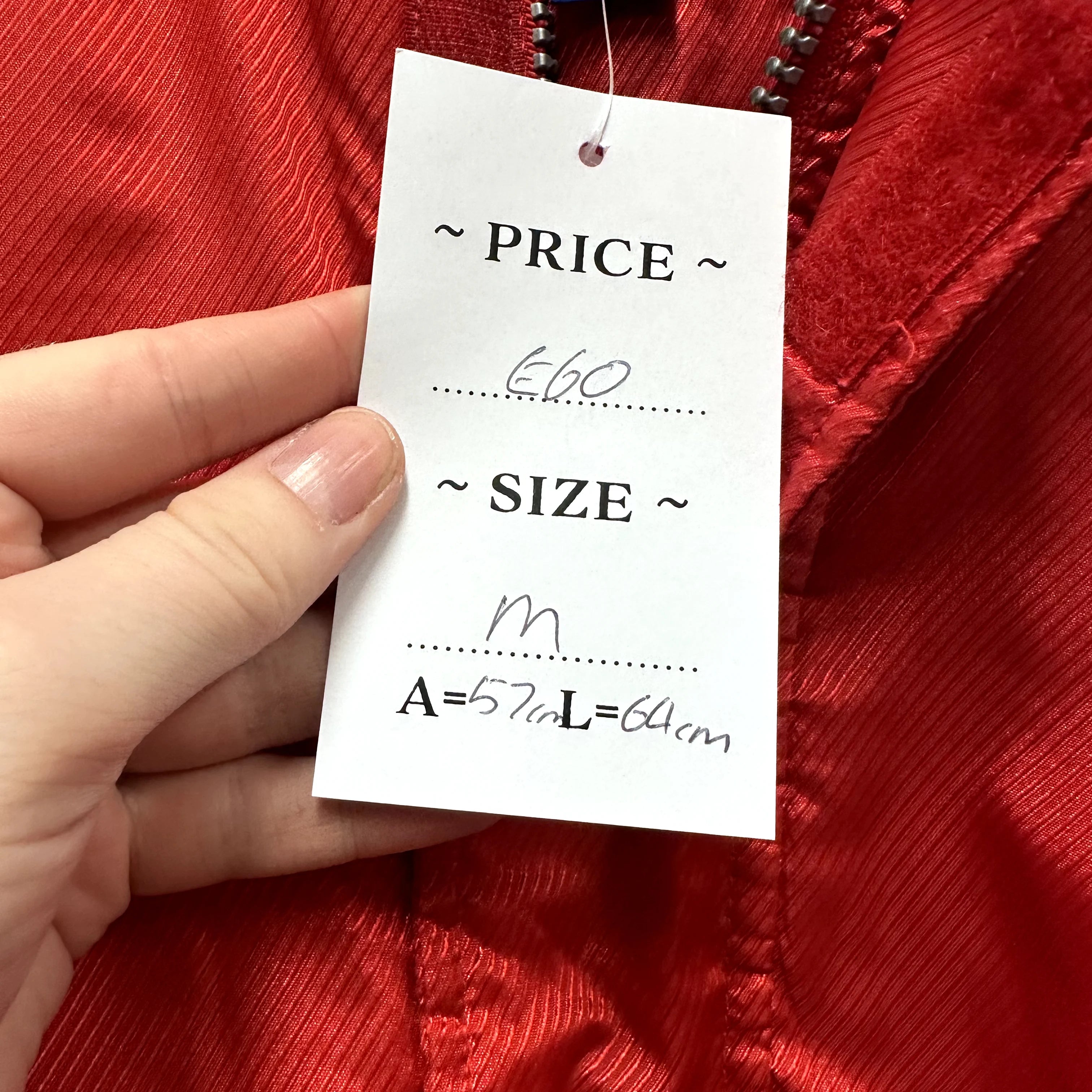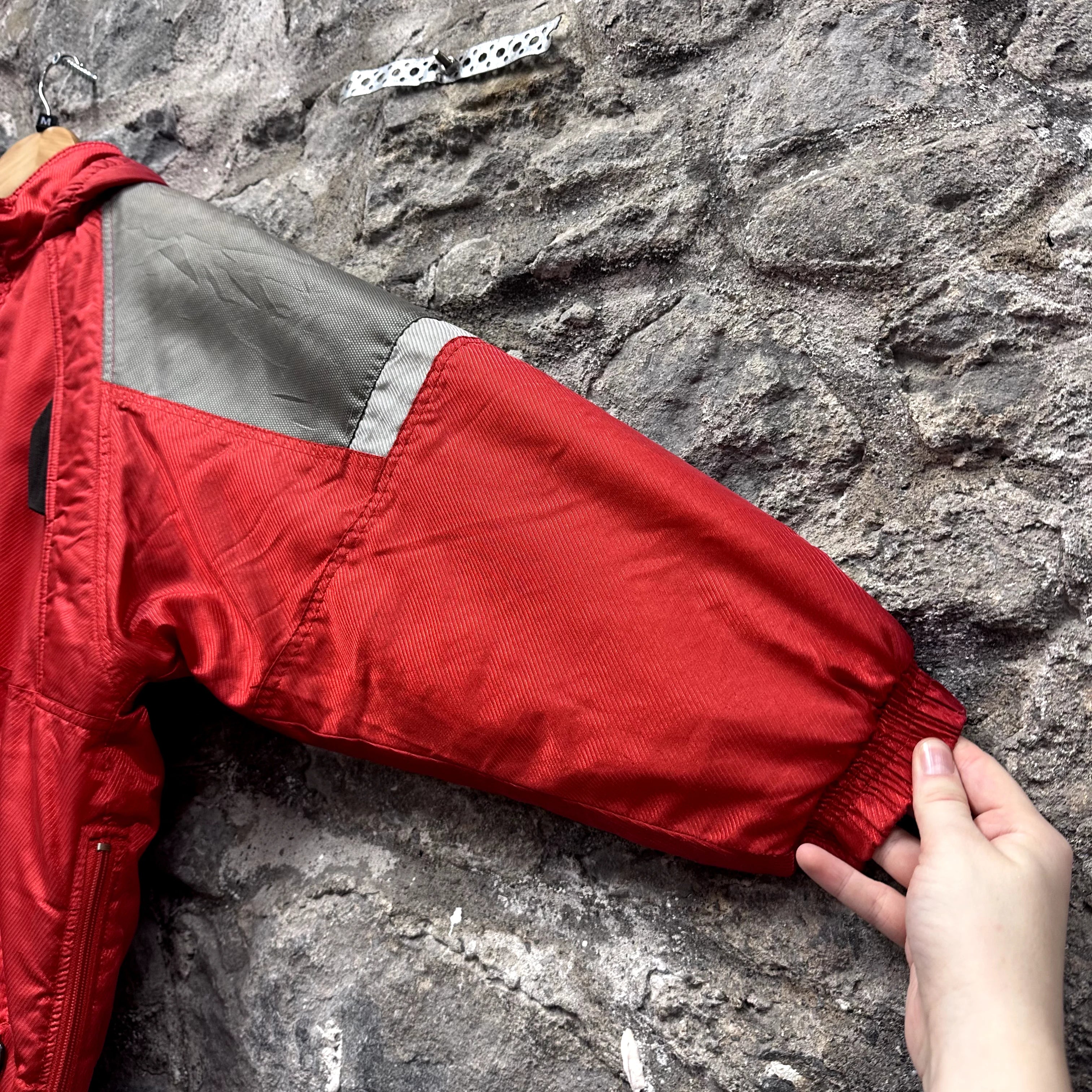 Product details: Red with grey color block sleeves, Starter logo embroidery, large stitched Ohio State chest and back logo, front zip with custom Starter pull, elasticized waistband and cuffs, kangaroo pocket, D-ring detail, collegiate style, visible vintage wear. Brand: Starter.| Label Size | |
