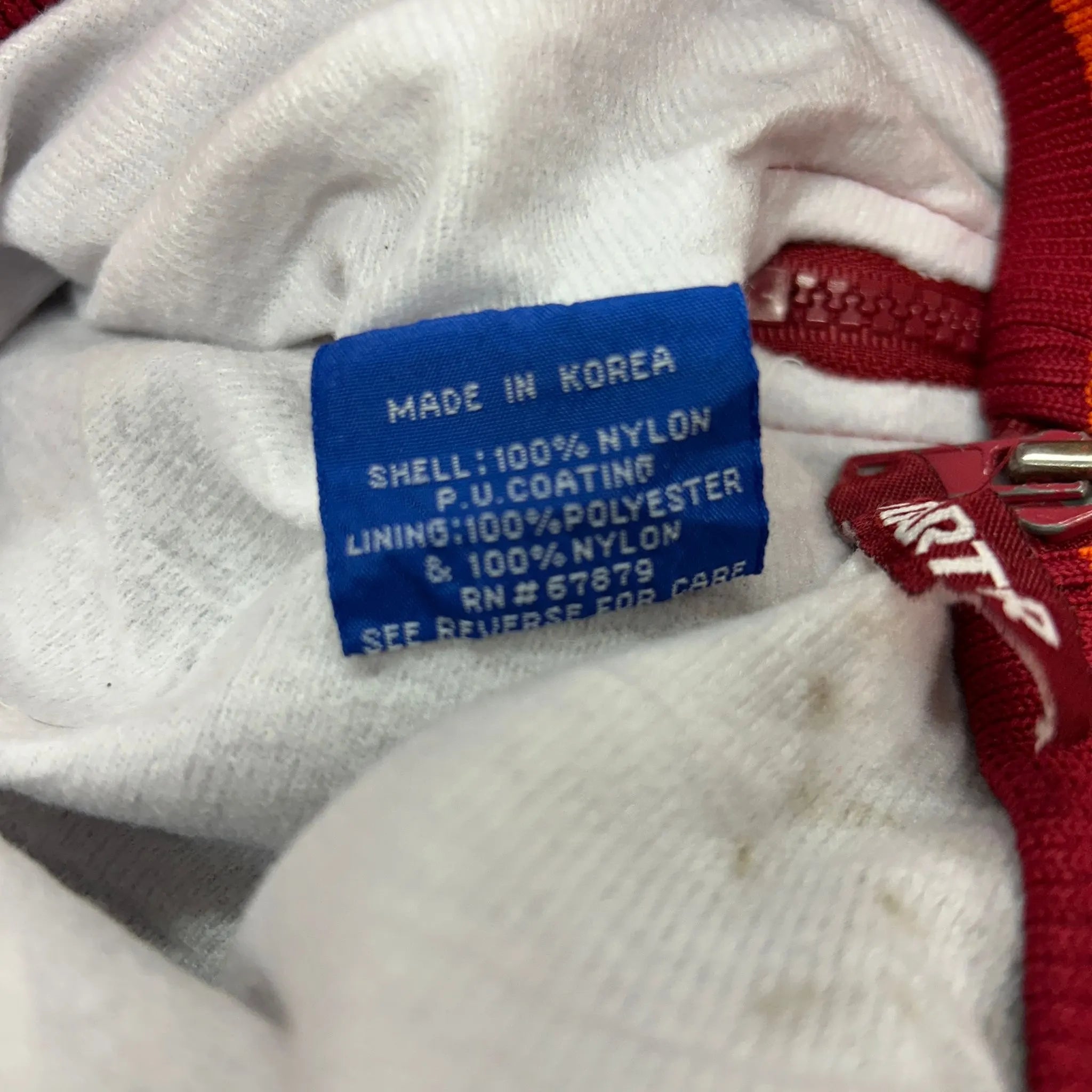 Product details: Pullover windbreaker, Virginia Tech large front embroidery, ribbed collar/cuffs/hem with stripes, Starter brand logo on back and sleeve, side zip vent, zip pocket, made in Korea, 100% nylon shell with PU coating and polyester lining. Brand: Starter.| Label Size | |