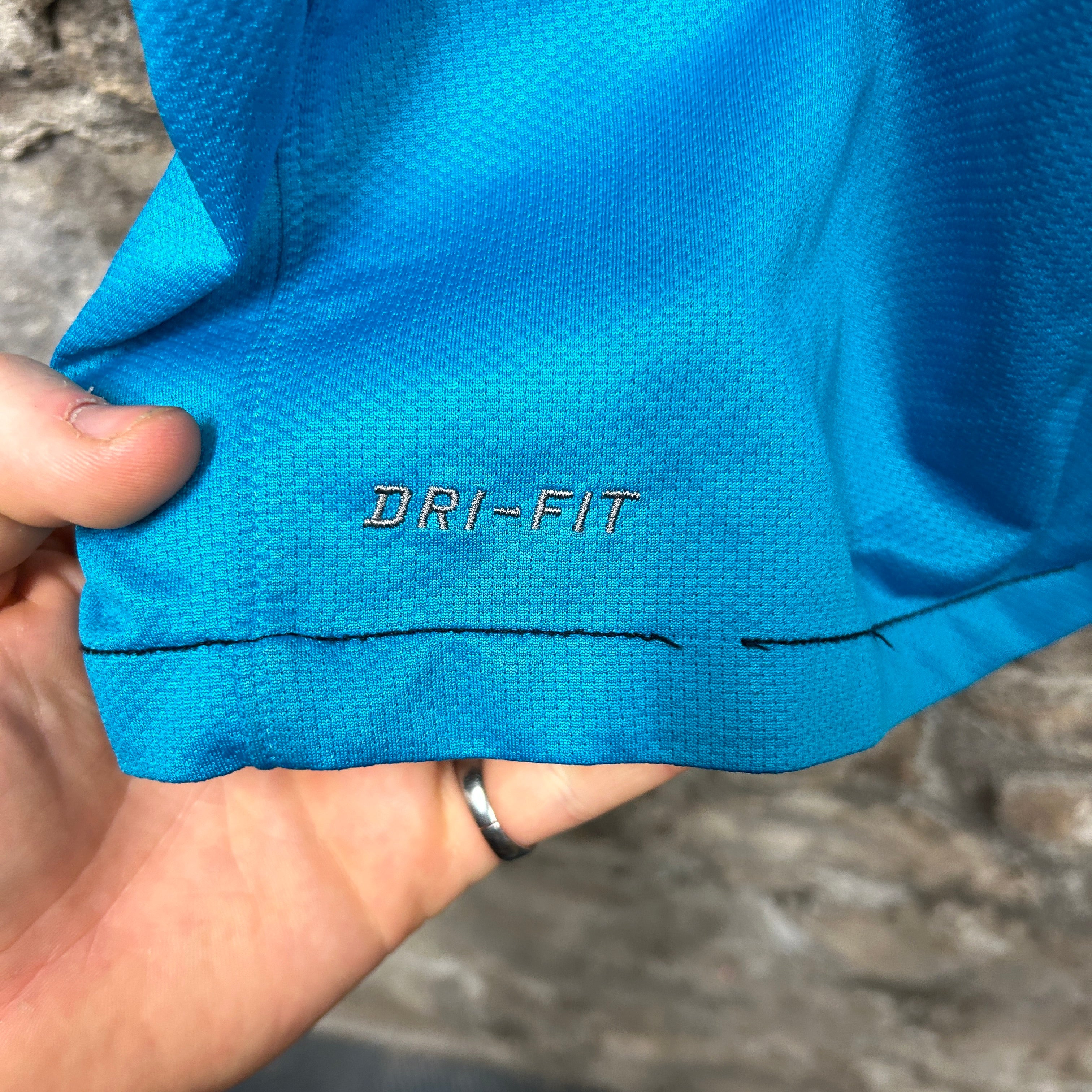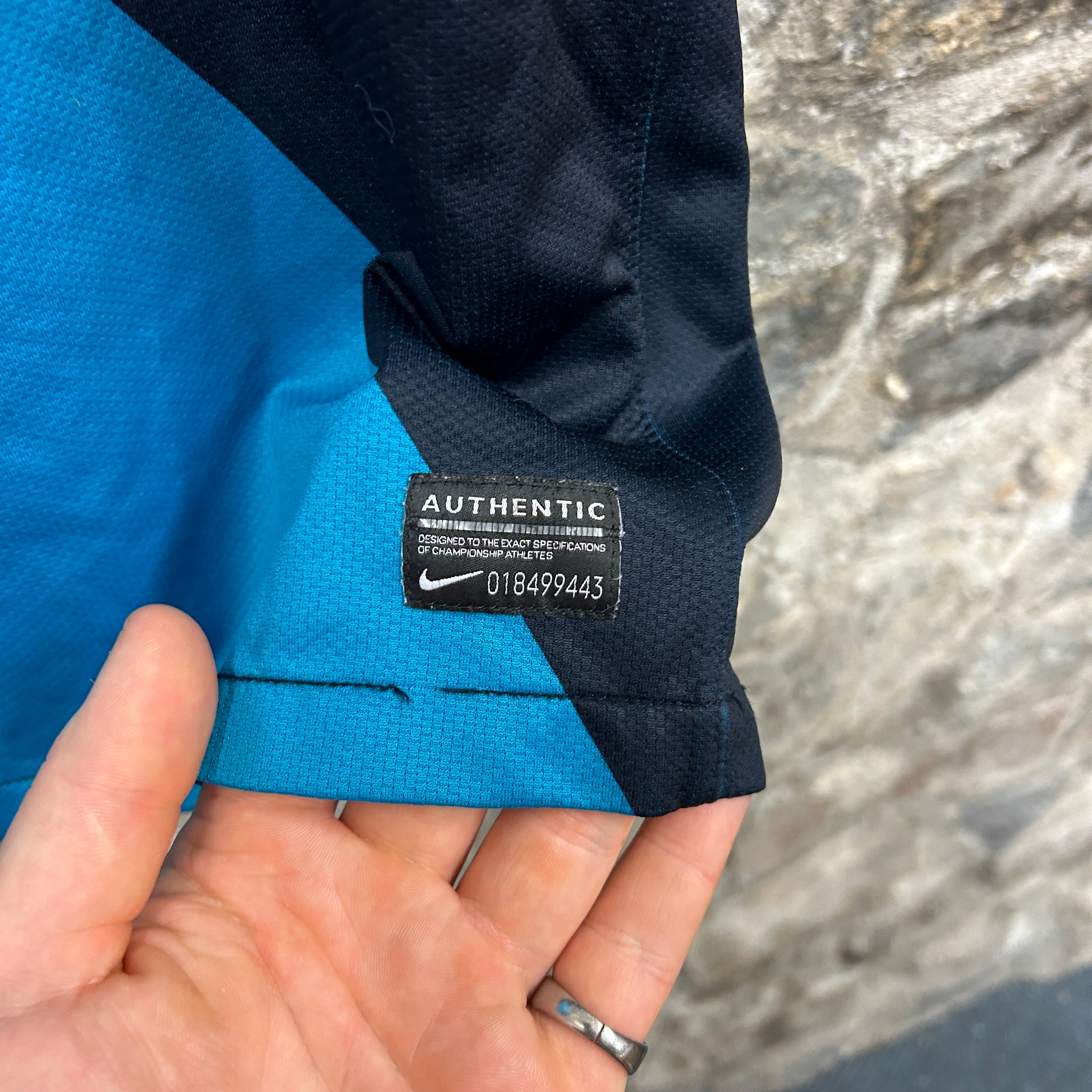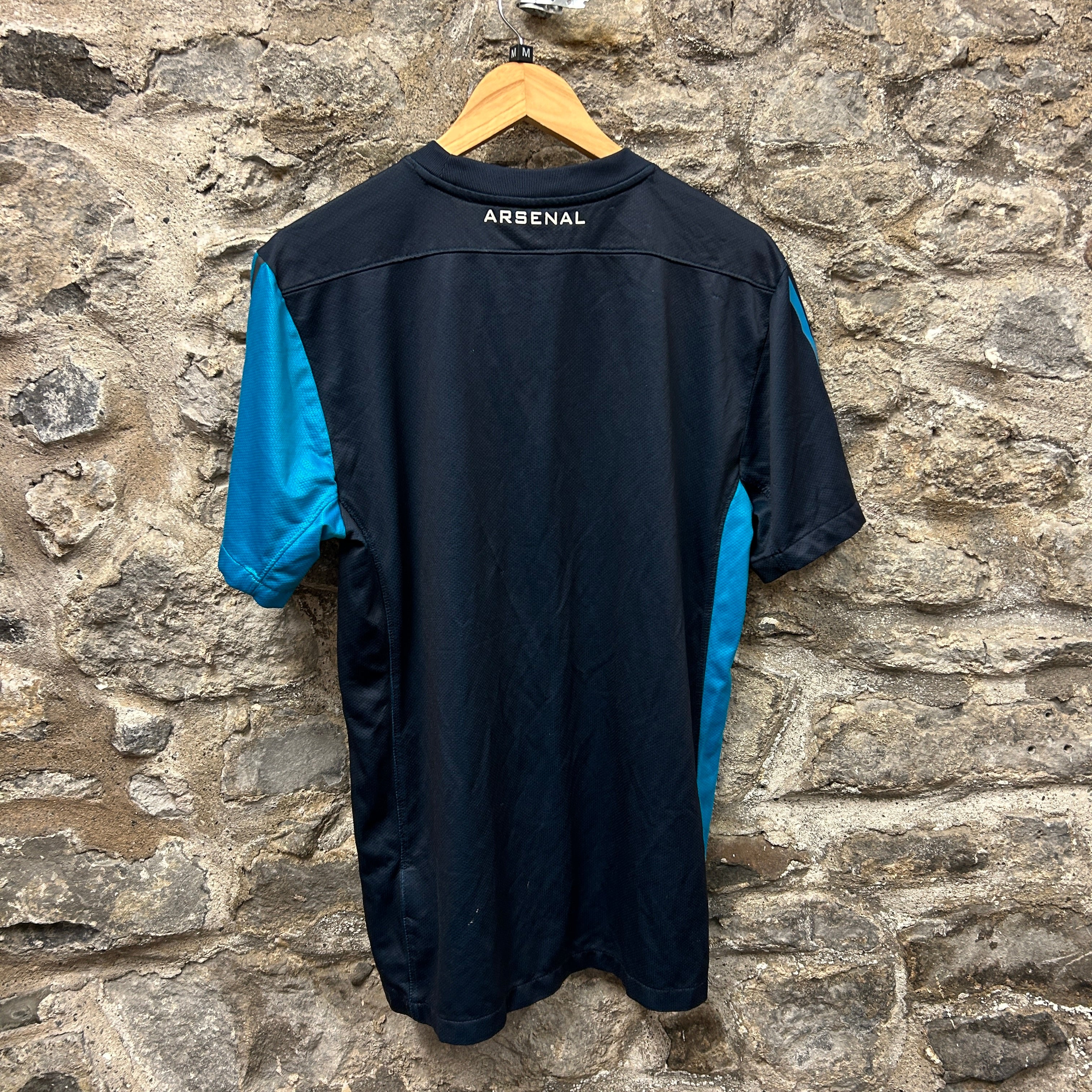 Product details: Nike Arsenal training/football top in navy with bright blue geometric side panels and sleeve accents. Features white Nike Swoosh, large 'Fly Emirates' sponsor print, and Arsenal crest graphic with laurel detail on chest. Ribbed crewneck, lightweight breathable mesh (Dri-FIT) performance fabric. 'ARSENAL' text printed at back neck. 'AUTHENTIC' jock tag at hem and internal size/style label (M; codes visible: 423983-472 / FA110105NAC). Brand: Nike.