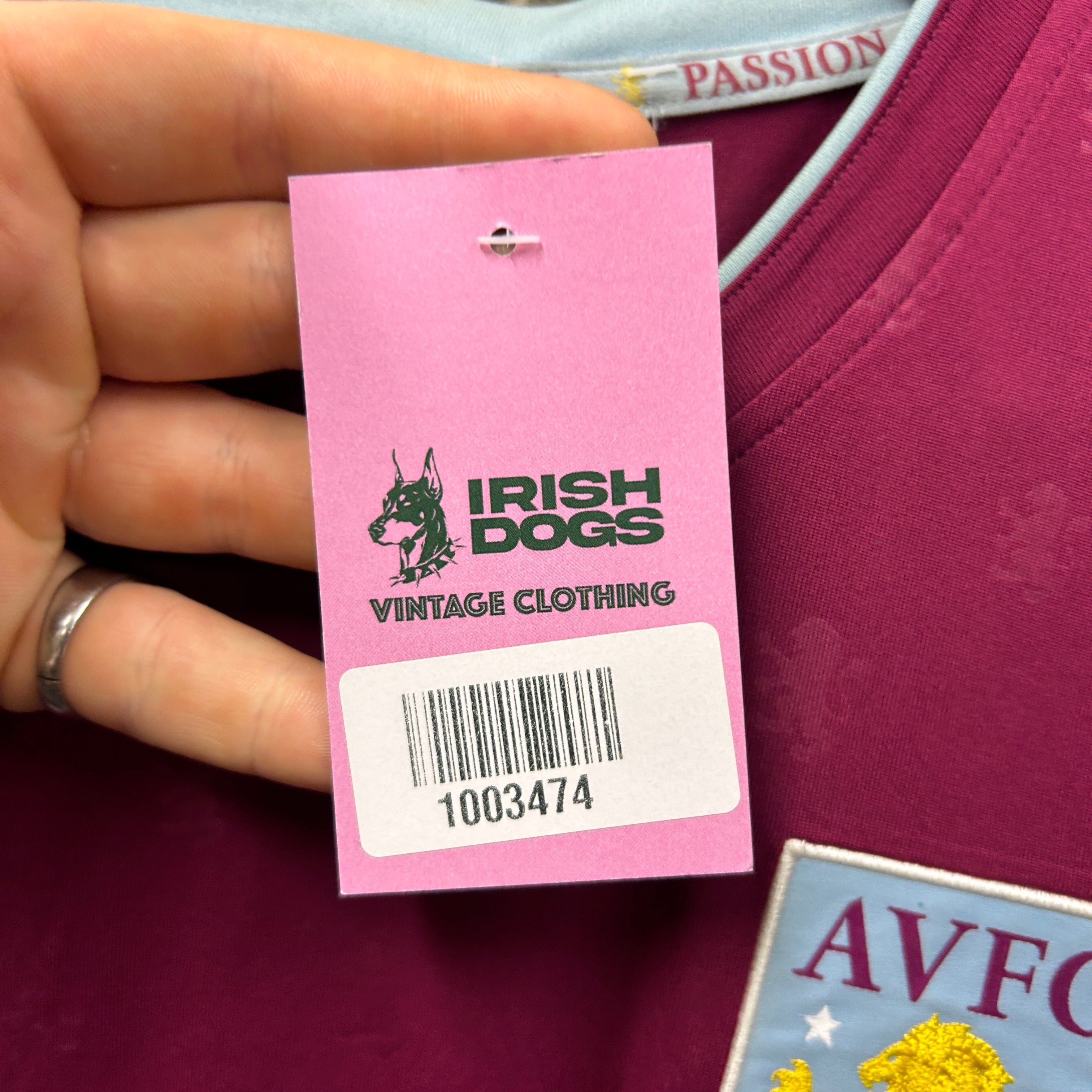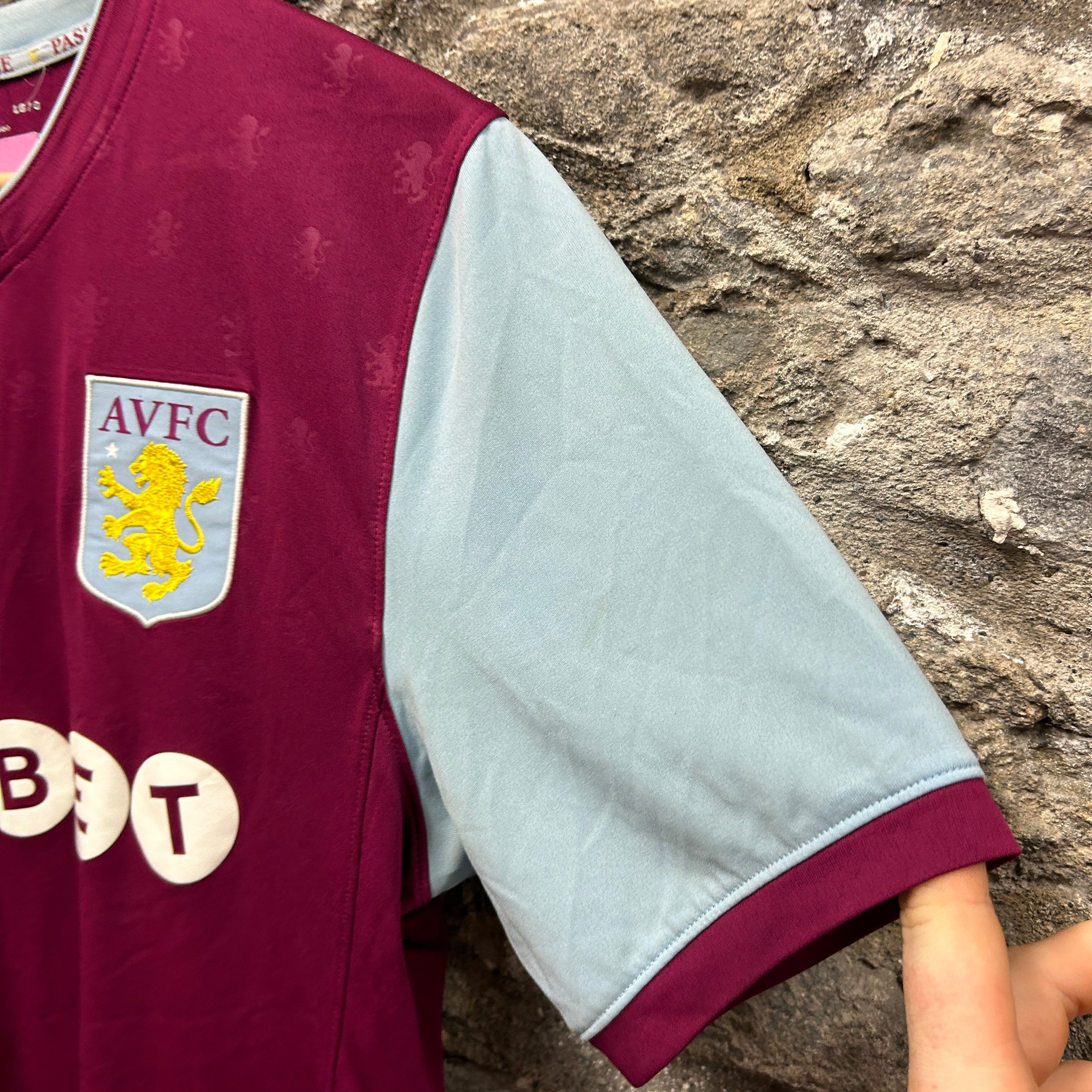 Product details: Aston Villa (AVFC) Under Armour football shirt in claret/purple with light blue sleeves and V-neck. Embroidered AVFC crest, embroidered Under Armour logo, and UNIBET sponsor print across chest. Subtle all-over tonal lion/jacquard pattern in the body, ribbed sleeve cuffs, and circular Under Armour ‘Universal Guarantee of Performance’ hem badge. Inner neck taping reads ‘PRIDE • PURPOSE • PASSION’ with small lion icons; back neck has a raised yellow lion emblem. Tag shows Style 1296013, SS 2017 (commonly worn 2017/2018 season). Brand: Under Armour.| Label Size | |